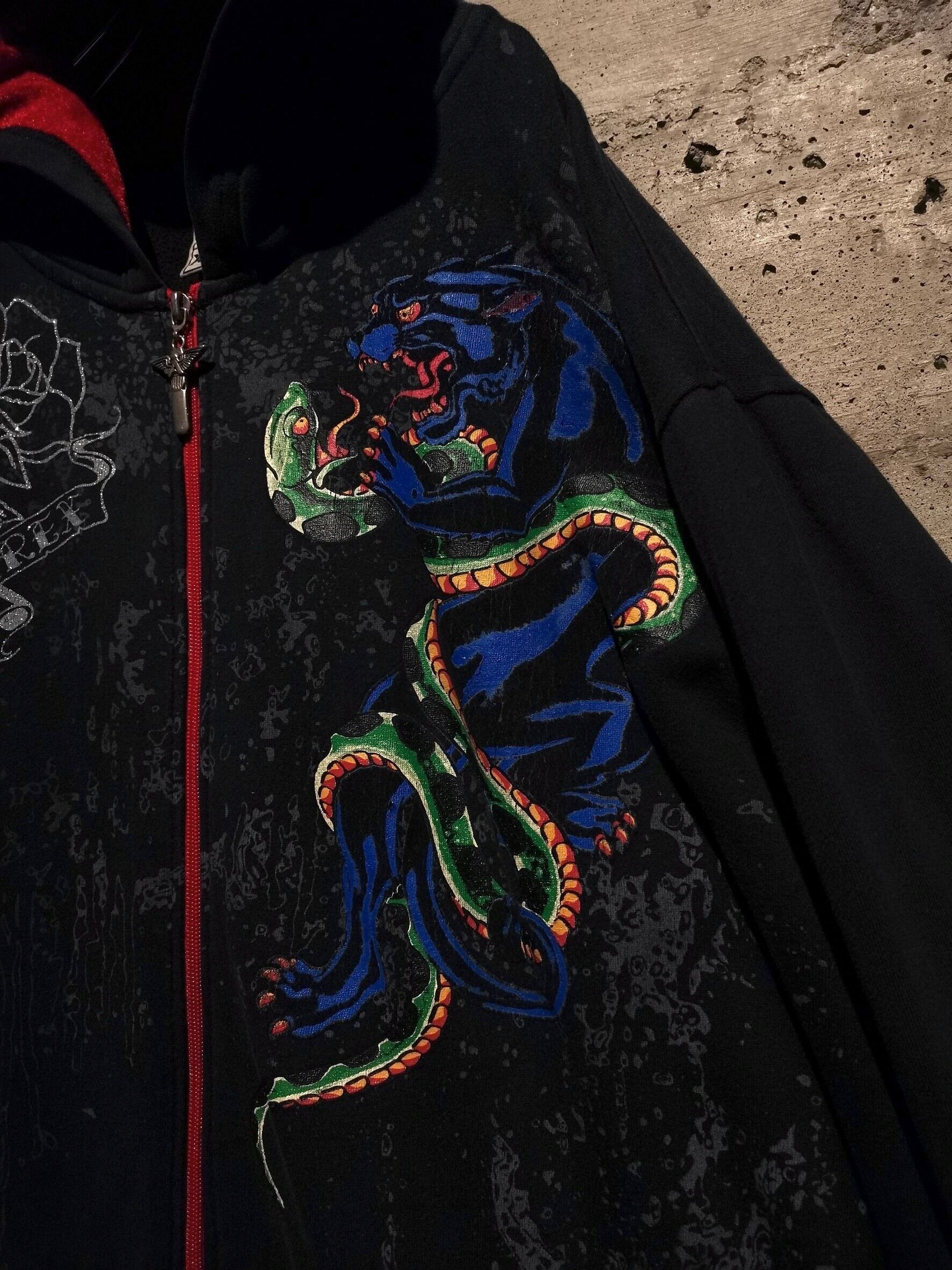 ブラックのボディをベースに、オールドスクールなタッチで右胸にはラメプリントで薔薇を、左胸には絡み合いながら闘うコブラと豹を載せた、ハイストリートな雰囲気漂うジップアップフーディ。