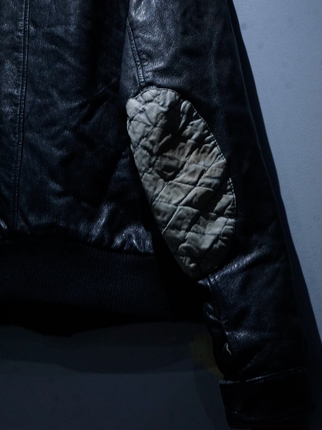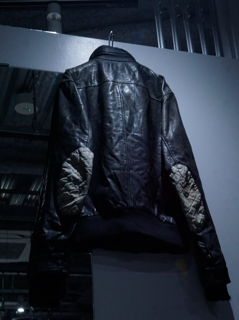 艶やかな光沢を帯びた上質なブラックレザージャケットに、内側に味わい深い表情を見せるコットン生地のジャケットを重ねたような、レイヤード風のデザインに仕上げたレザージャケット。