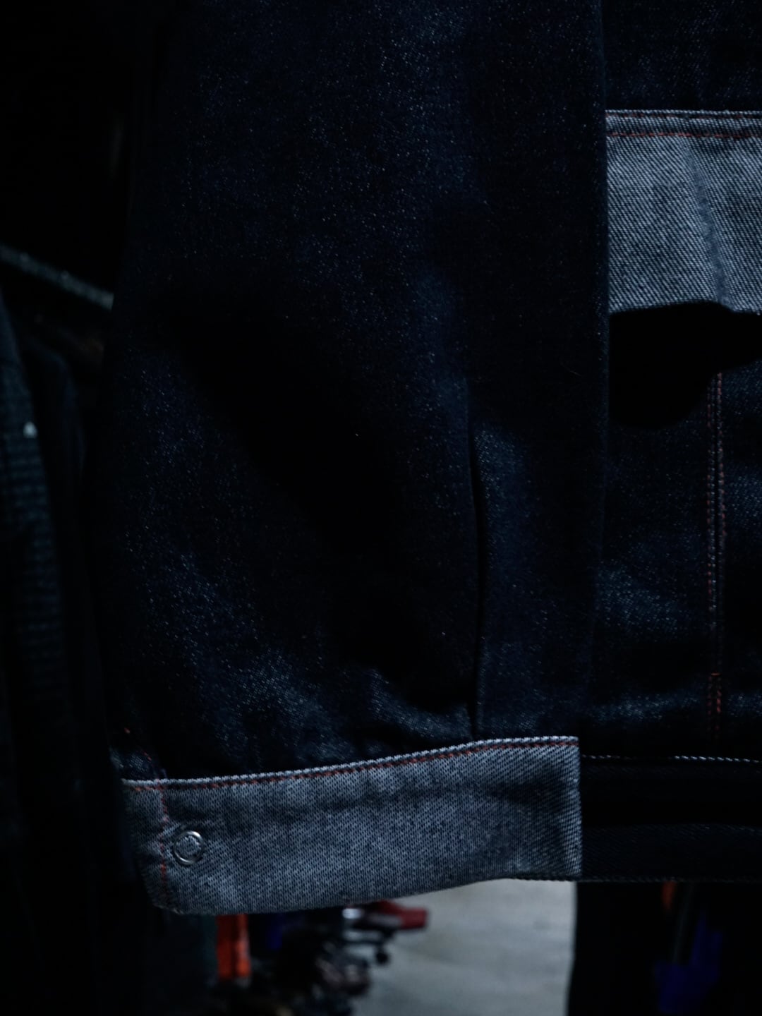ボディの各所に濃紺に映える、赤のステッチやカラーの切り替え。さらに前たては比翼仕立てにバックのアクションプリーツとデニムの無骨な印象はそのままに現代的なディテールを落とし込んだ1着。