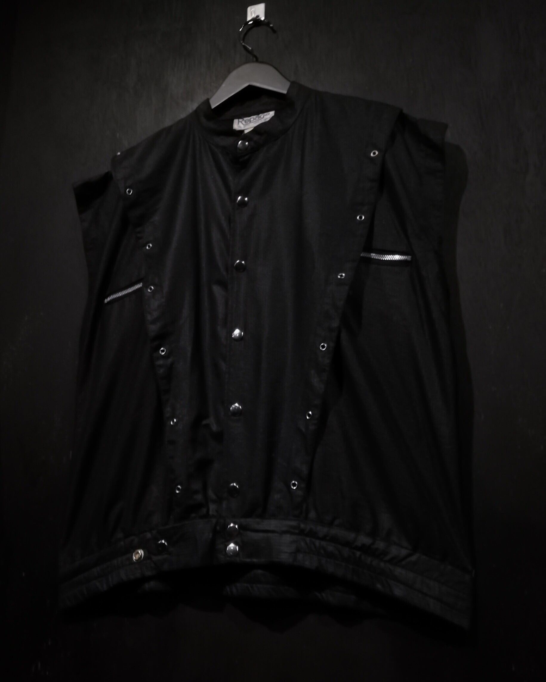 ブラックのボディをベースに、レイヤードさせたようなデザインで生地を重ねた、当店らしいモードな雰囲気漂うベスト。