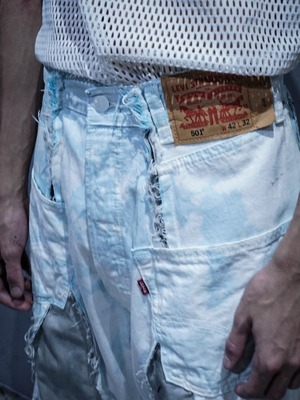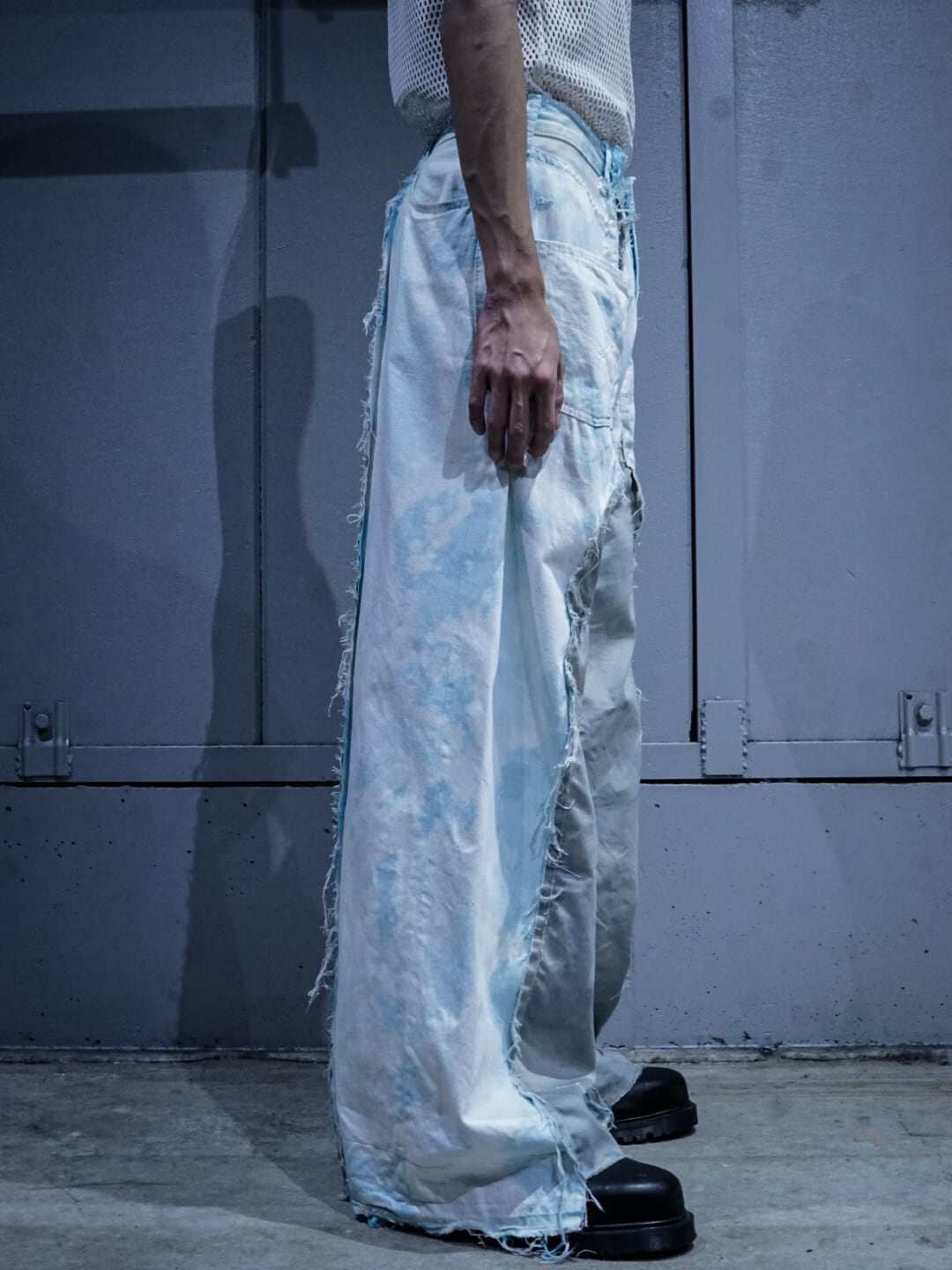 ホワイトジーンズをベースとし、レディースのジャケットに用いられるパネルパターンを施しレイブノリのバギーシルエットへと改造した"前後どちらでも履ける"バギージーンズ。
