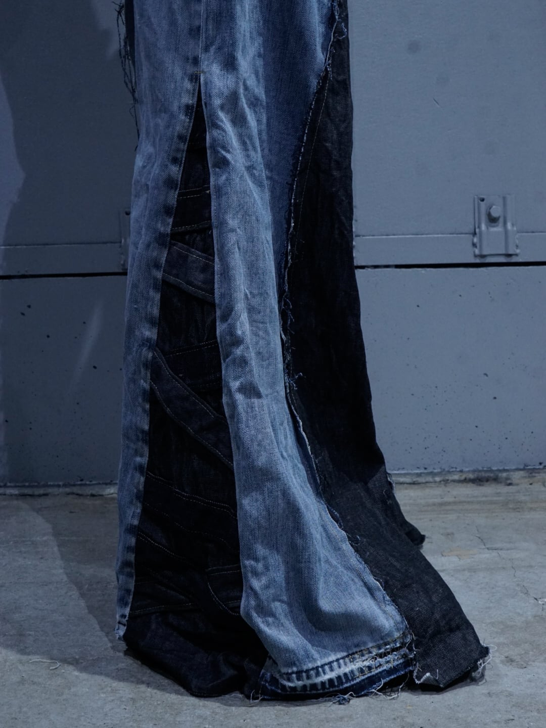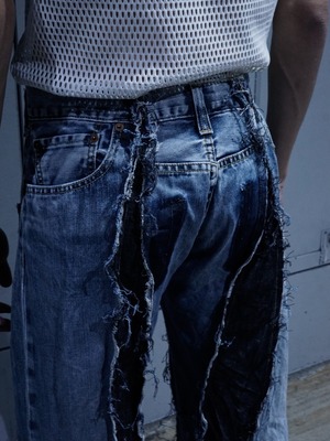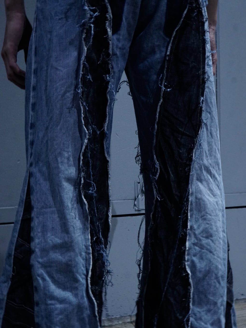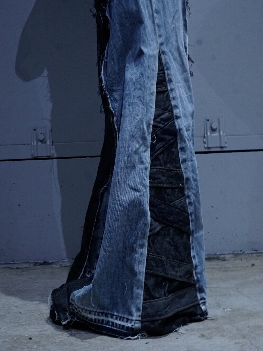 アイスブルーのジーンズをベースとし、レディースのジャケットに用いられるパネルパターンを施しレイブノリのバギーシルエットへと改造した"前後どちらでも履ける"バギージーンズ。