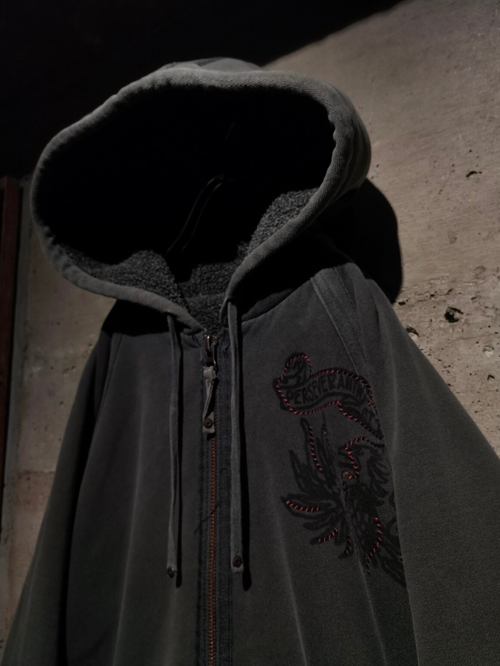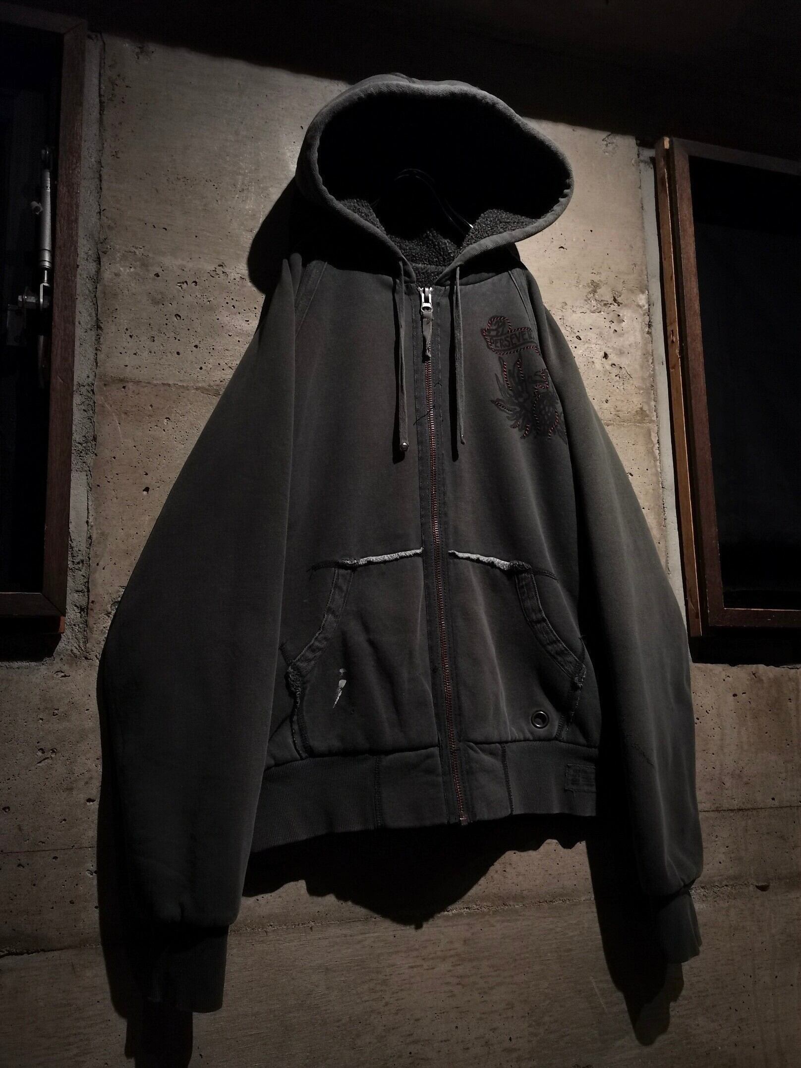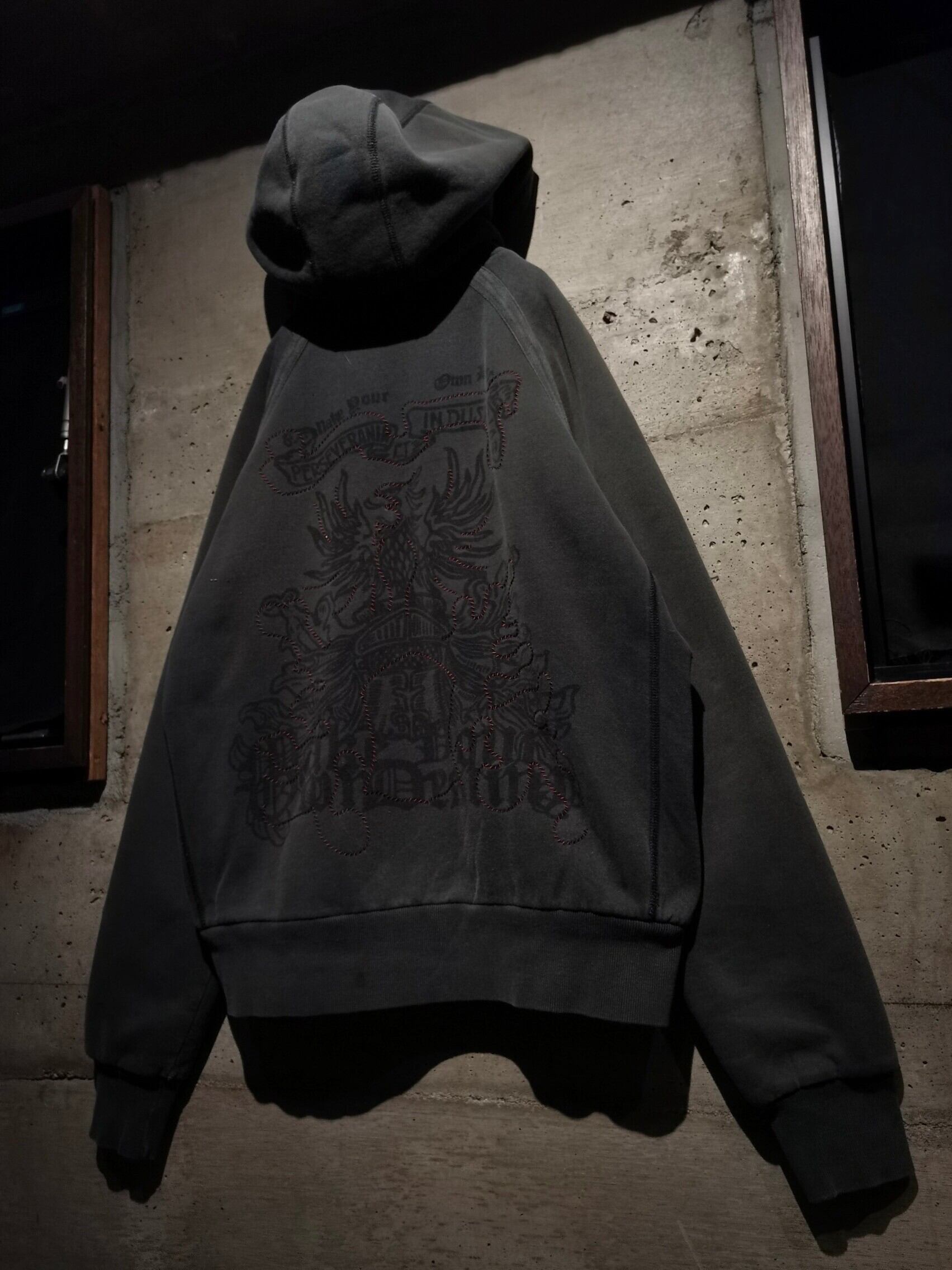 美しいフェードの効いたスミクロのボディに、ゴシック調のプリントを施したジップパーカー。
