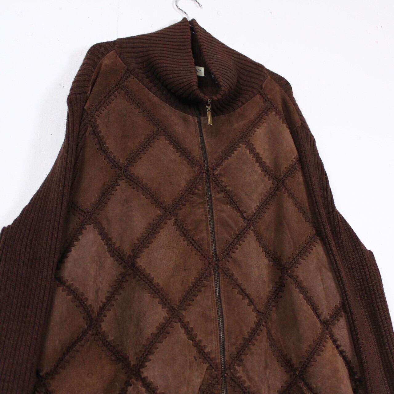 ドライバーズニット特有の畝のあるブラウンのニットをベースに、前身頃にレザーをパッチワーク状に切り替えたドライバーズニット。