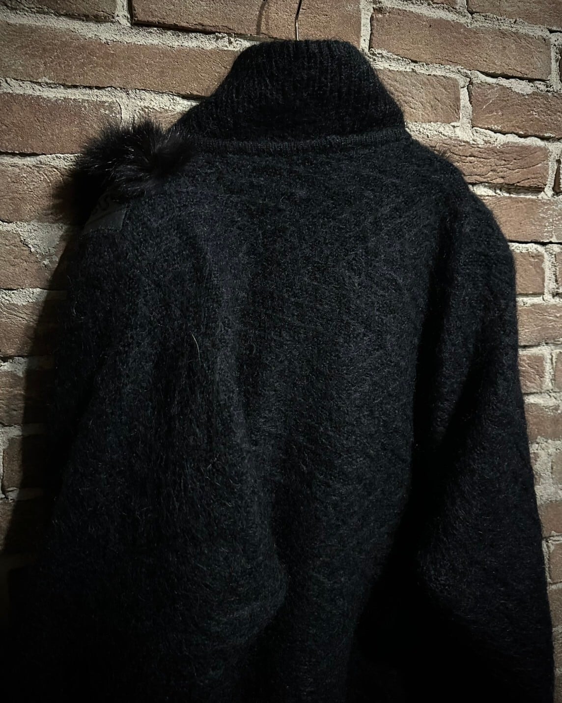毛足の長い黒のモヘアをベースに、前身頃には艶やかな毛足の長いモッフモフのファー、そしてパイピングのデザインを載せたブラックのレザーを切り替えた唯一無二なカーディガンジャケット。贅沢な異素材の組み合わせからはラグジュアリー&モードなフレーバーがムンムンと漂いますね。