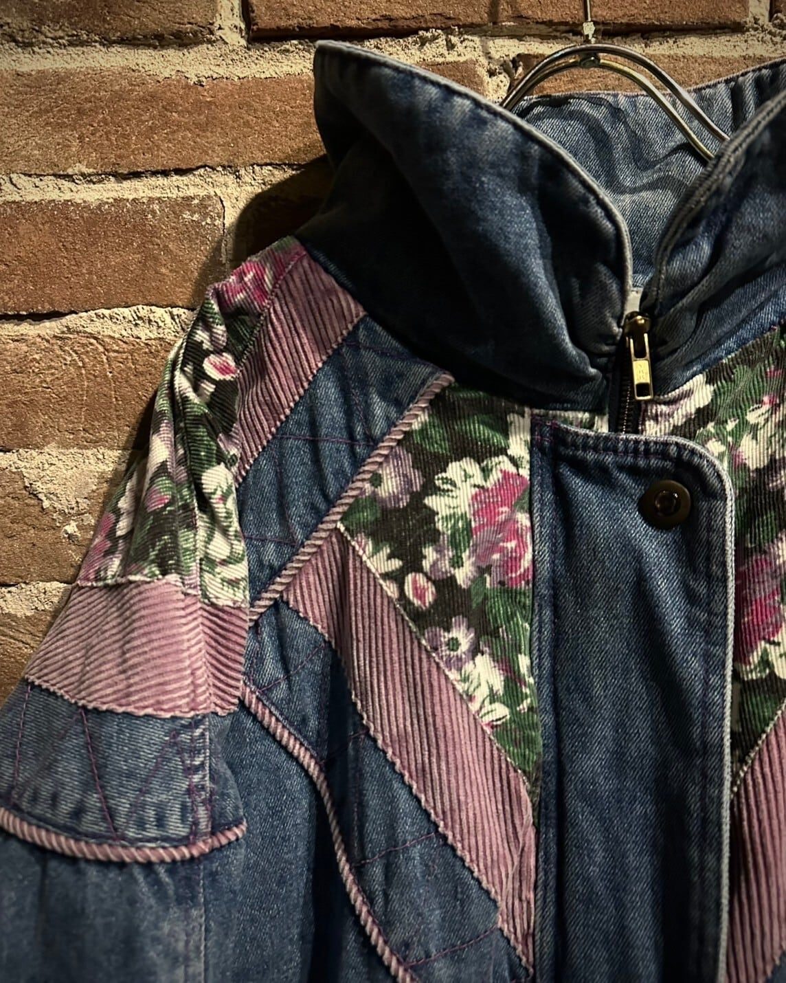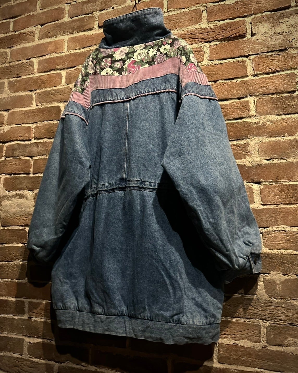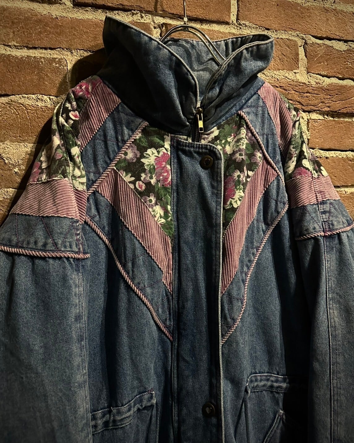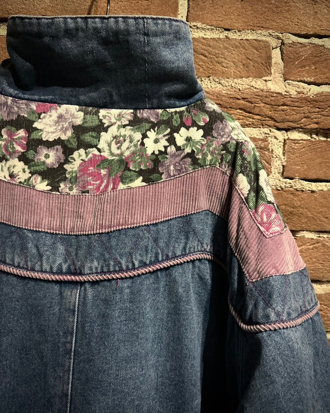 程よくエイジングのかかったブルーのボディに、ピンク、花柄のコーデュロイをシンメトリー状に切り替えた、当店らしいデザインの載ったパデットジャケット。