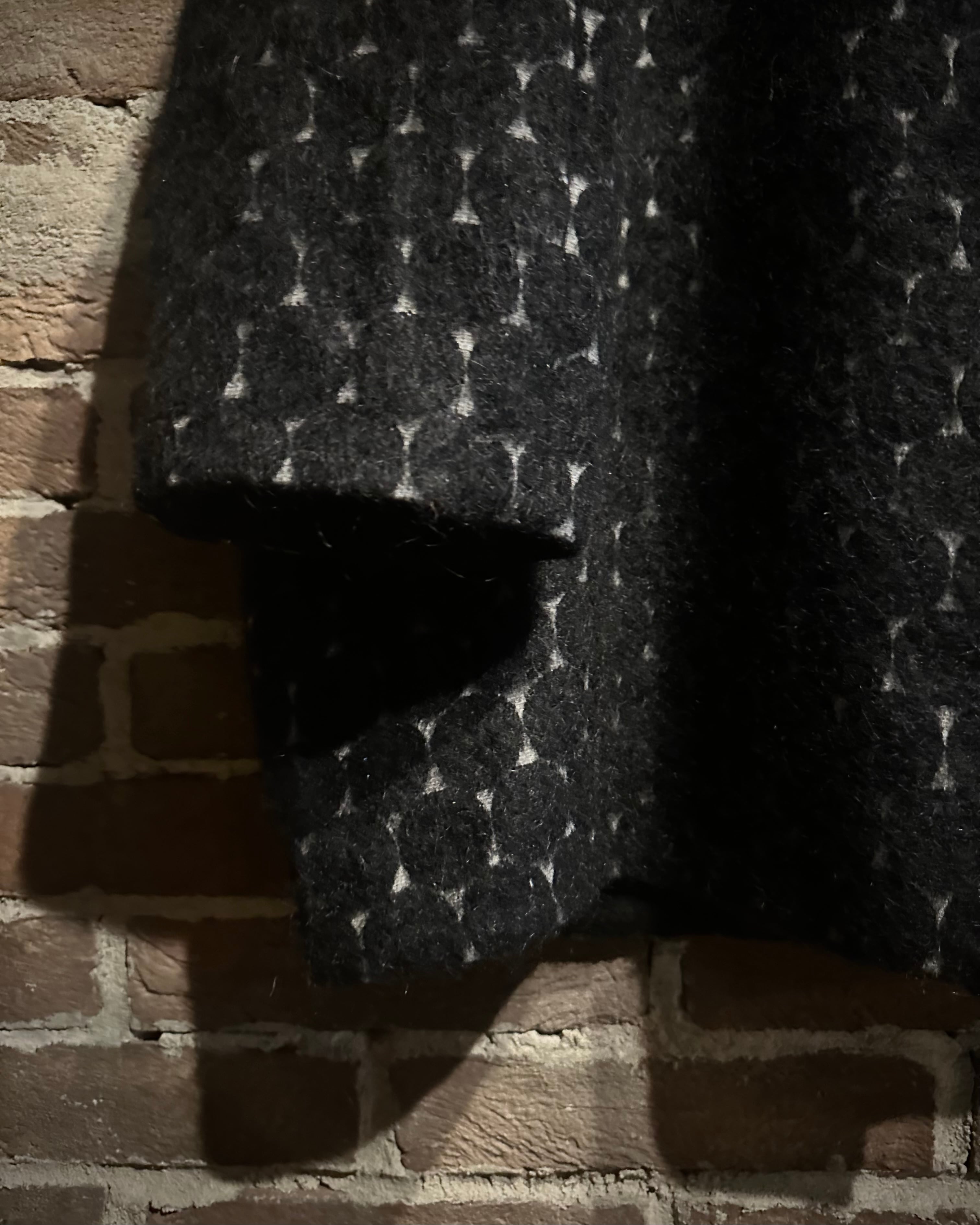 ホワイトのボディをベースに、黒でドット柄をみっちりと載せたミドル丈のコート。
