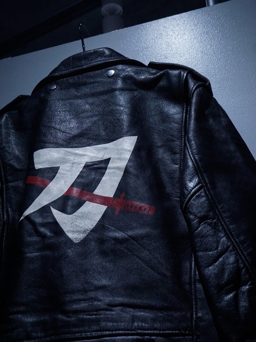 ハリのあるタフなブラックレザーをボディに使用し、背面に漢字の"刀"と刀のイラストを掛け合わせ、"刃"の文字を表現したペイントカスタムを施したダブルライダースジャケット。