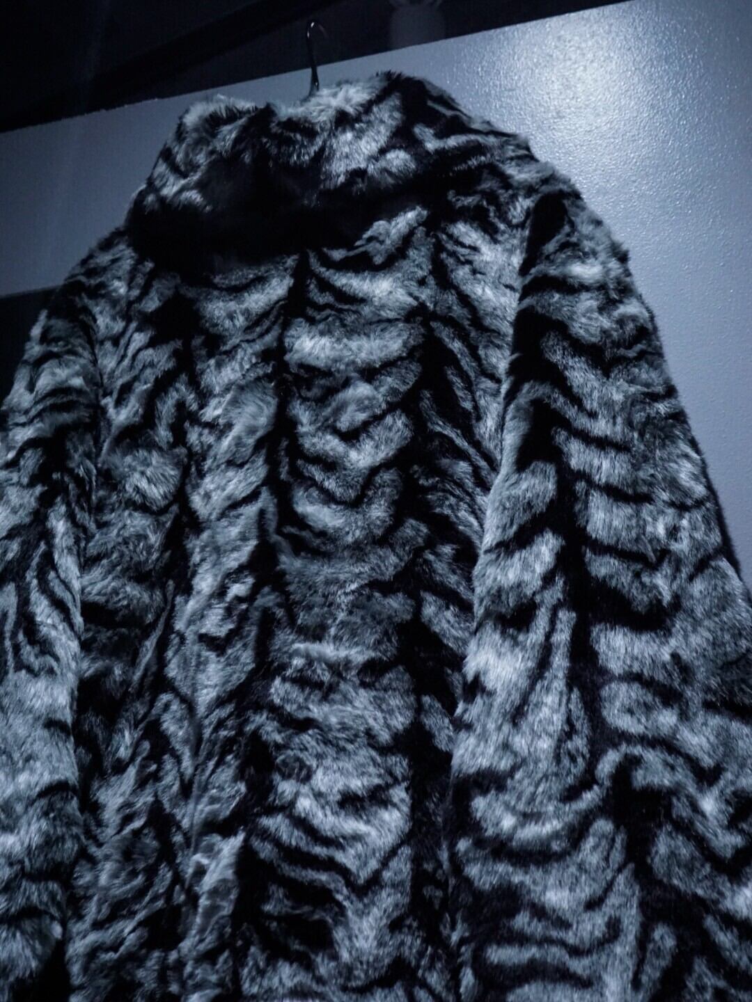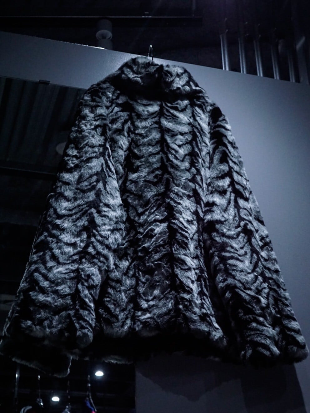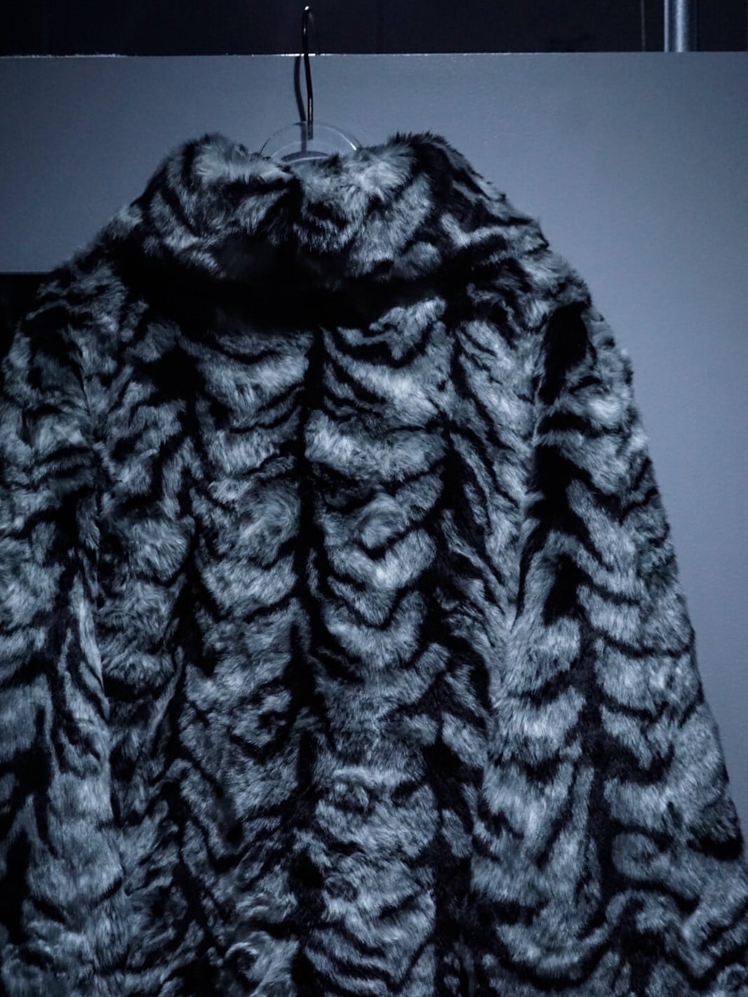 表面はモノトーンのタイガーパターンを載せたモッフモフのフェイクファー。ガバッと裏返すと滑らかなブラック無地ボディへと早変わりするリバーシブル仕様のジャケット。