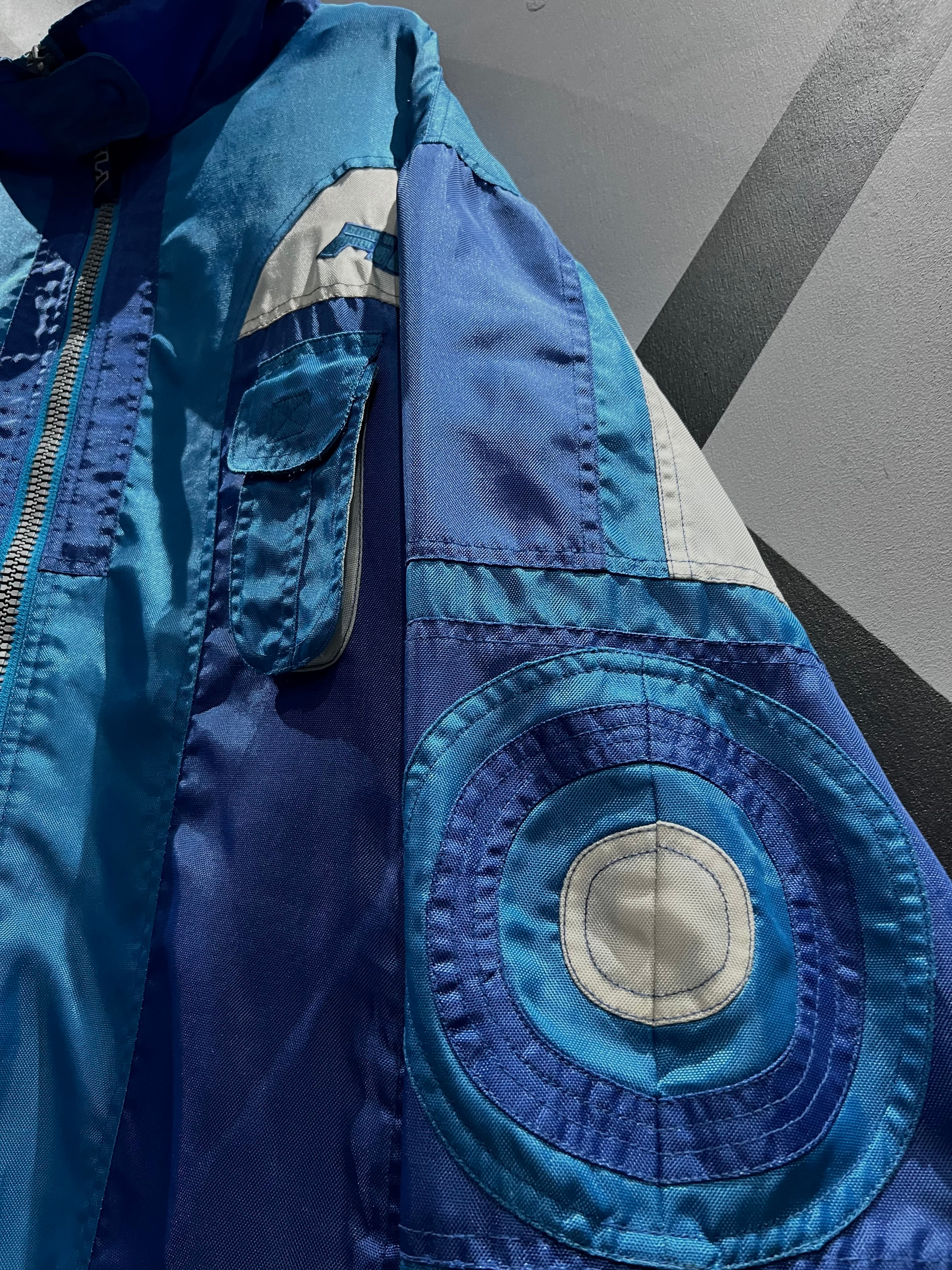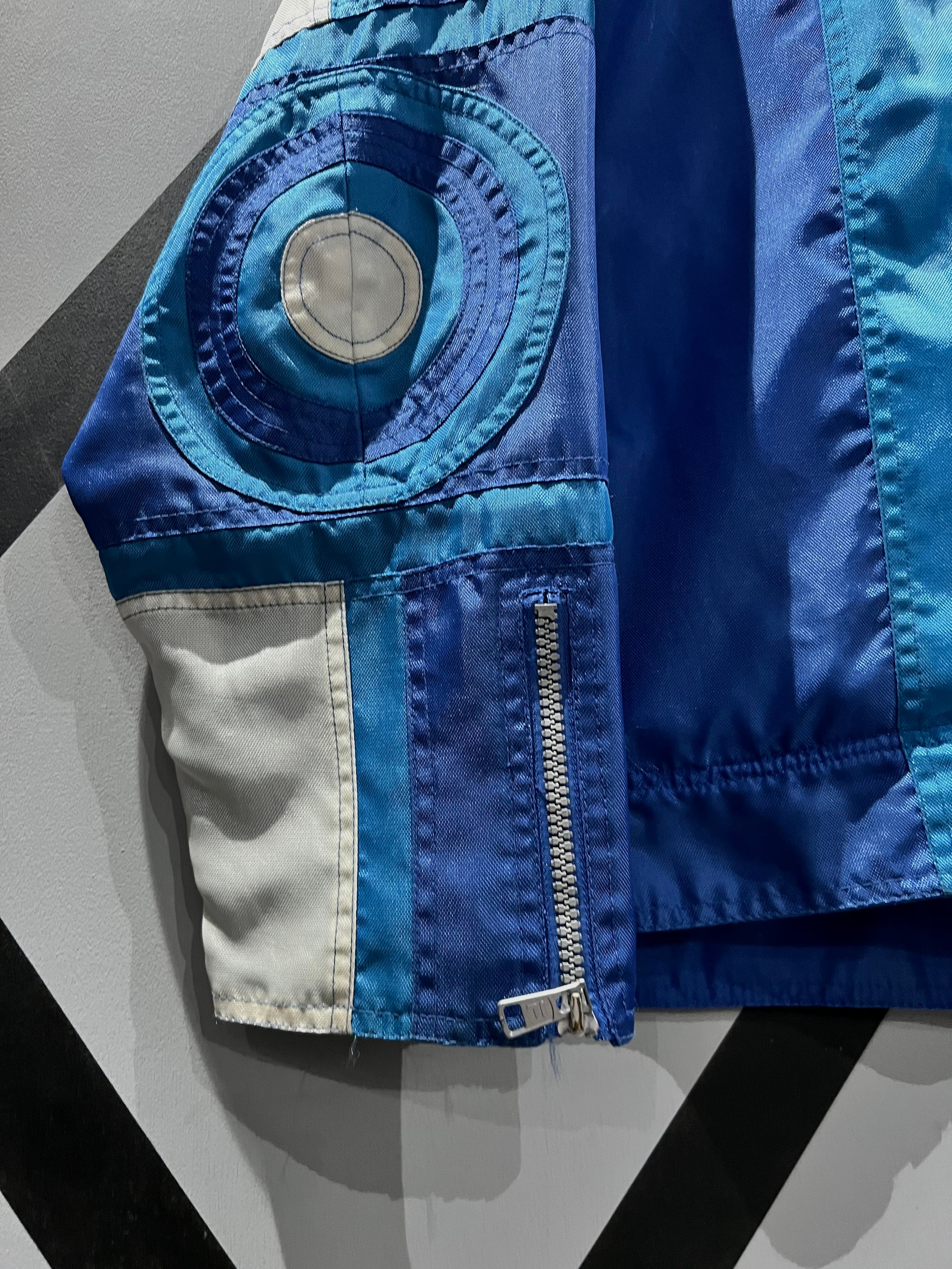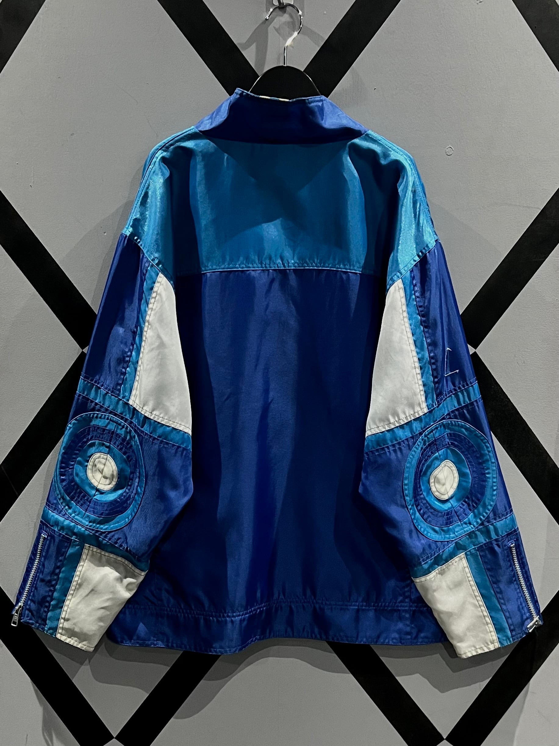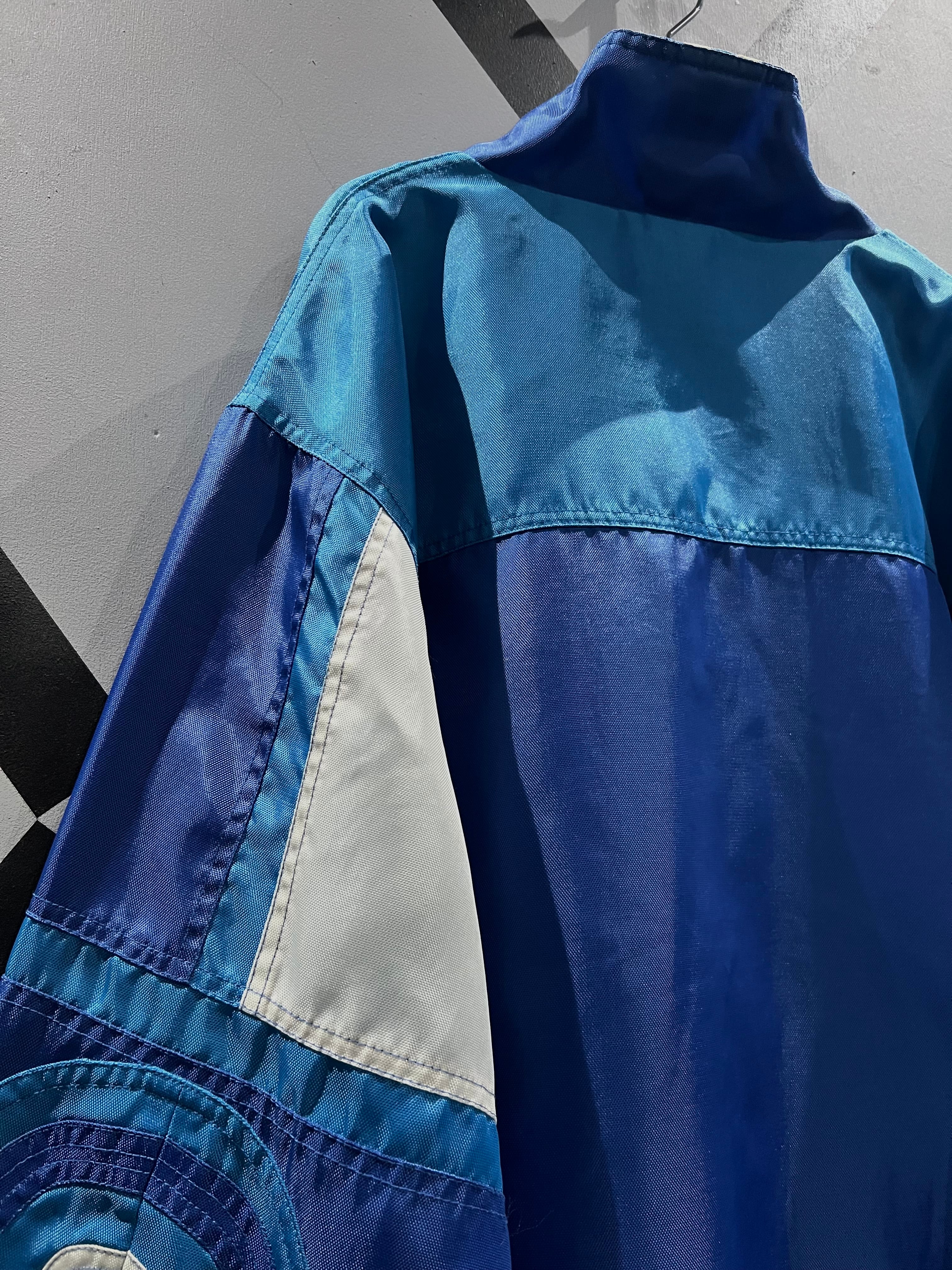 ハリのあるナイロン素材をボディに使用し、青、水色、白の爽やかなカラーリングで幾何学的な切り替えを施したナイロンギアジャケット。
