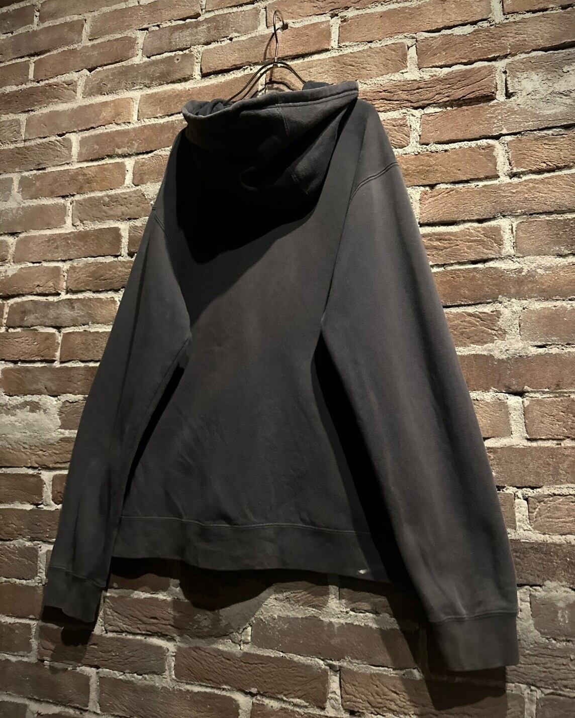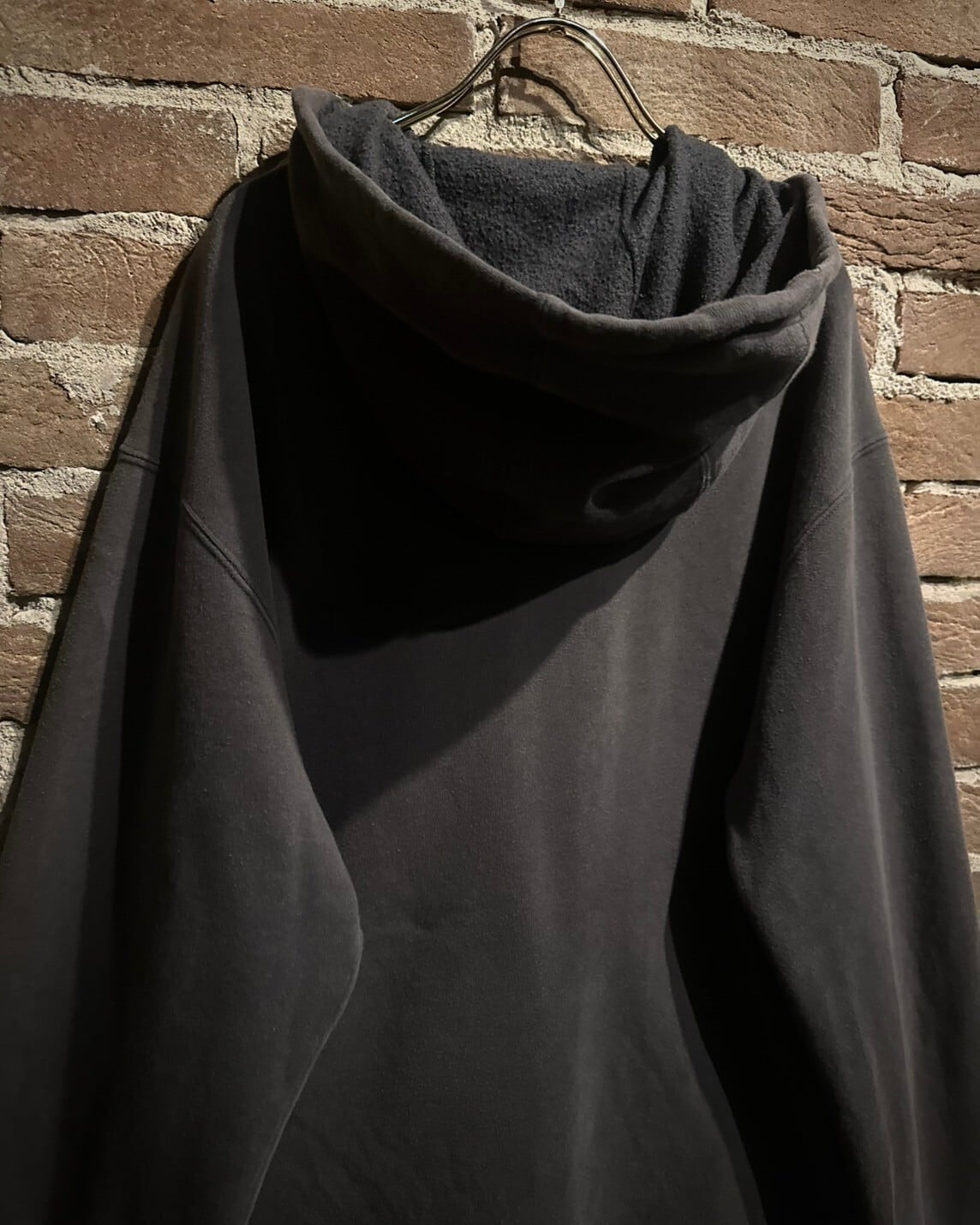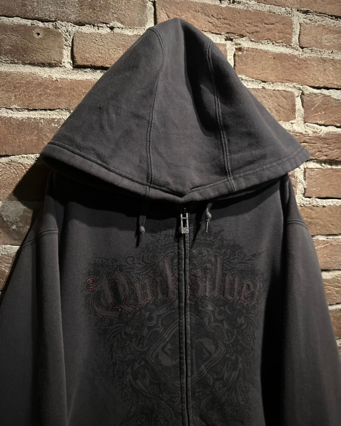 フェード感の良いブラウンのボディをベースに、ゴシック調のデザインを載せたジップアップフーディ。
