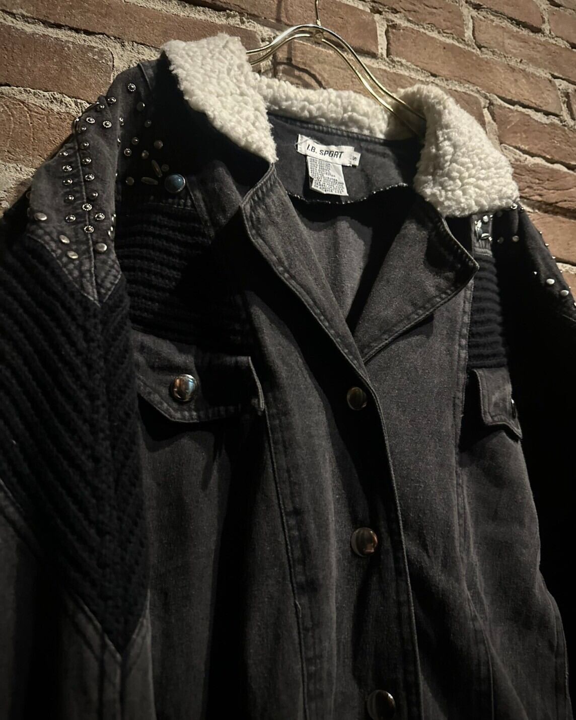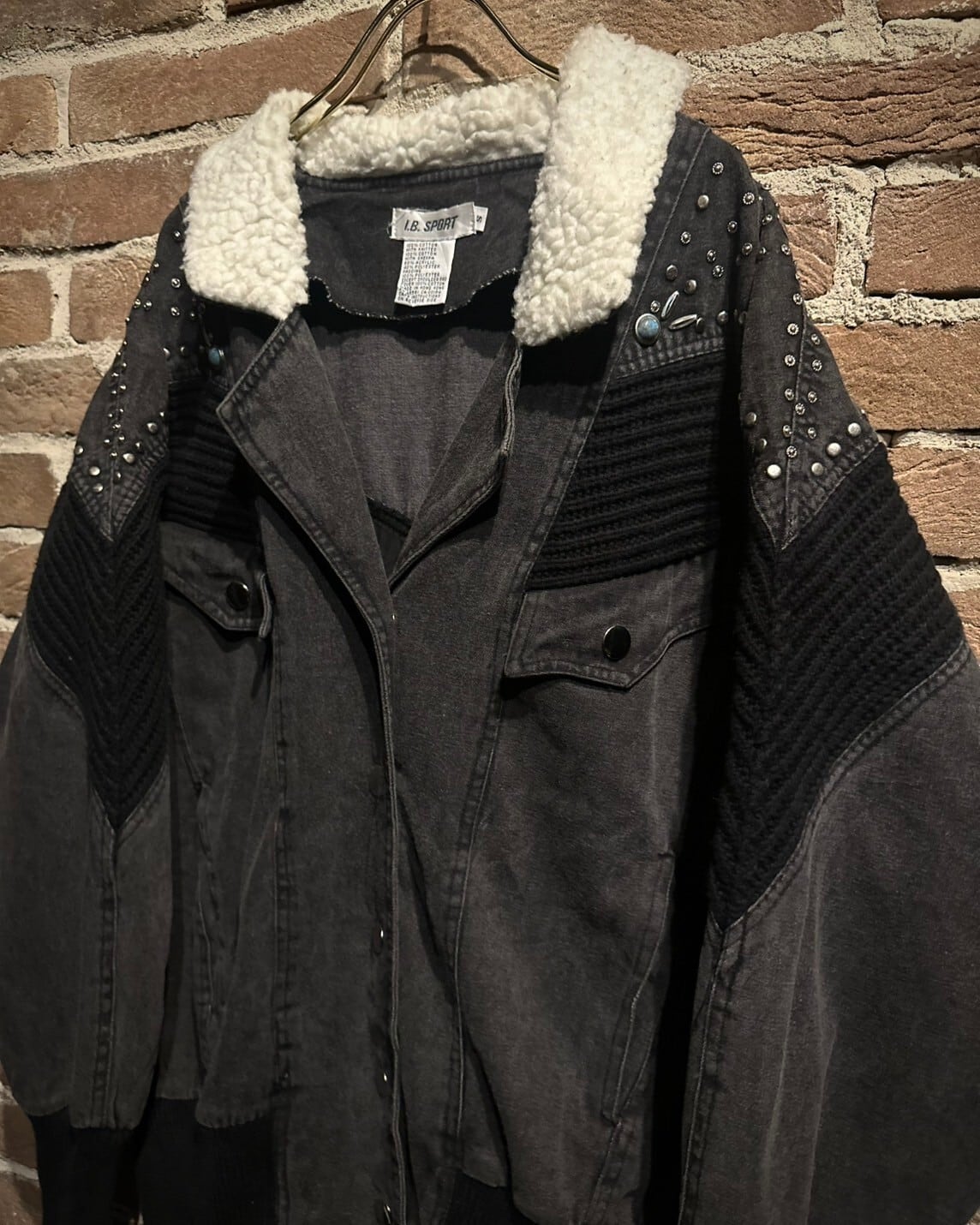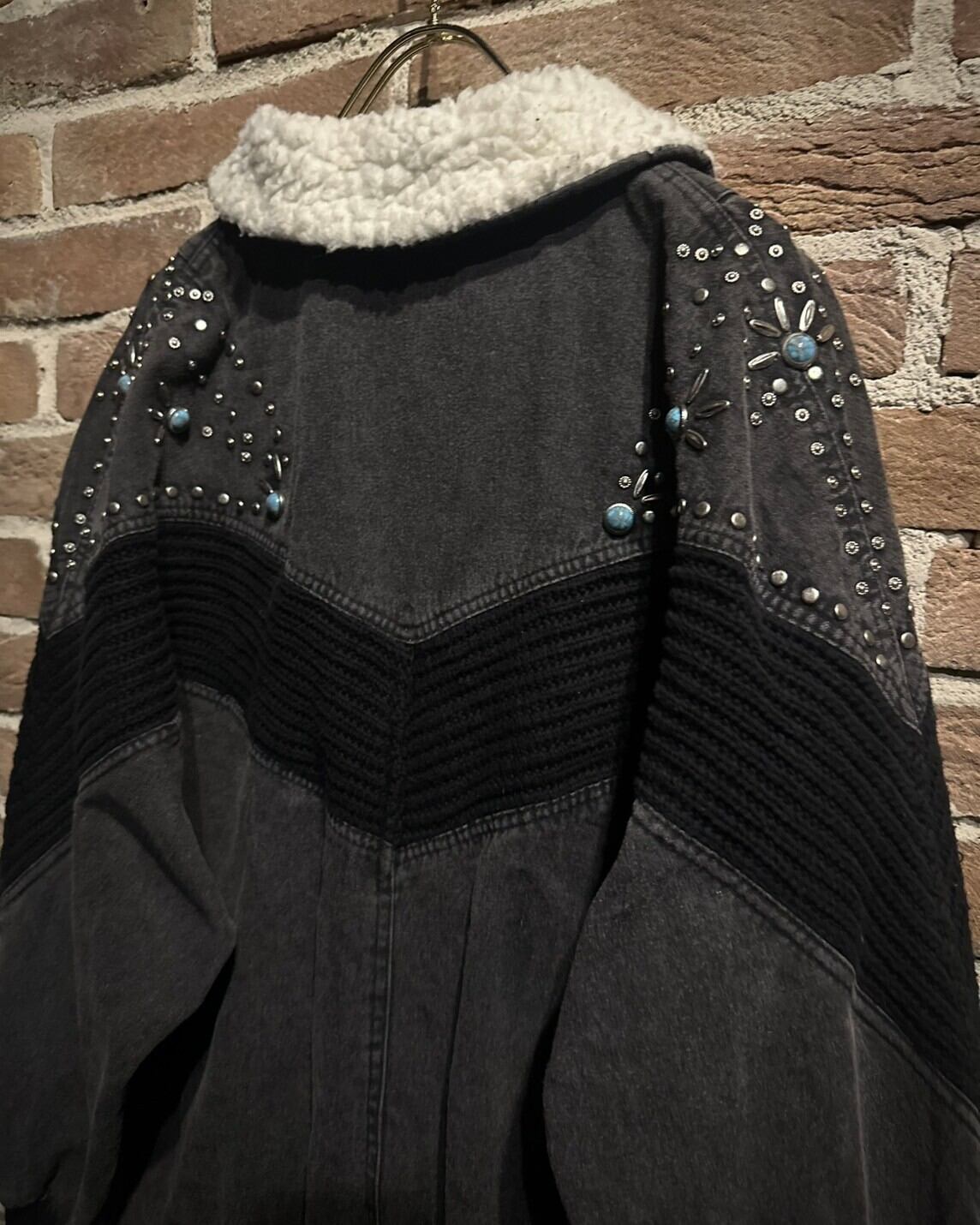 フェードグレーのボディをベースに、ニットを切り替え、肩周りにスタッズやストーンの装飾を施した稀有なデニムジャケット。