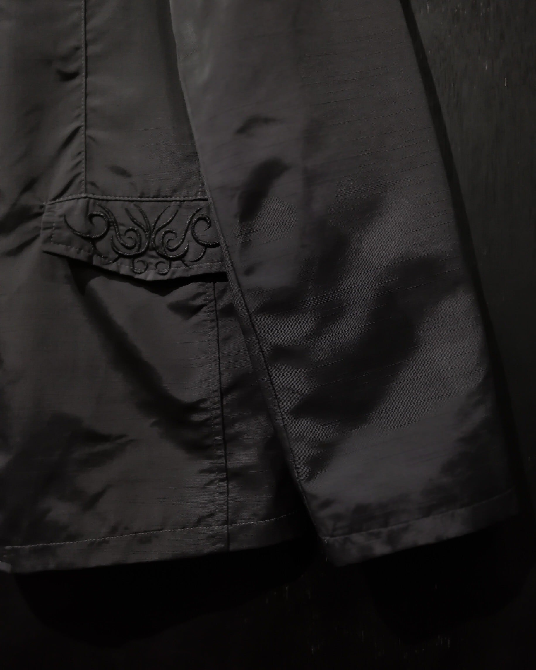 サラッと光沢のある素材感のボディをベースに、肩、フラップ、背面にトライバル柄の刺繍を刻み込んだテーラードジャケット。