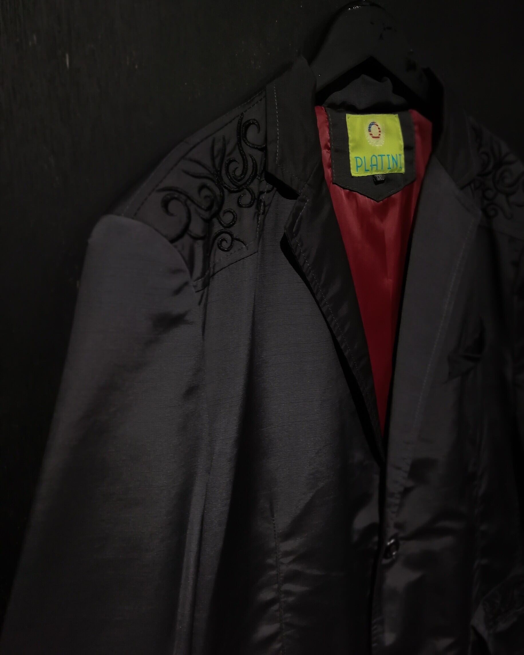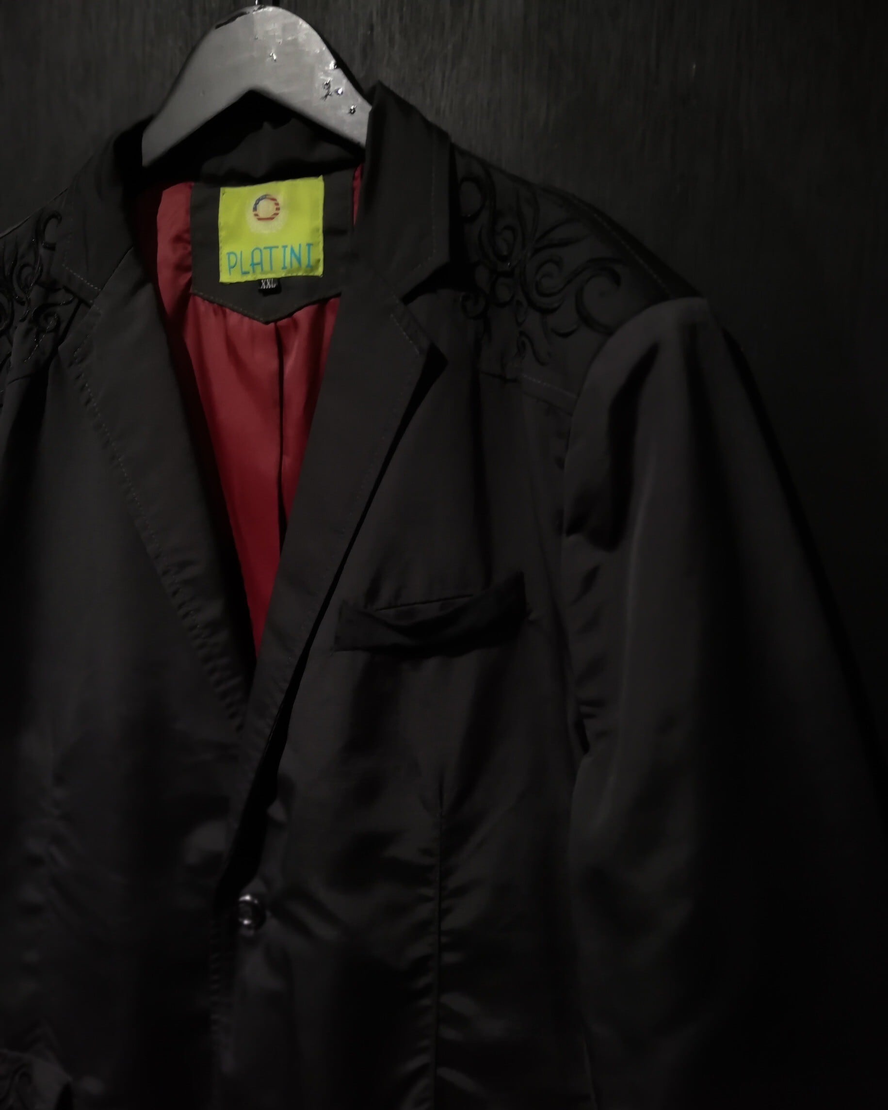 オールブラックの仕上がりながら、刺繍による立体感が生まれています。2つボタンのシングルブレスト。作りとしては非常に洗練された1着に。