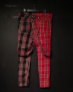 パンクファッションと言えば、のタータンチェックを赤×黒×白で両足に切り替え、ボンテージパンツならではのギミックを施した逸品。