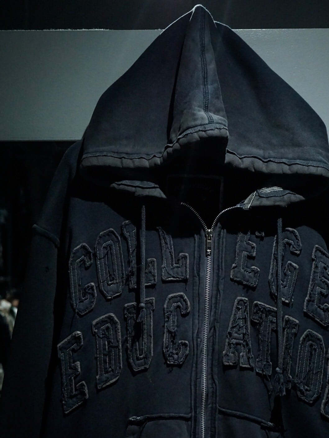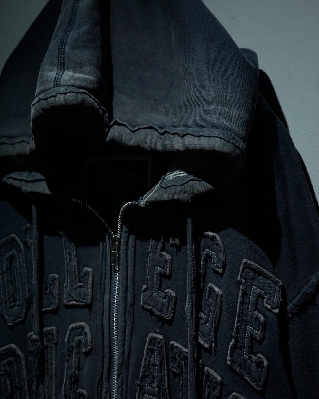 フェードグレーのボディをベースに、生地の端を敢えてほつれさせたパッチでロゴを載せたジップアップフーディ。