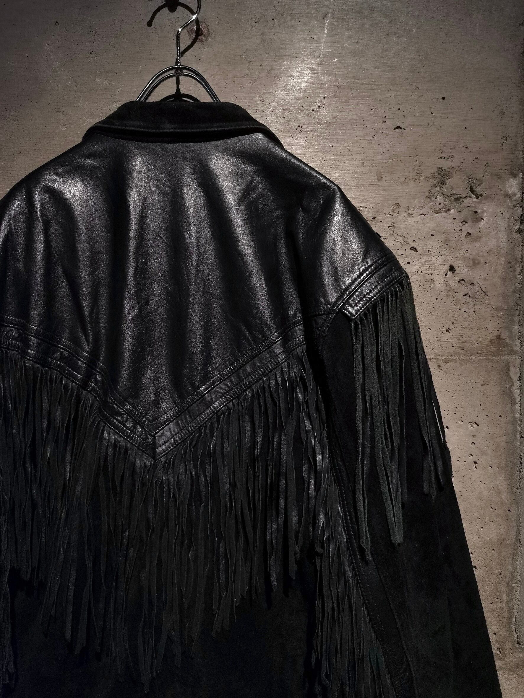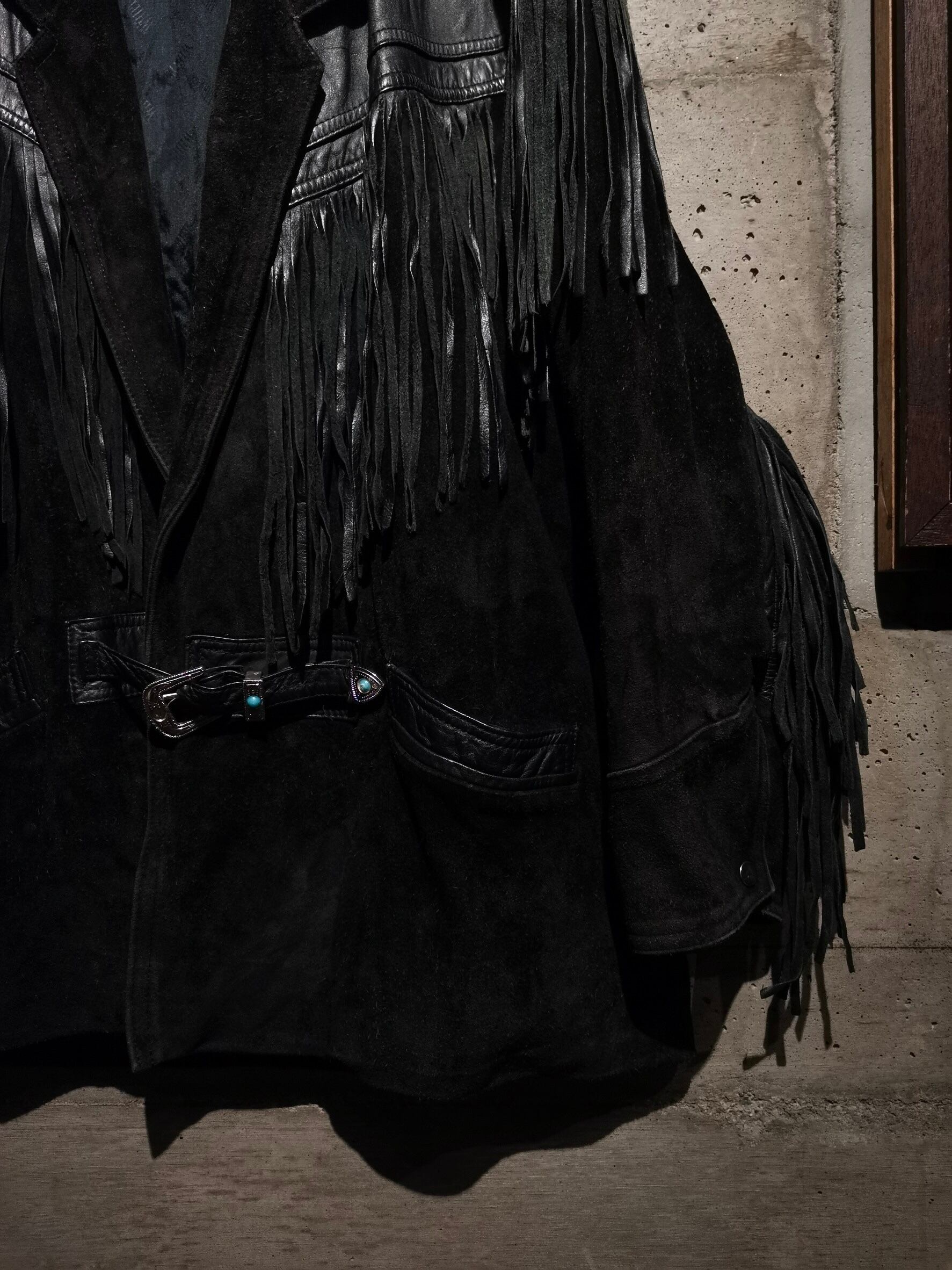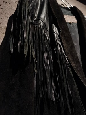 全体を黒のレザーでまとめる事で統一感は持ちつつ、素材感の差やフリンジ、コンチョベルト等、細部のこだわりによって服に奥行きが生まれたスペシャルな1着です。