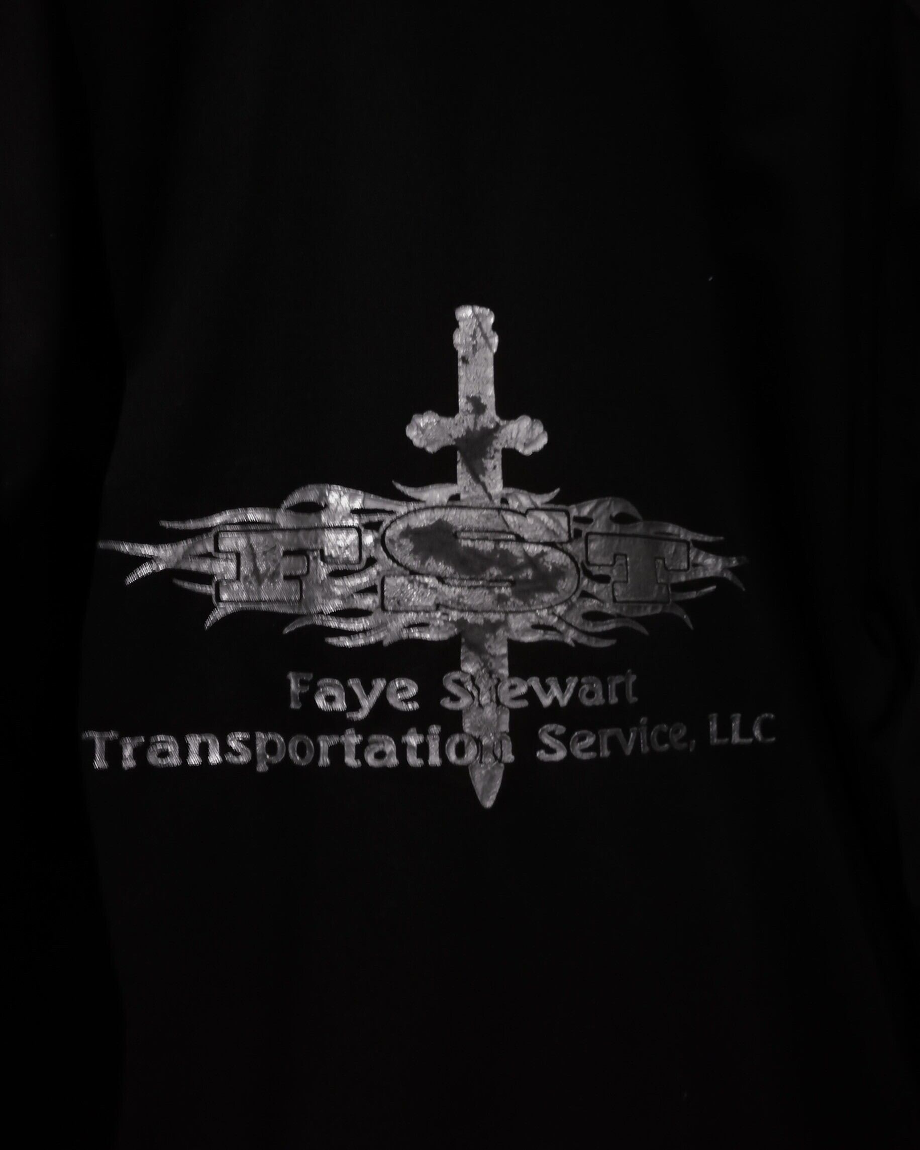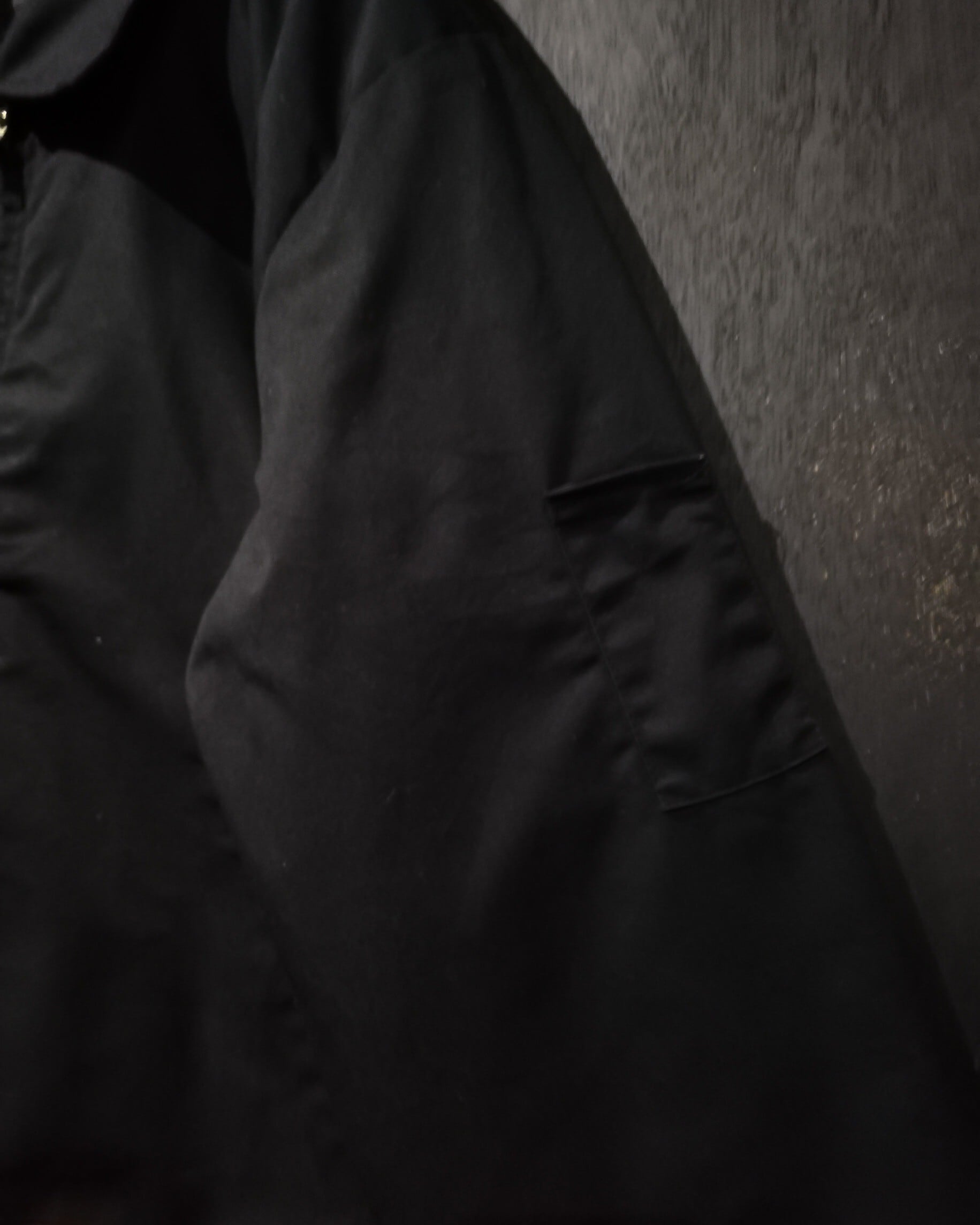 パリッとハリのあるブラックのポリエステルのボディに、アメリカの輸送会社のファイヤーパターンに剣を刺したロゴをシルバーでプリントした企業物の1着。輸送会社とは思えないほど尖っていてかっこいいですよね、、