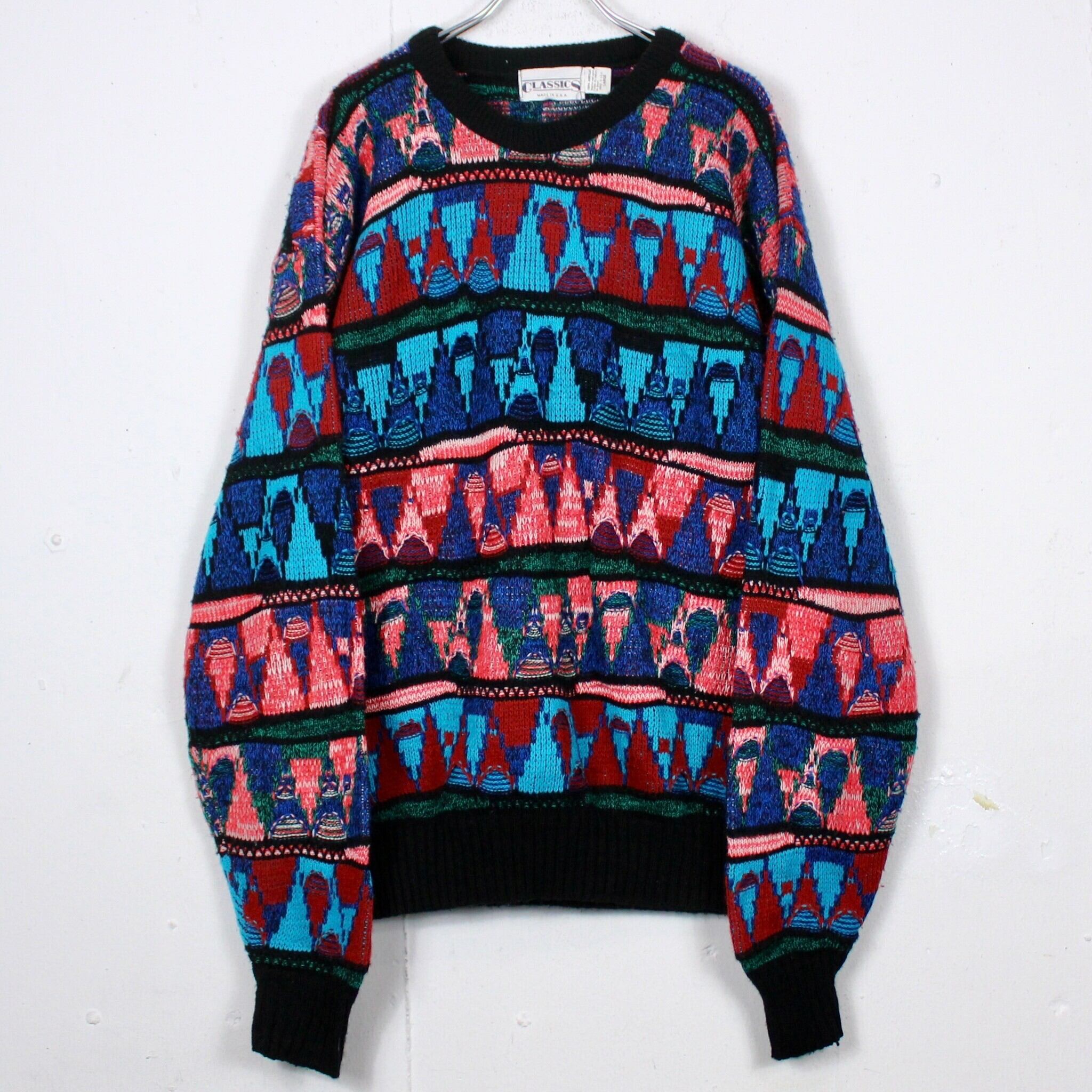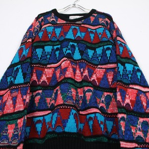 柔らかく滑らかな質感のアクリルニット生地のボディに、アーティスティックなフレーバーを漂わせる柄を全面に載せた1着。
