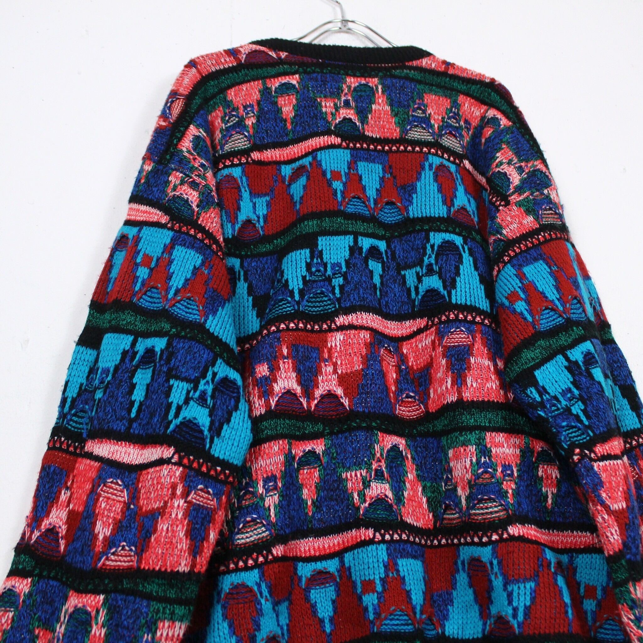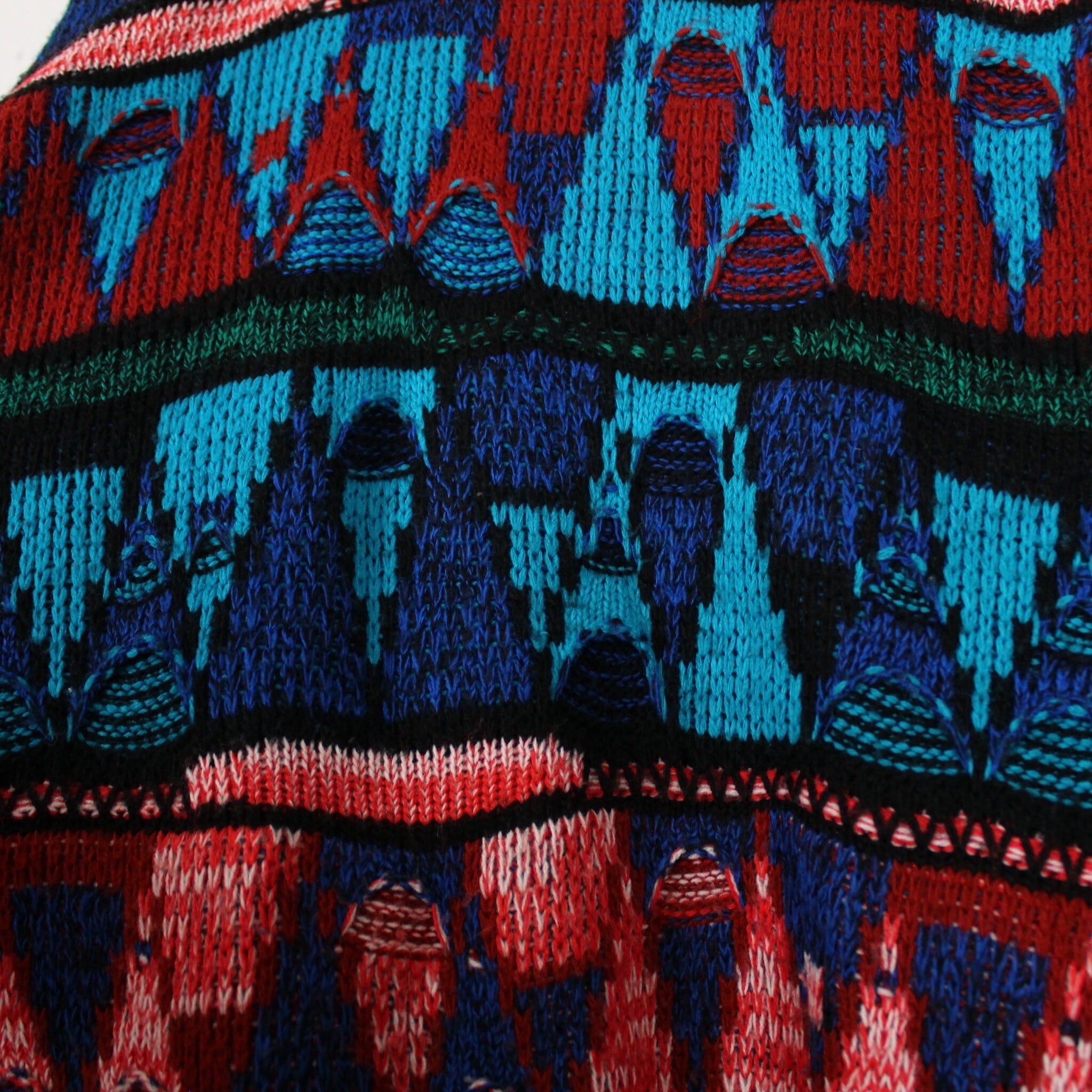 パキッとしたビビッドなカラーで、ボーダー状にカラーリングを切り替えながらアーティスティックなデザインを編み込んだインパクト抜群な仕上がりに。
