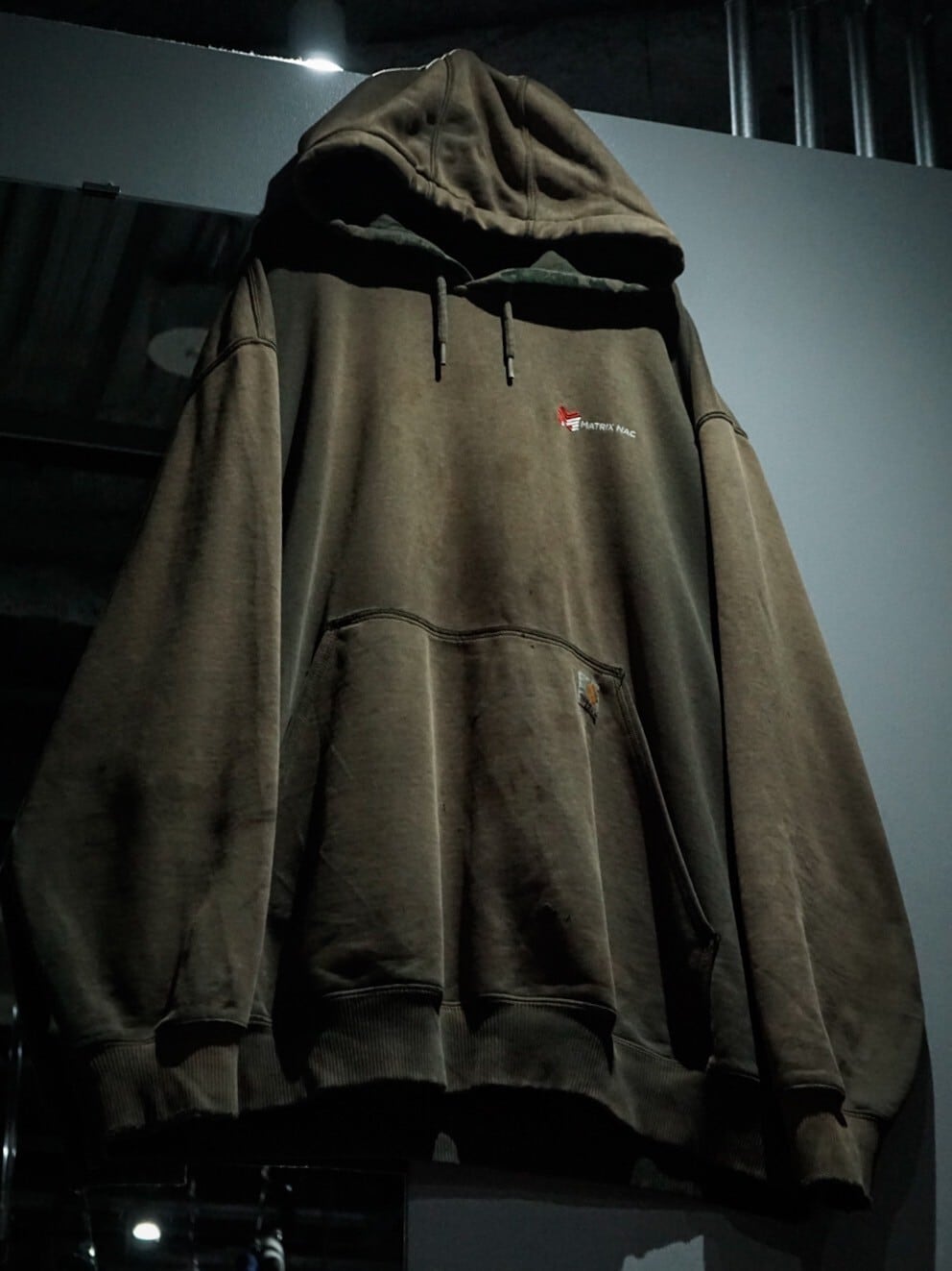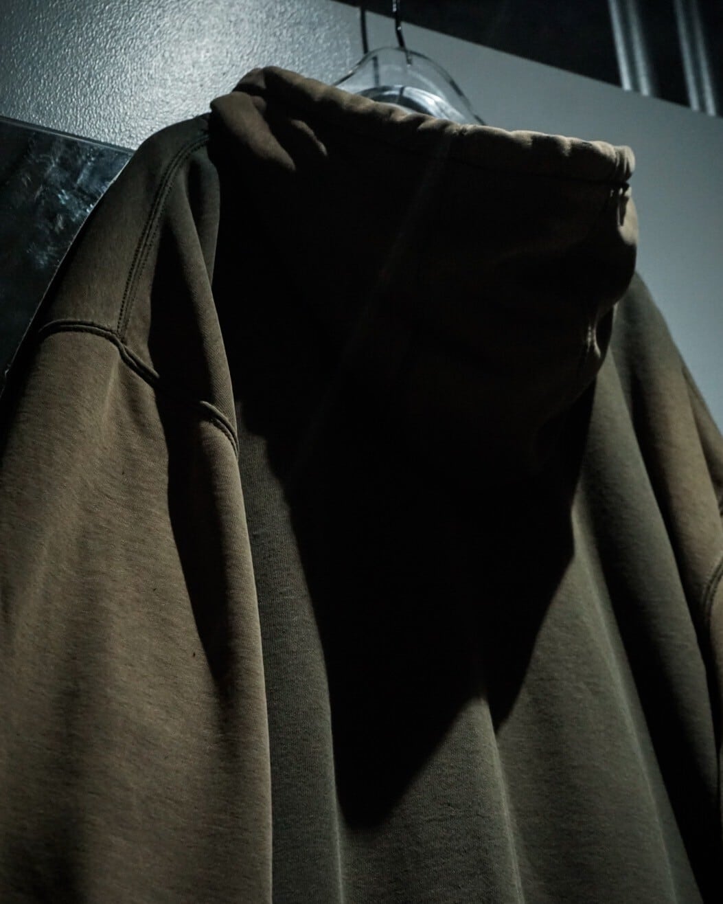肉感のある、美しくフェードしたブラウンのスウェット生地を用いたハーフジップフーディに、経年変化によるエイジングが載せられた1着。