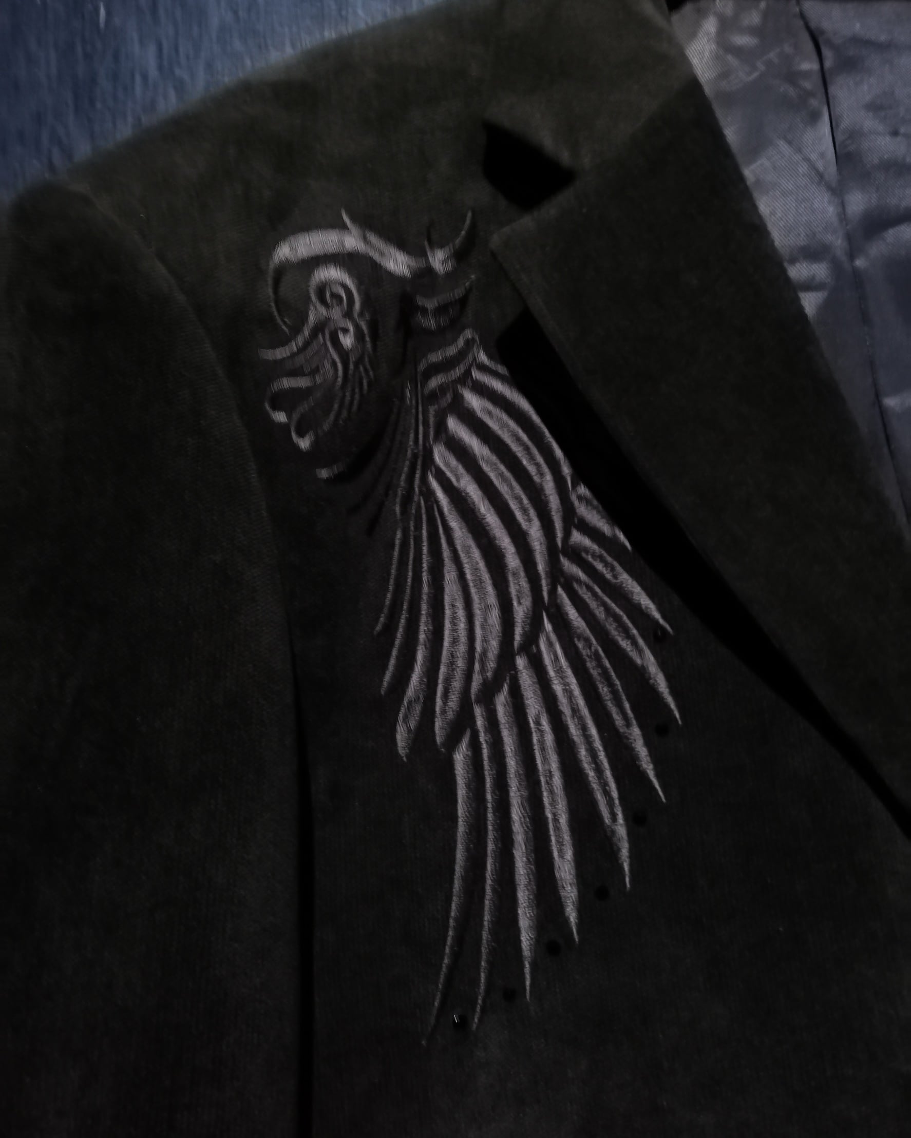 柔らかで起毛感のあるブラウンのボディに、右肩、背面にゴシックな雰囲気を漂わせる刺繍を刻んだテーラードジャケット。