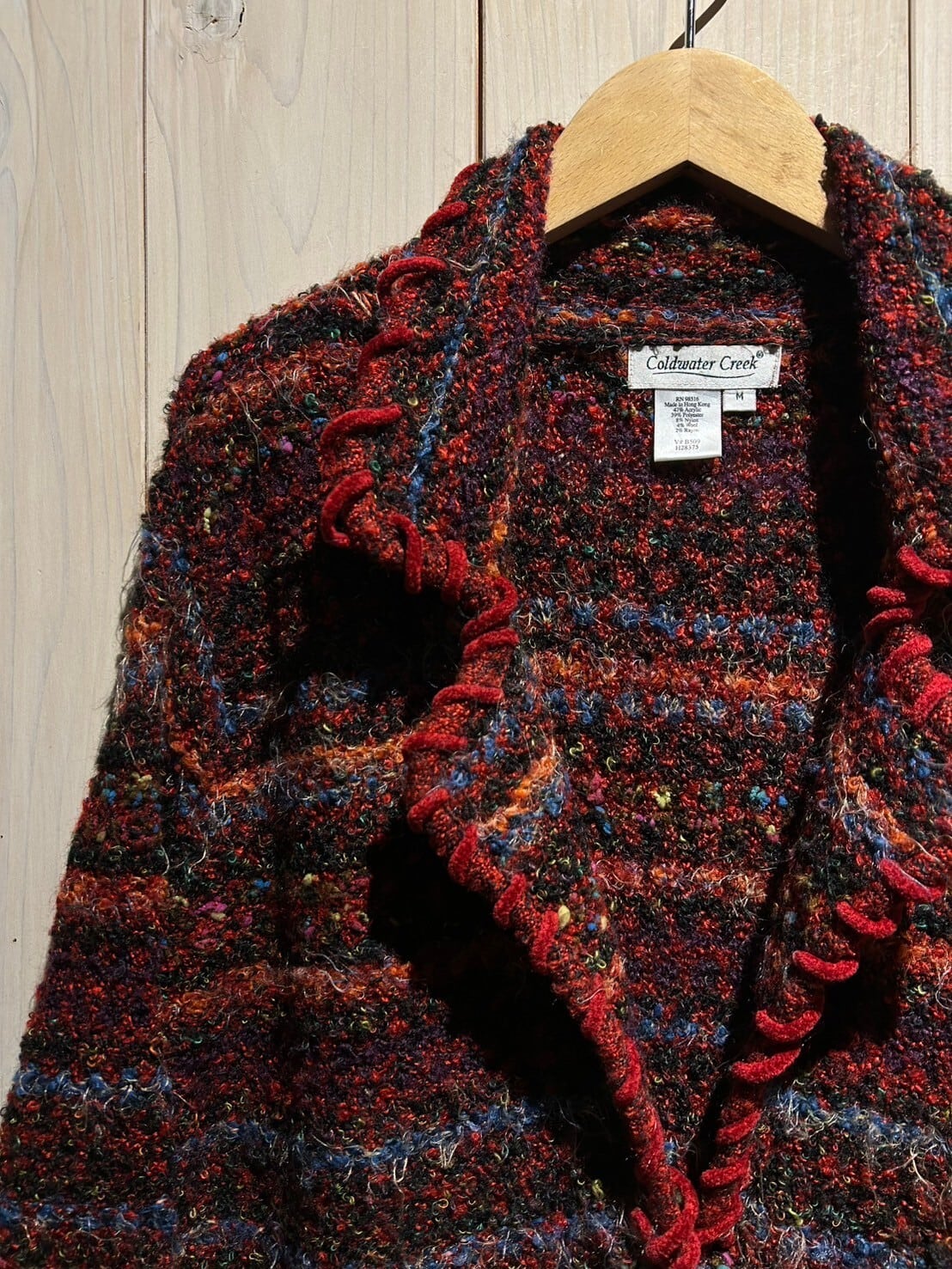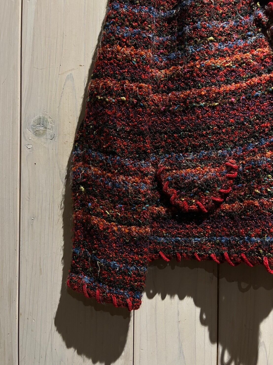 赤、オレンジ、水色、黄色等々、非常に多彩な色使いでボーダー状にニッティングを施した、パイルニットのジャケット。