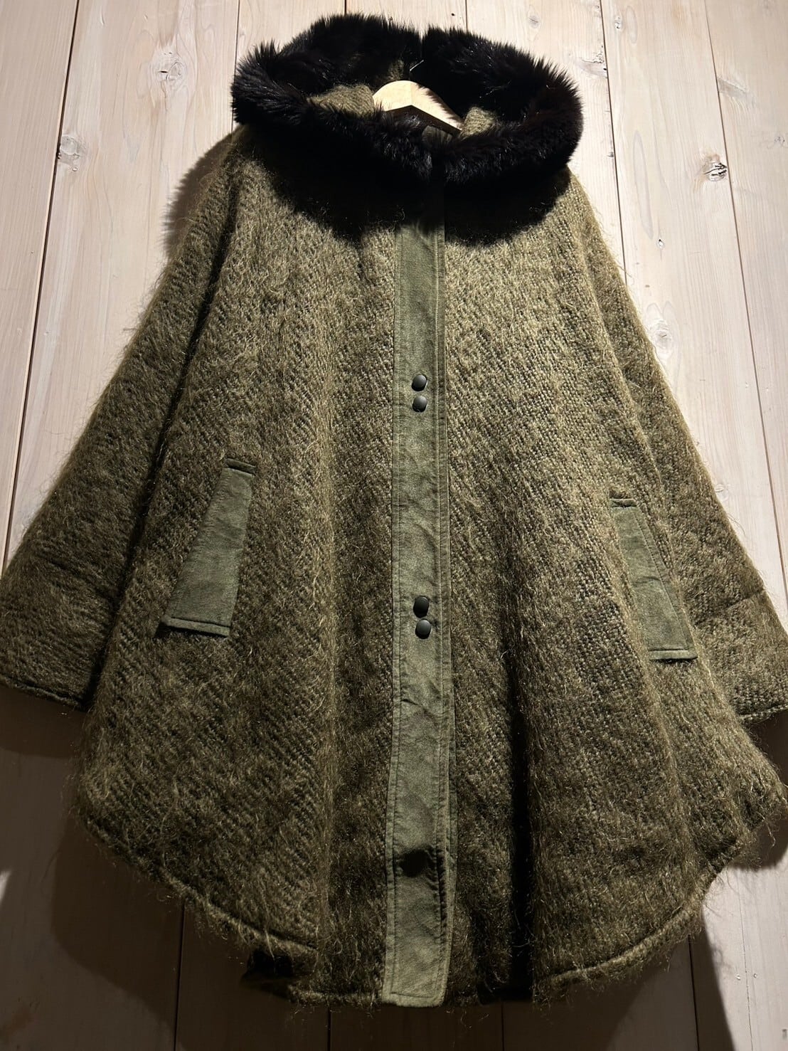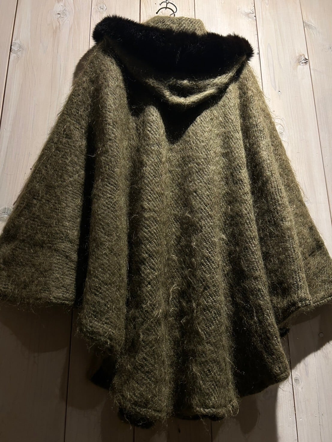 フワッとした空気を含んだ毛足の長いモヘア使用したボディをベースに、前立て、ポケット口にスエードレザー、フードにはリアルフォックスファーを切り替えたポンチョ。