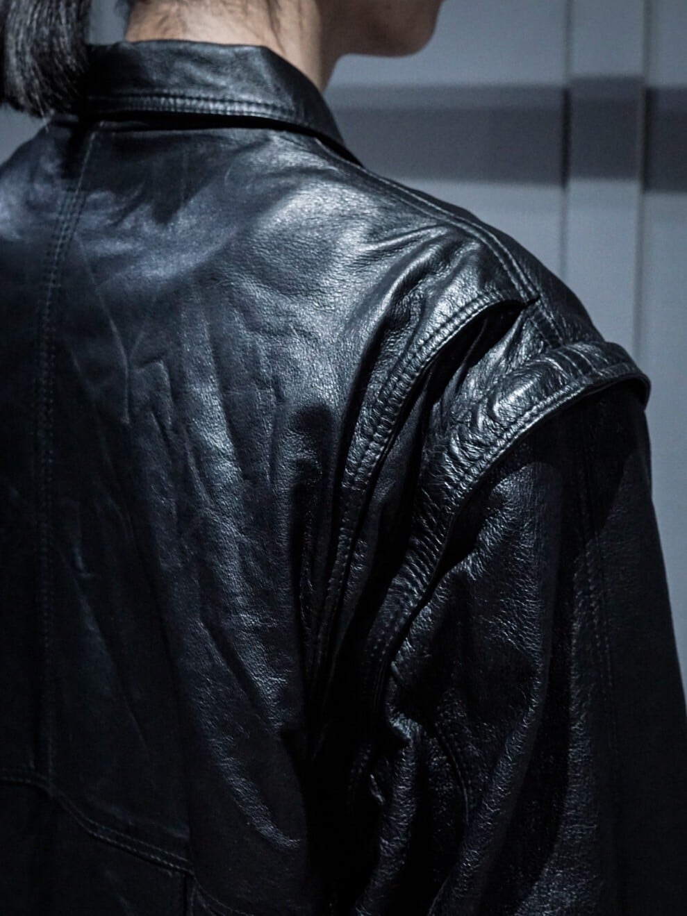 柔らかく、ハリのある上質なレザーをボディに採用し、フロントにはポケットのギミックをON。アームにはミリタリー由来のユーティリティポケット、肩のアクションプリーツなど細やかなギミックが素晴らしい逸品。