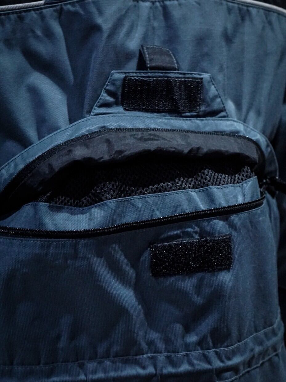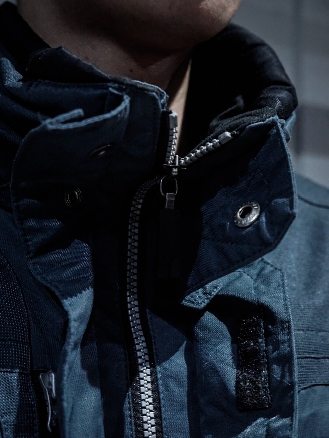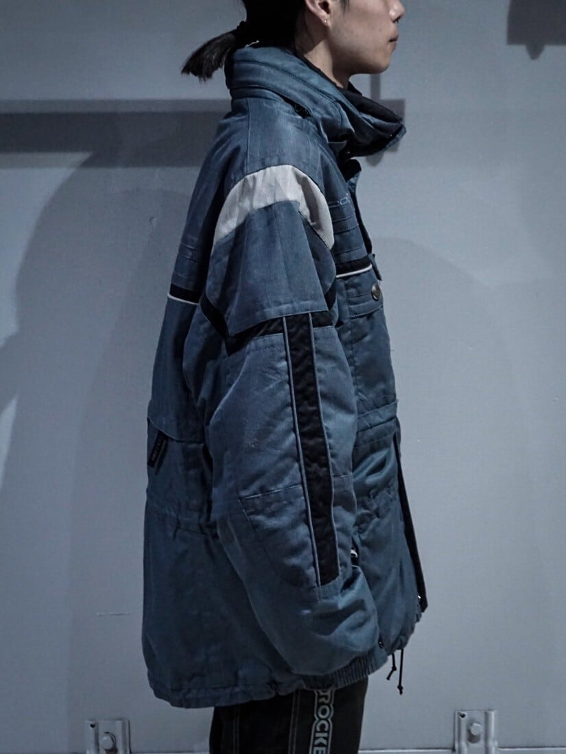 ハリのあるブルーグレーのボディをベースに、ポケットやジップ、ハトメなど機能的なギミックを盛り込んだギアジャケット。