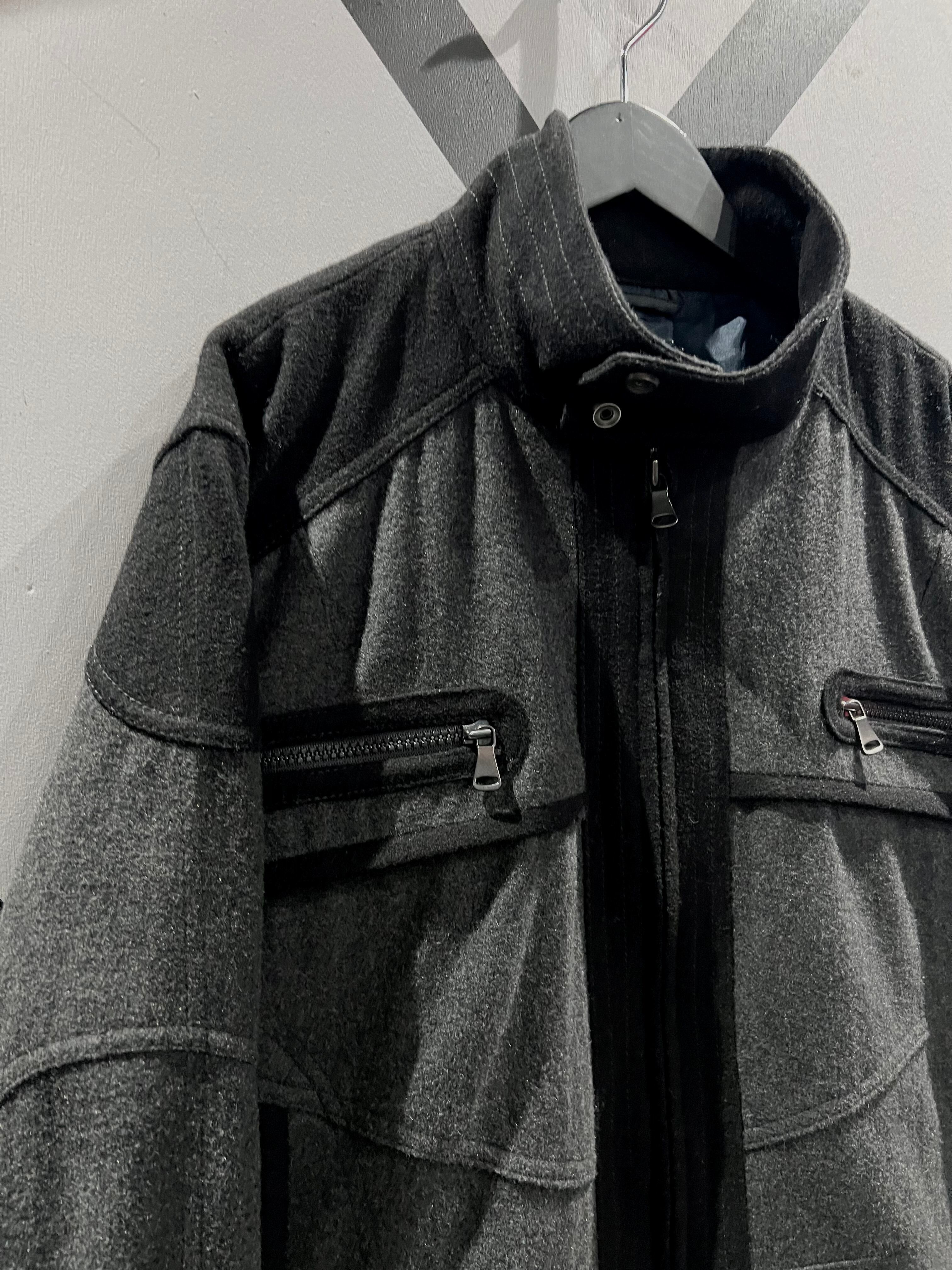 グレーの目の詰まったウールボディに、シンメトリーにブラックカラーを切り替えたジップアップジャケット。