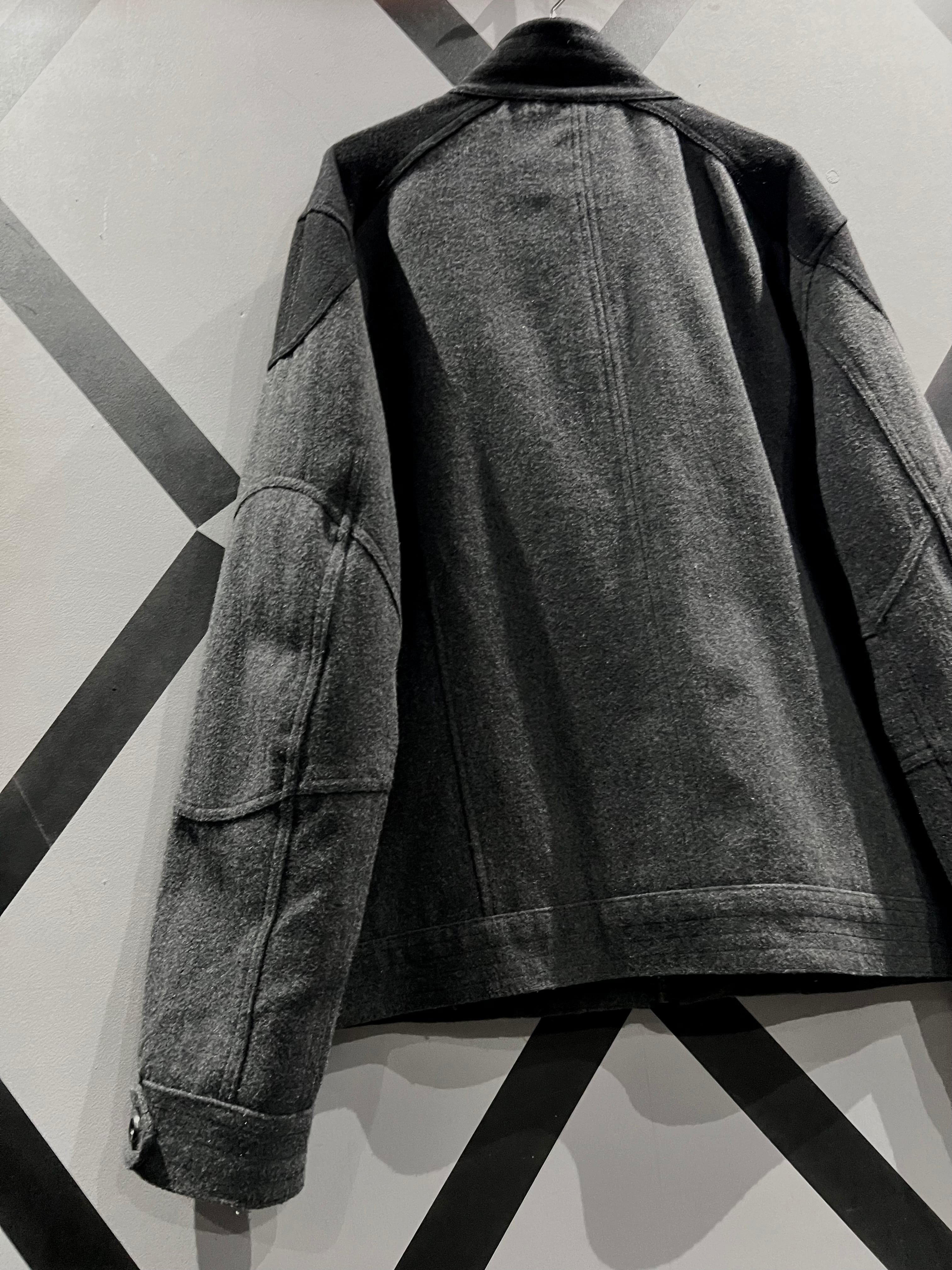 モノトーンのカラーリングながらカラーや生地の切り替えが立体感を演出。カジュアルなウール素材を用いたアイテムですが、モードな雰囲気を漂わせています。