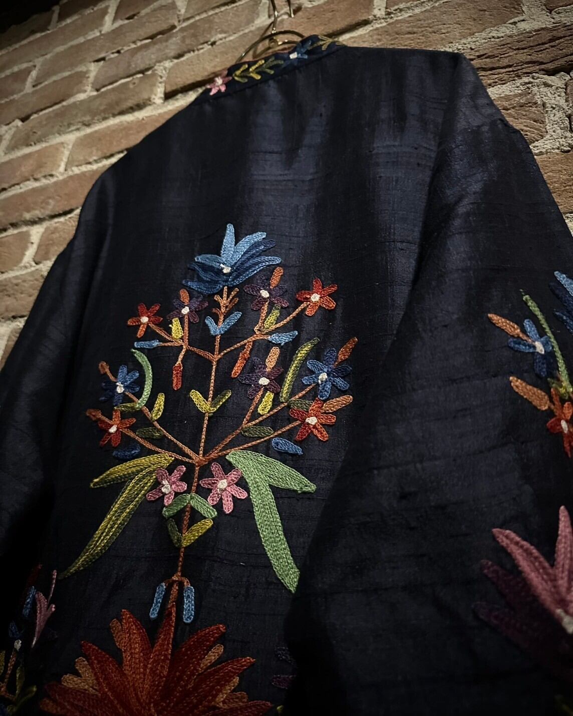 ブラックベースの中に咲く色とりどりの花々。刺繍が非常に緻密で繊細、その美しさに目と心の双方を奪われてしまいます、、、