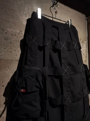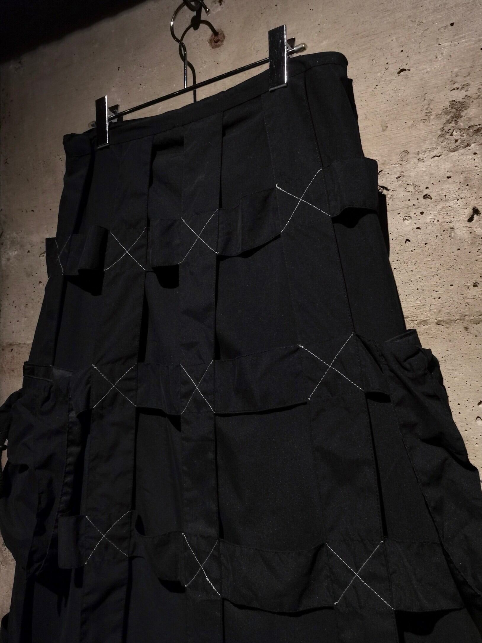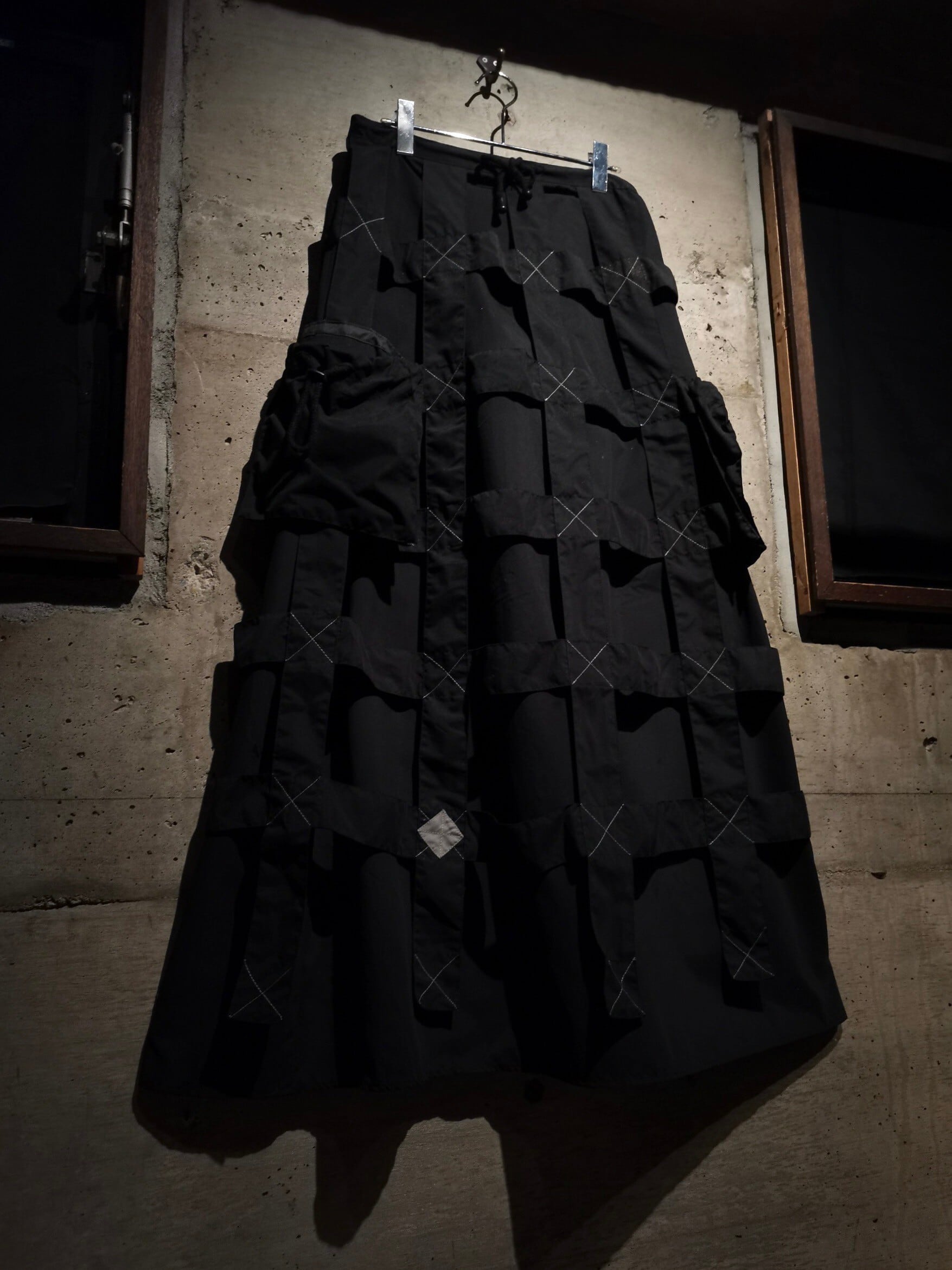 ハリのあるブラックのナイロン素材をベースに、同素材で格子状の生地をレイヤードさせたロングスカート形状。前後デタッチャブル仕様の、レイヤードデザインに加えて、大きめのポケット、白いステッチ等、細部までデザイン性溢れた1着。