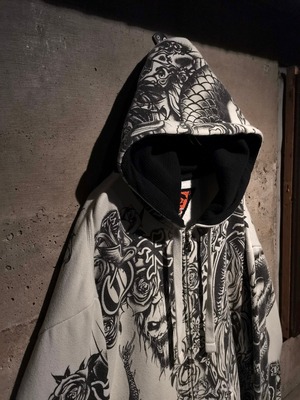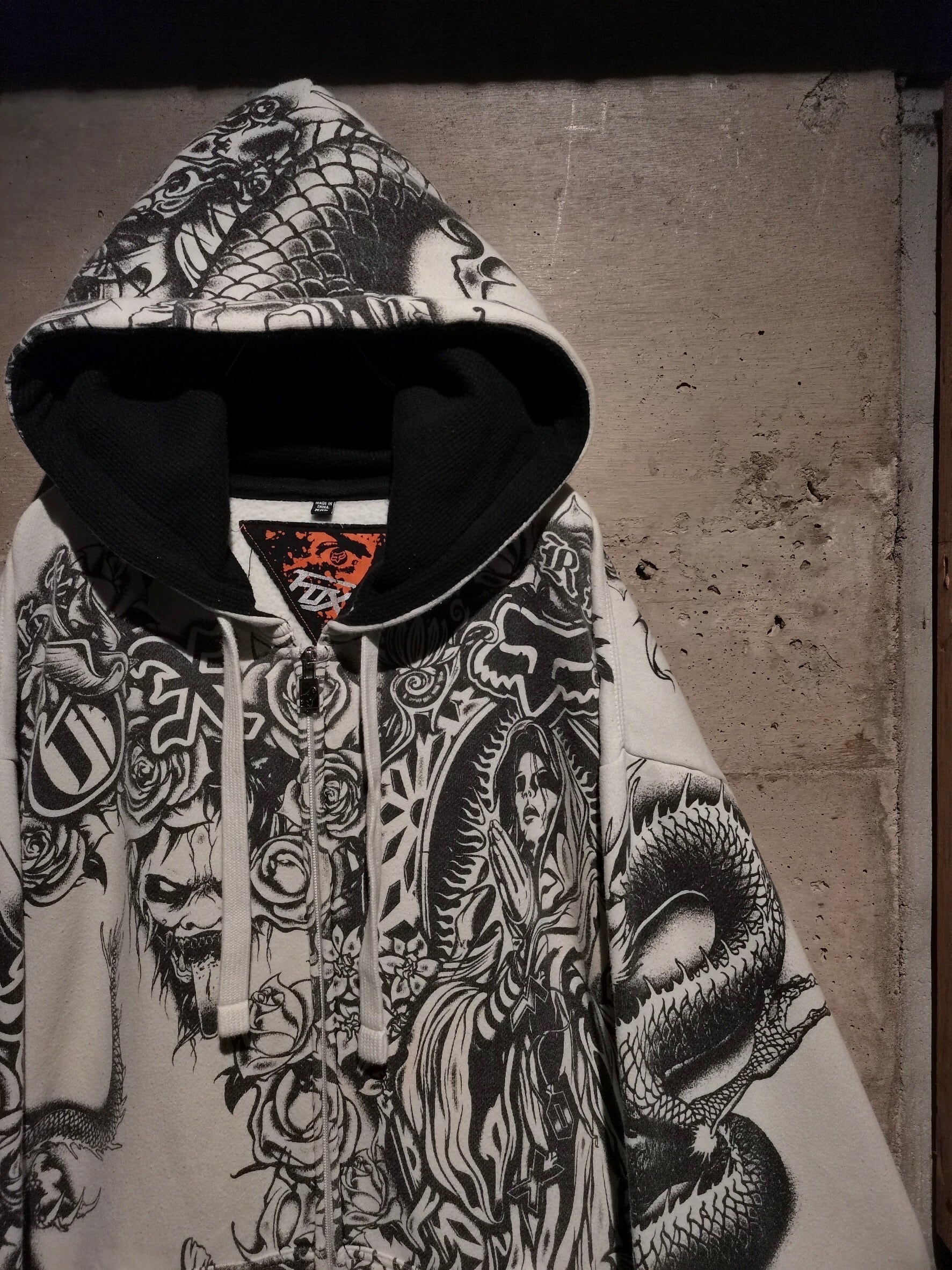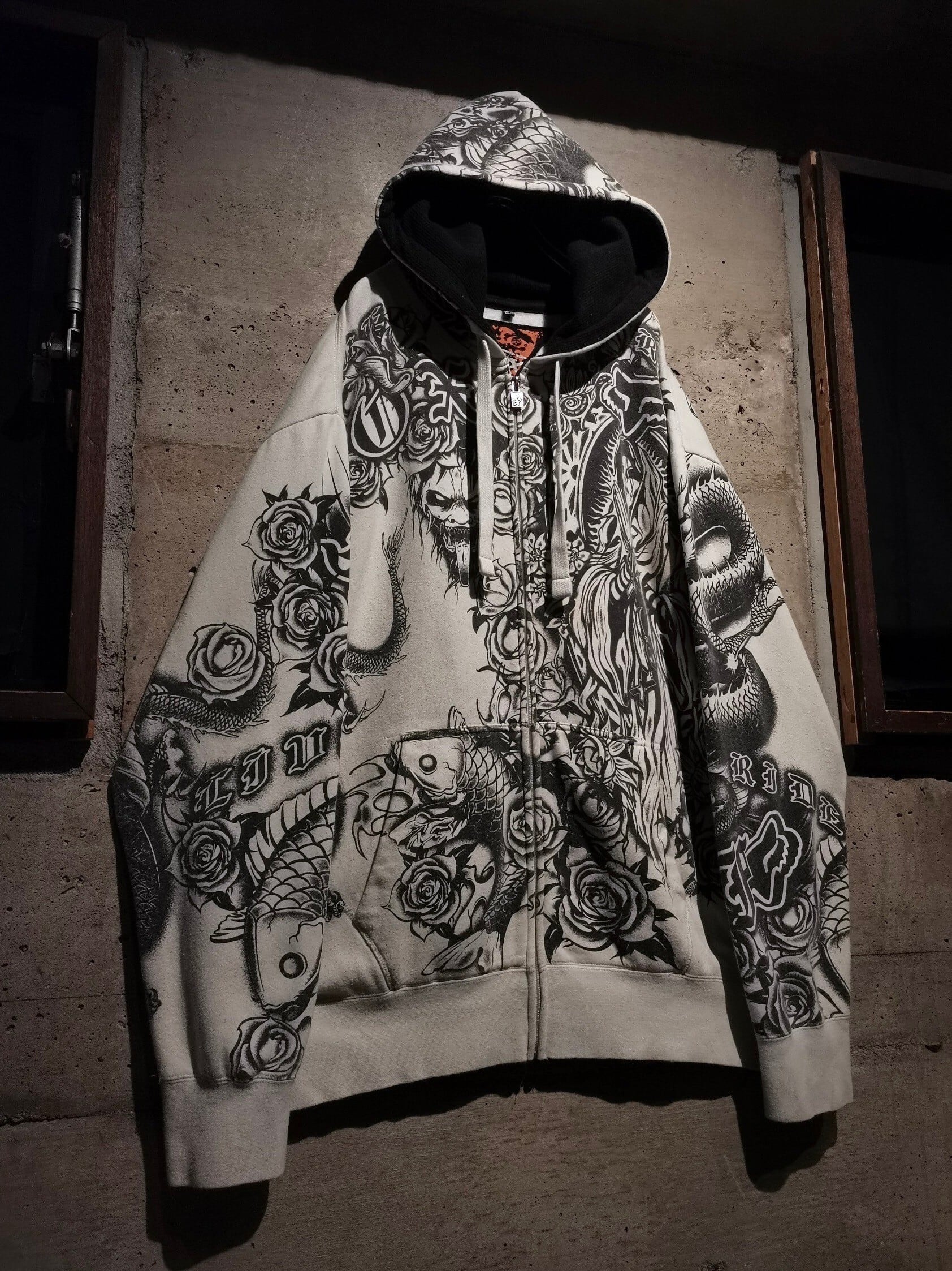 真っ白のボディに、数多なるタトゥーグラフィックのデザインをプリント。これはカッコ良すぎる、、複数のブランドで注目されたタトゥーデザインですが、古着でここまでノリがいい個体が出ることは稀。言うまでもなくスペシャルです。