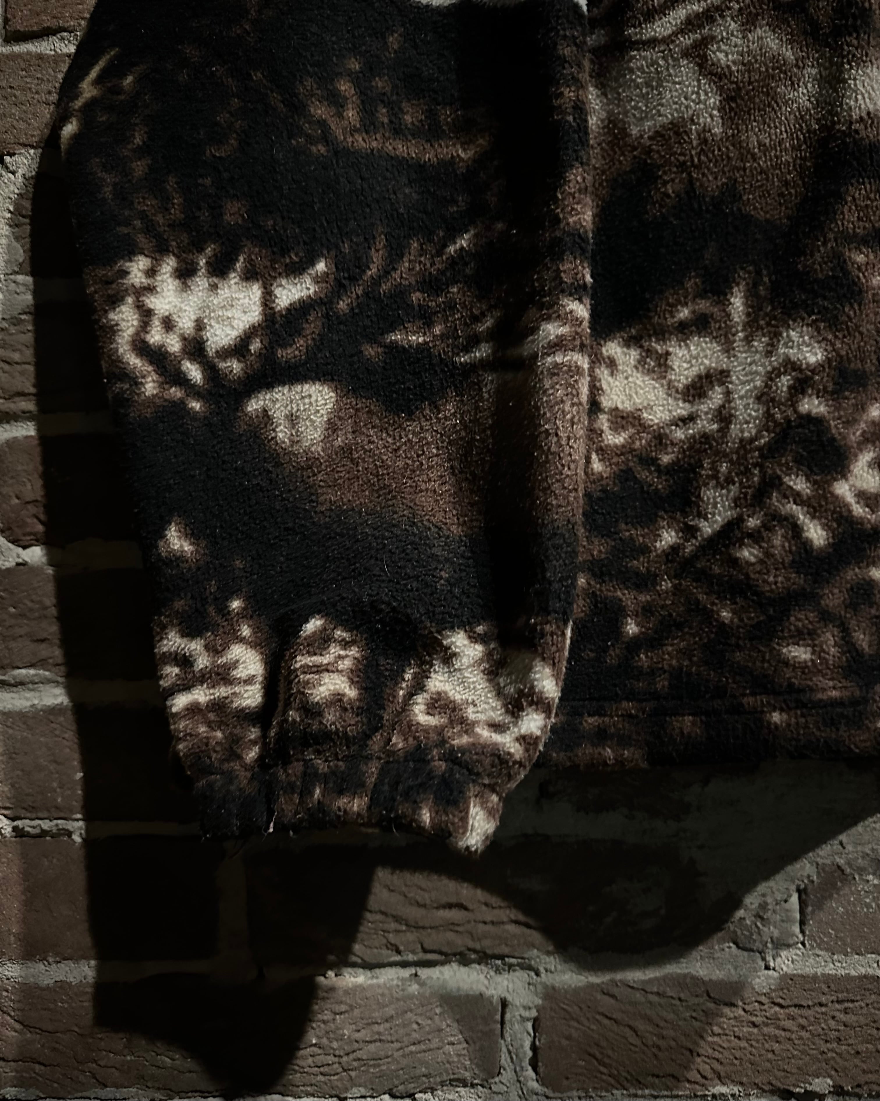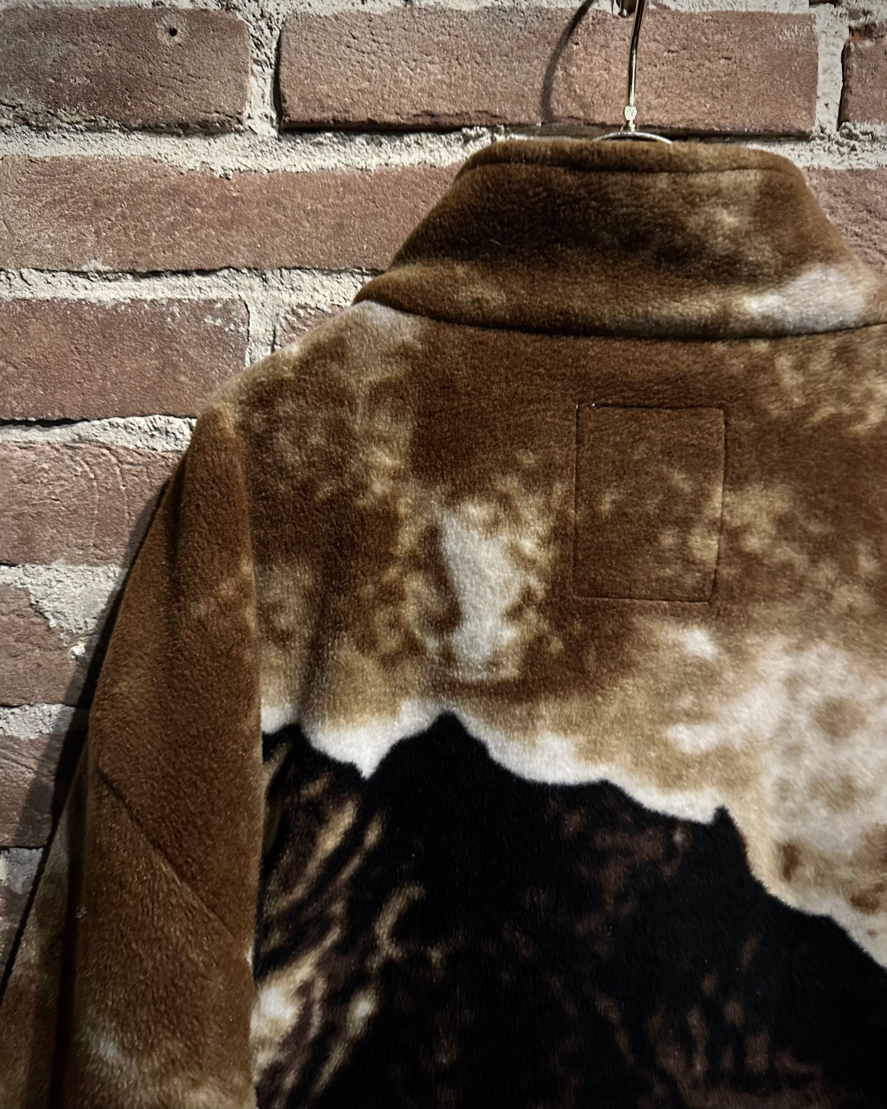 フワッと心地の良い軽く柔らかな毛足のボディに、フロント、バック、そしてアームの全面に山に佇む鹿のデザインを載せたフリースジャケット。