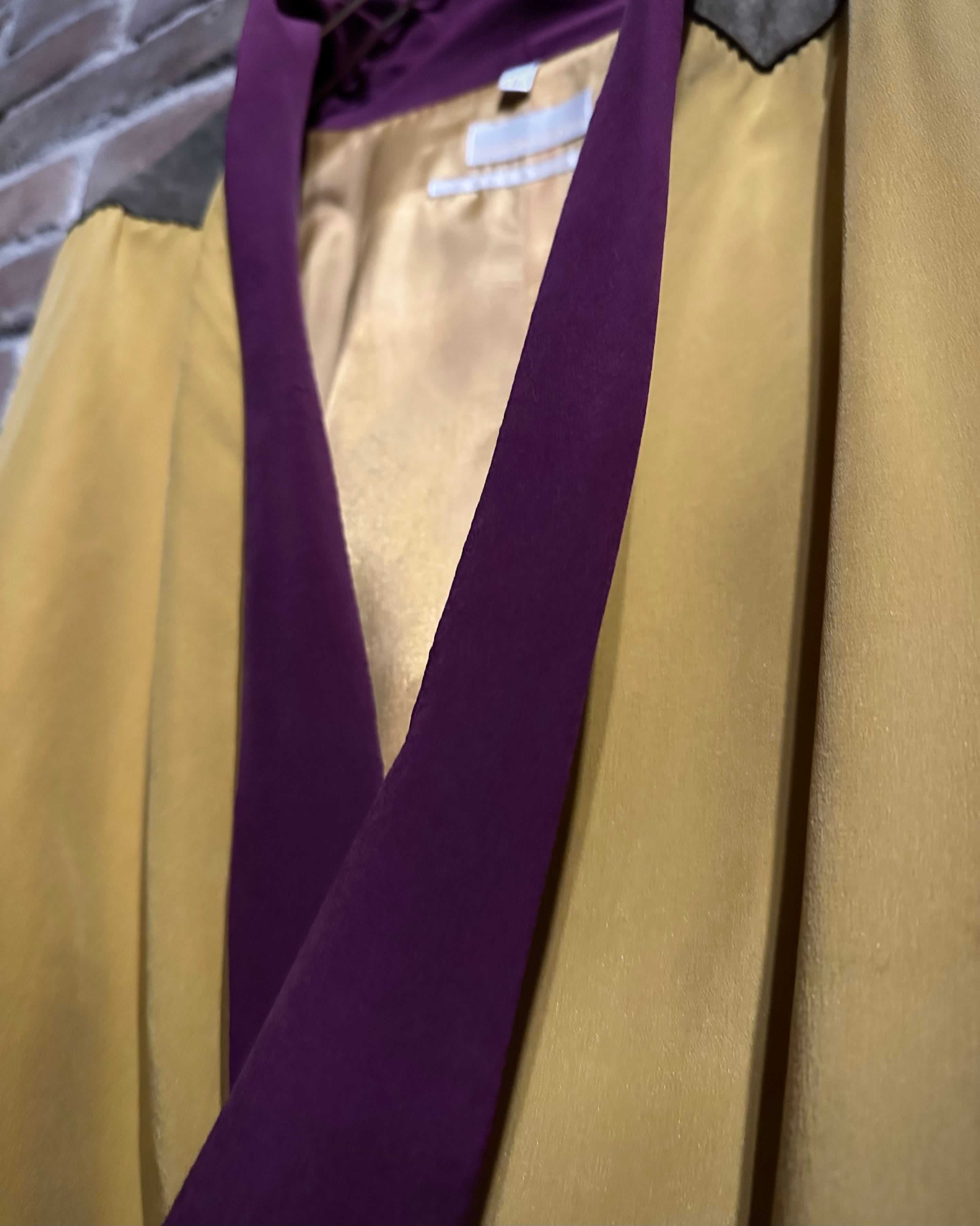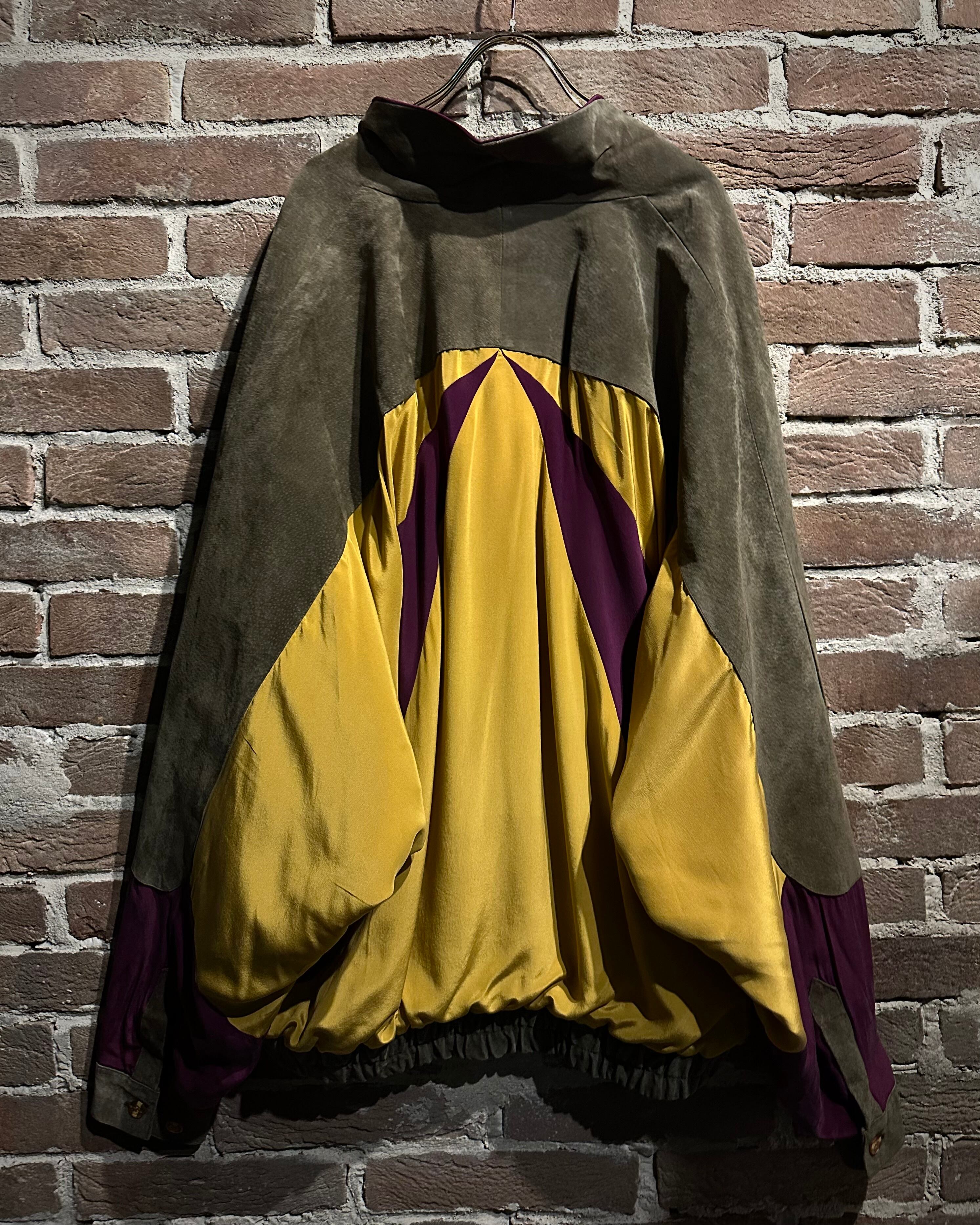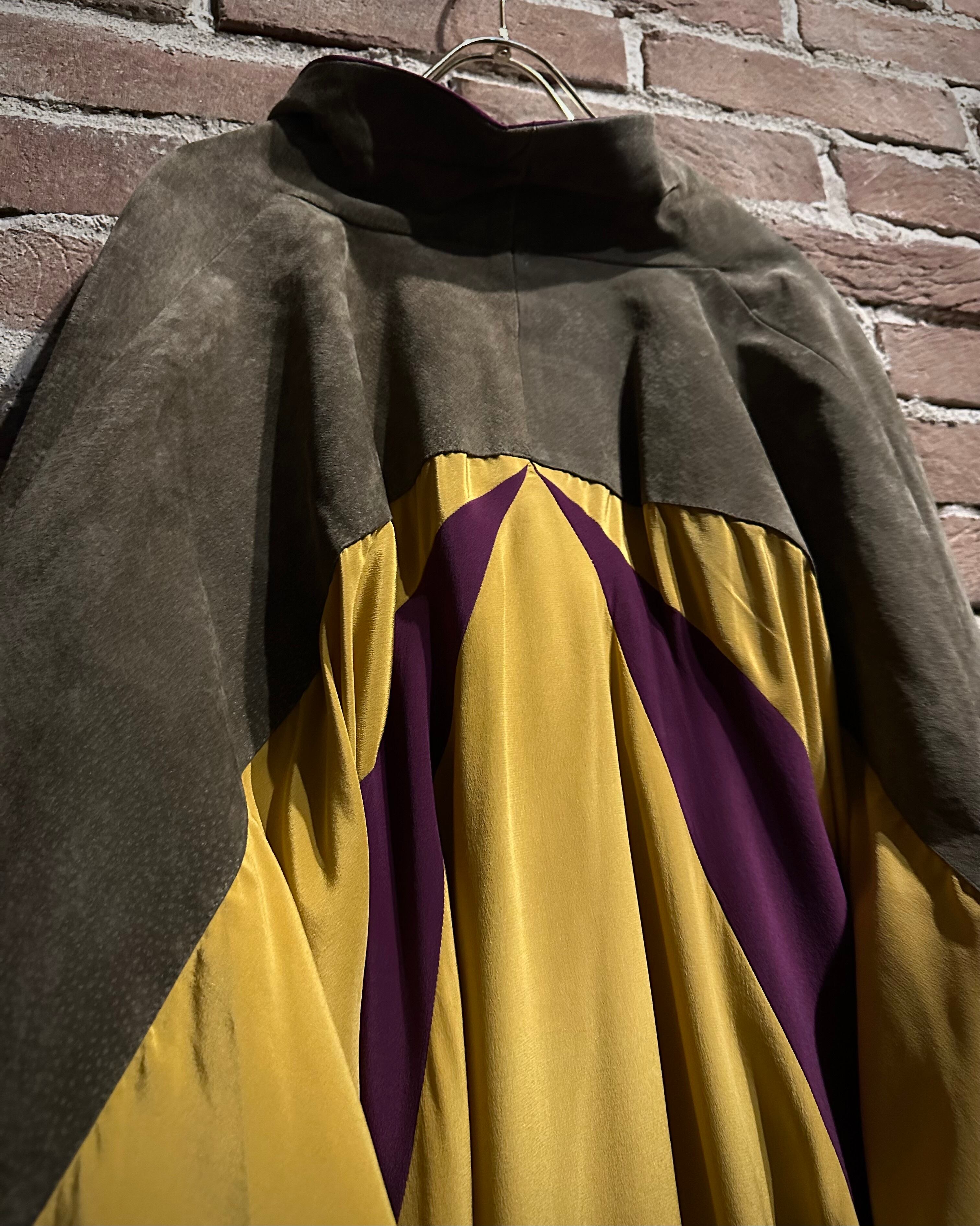 パキッとした黄色と紫のシルクと緑のスエードの切り替えバランスが素晴らしい…