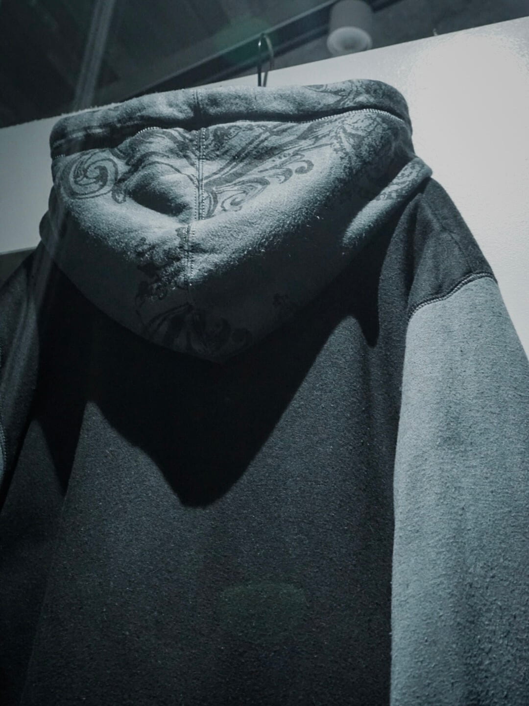 フェード感の良いブラックのボディをベースに、鳥やエンブレムを、プリントしたし当店らしいエッジの効いたジップフーディー。