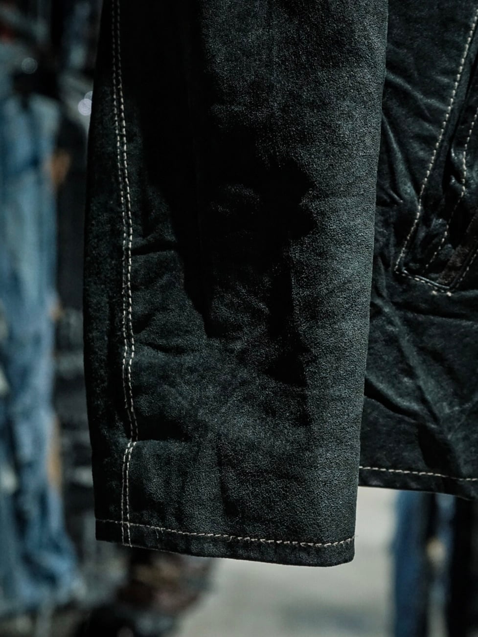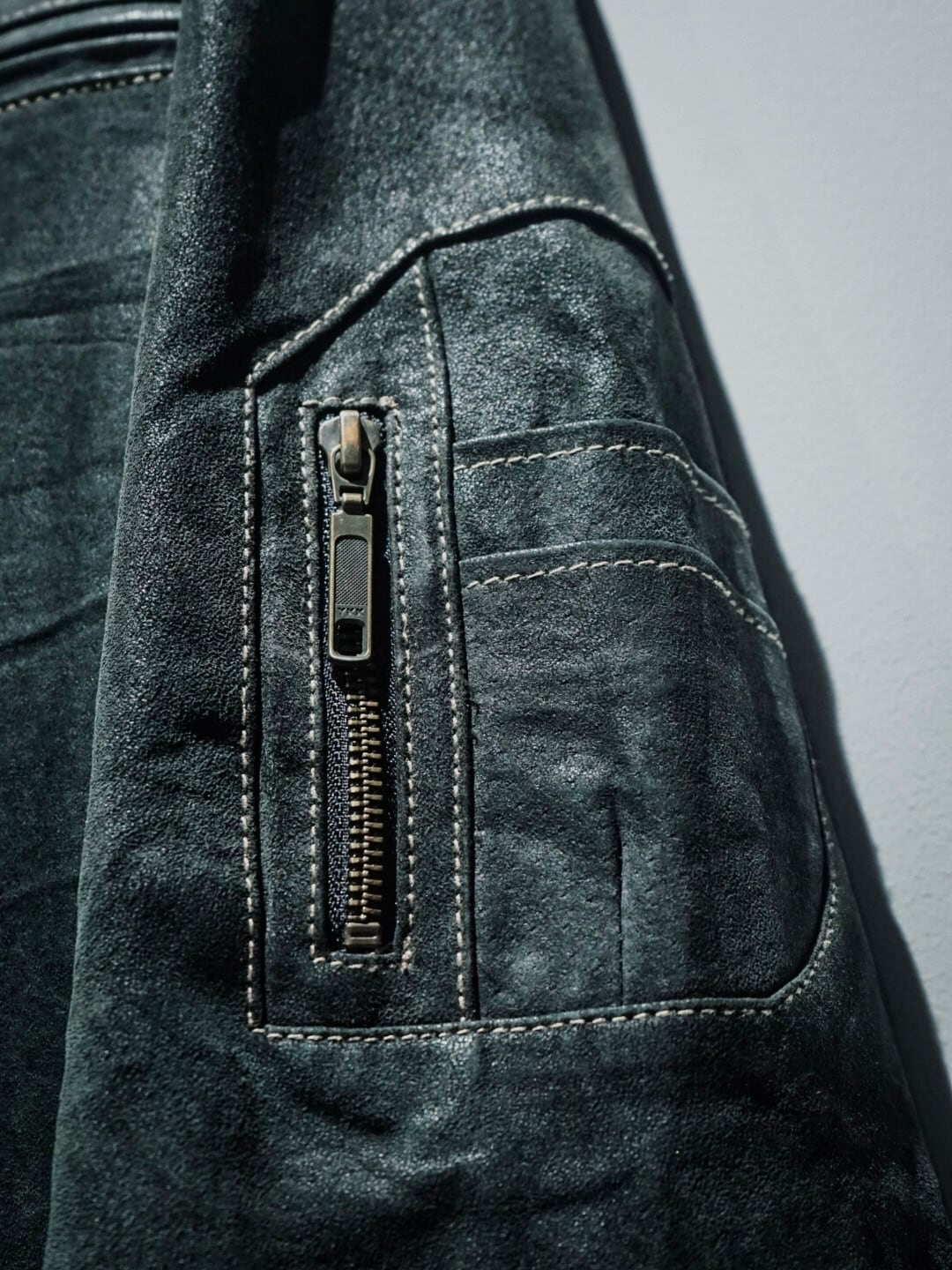 パリッとハリのある、起毛感のある上質なスエードを用いたボディを用いて当店らしいテクニカルなデザインを落とし込んだレザージャケット。