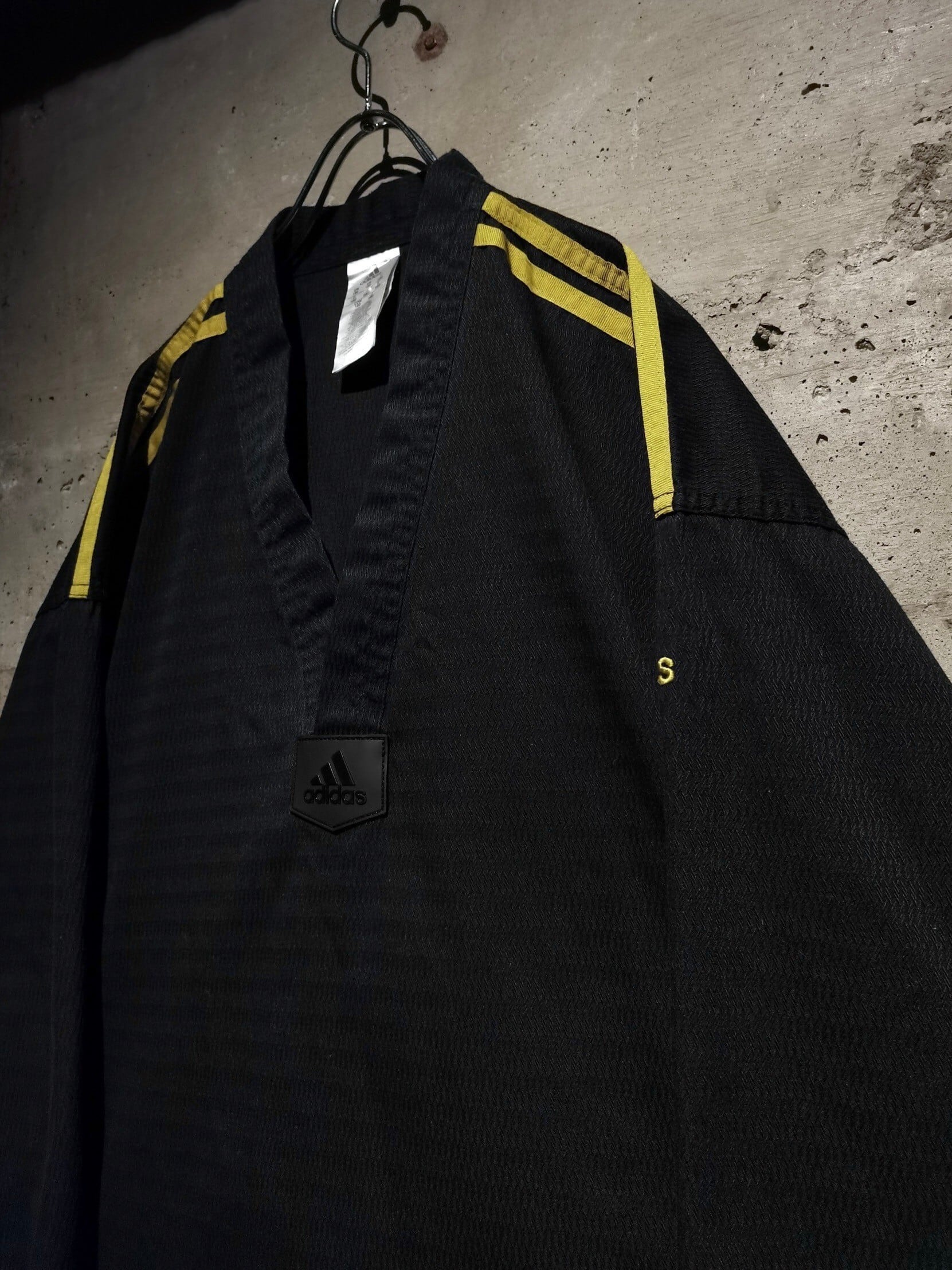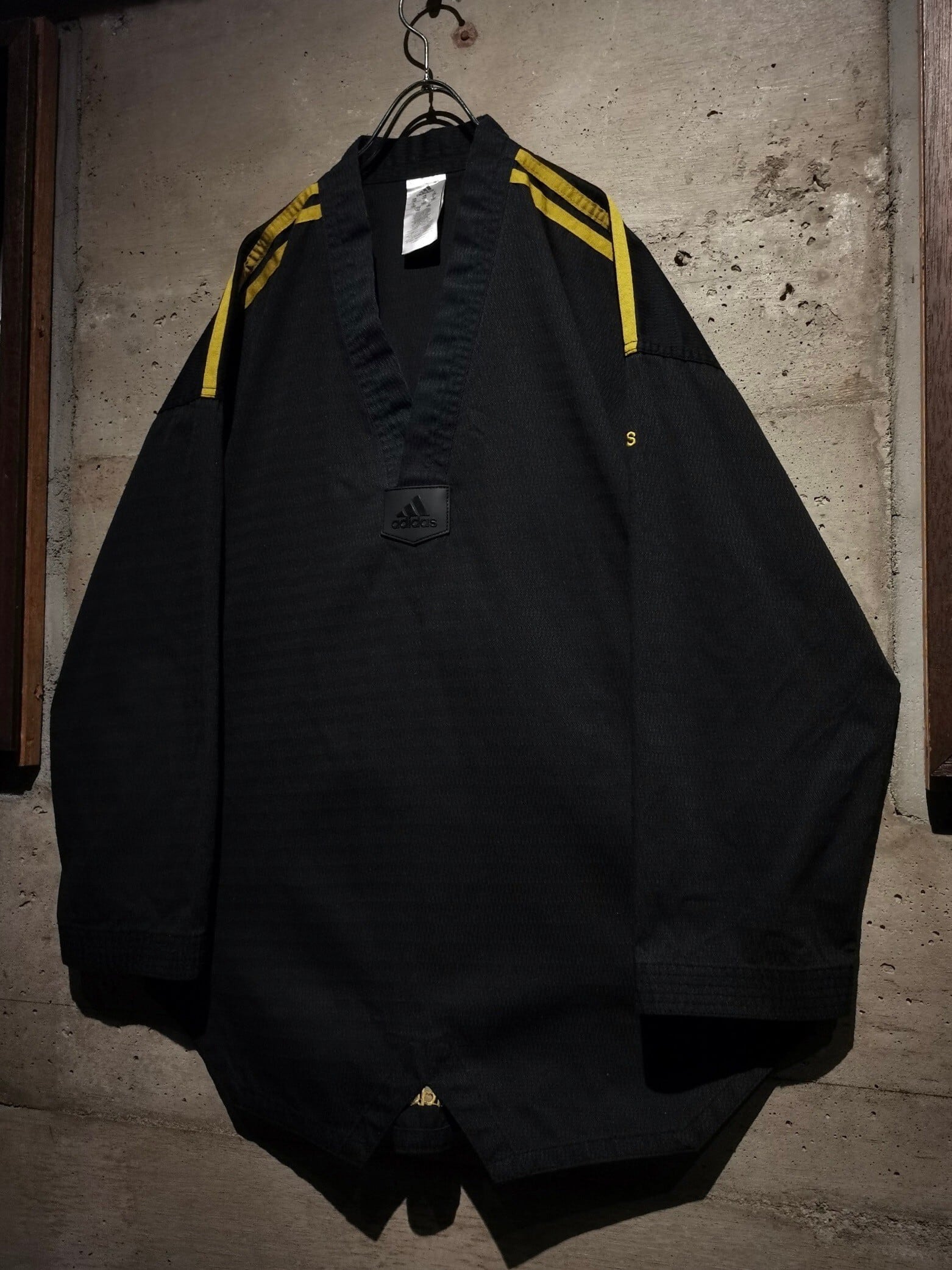 道着らしいハリのあるブラックのボディに、肩には3ストライプス、左袖、背面裾にはロゴ刺繍、背面にプリントを載せた90's adidasの1着。