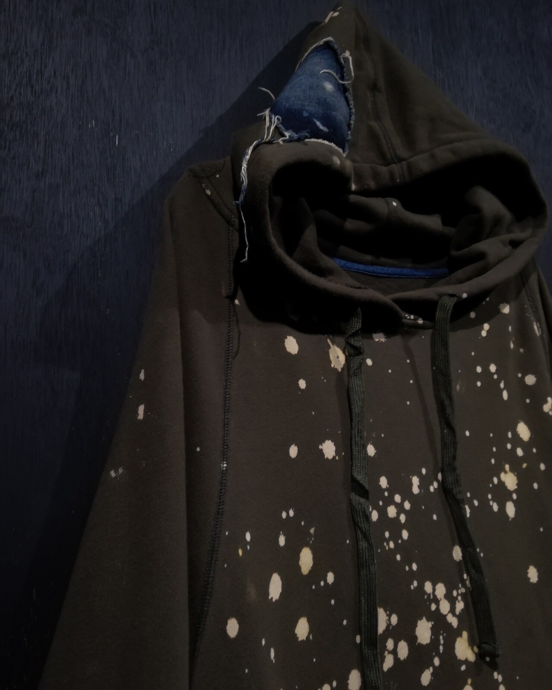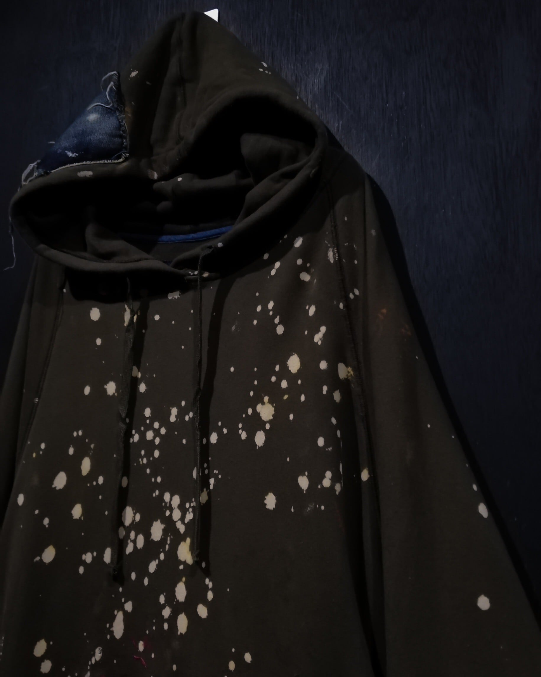 カーキのボディをベースにフェード感の良いデニムをドッキング。さらにペイントを散らした、前所有者によるリメイクフーディの逸品。