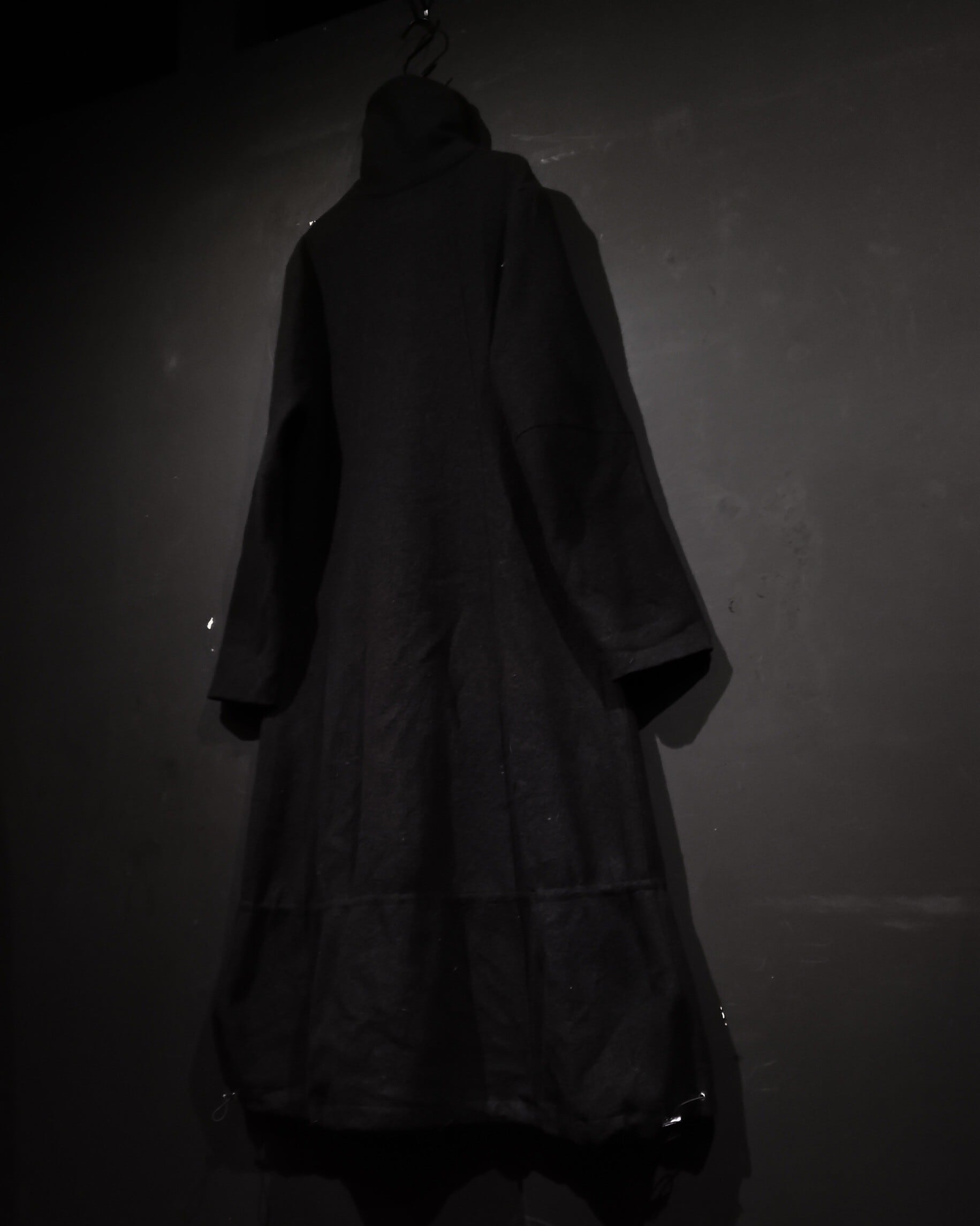 ギュッと目の詰まったウールを用いたボディに、フロントにはハの字のジップ、裾付近にドローコードなどのギミックを盛り込んだ、スタンドカラーのウールコート。