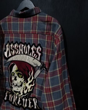 インディゴ、赤色などを掛け合わせたチェック柄を載せたボディをベースに、左胸、背面にハートの目をした死神のワッペンを載せた長袖シャツ。
