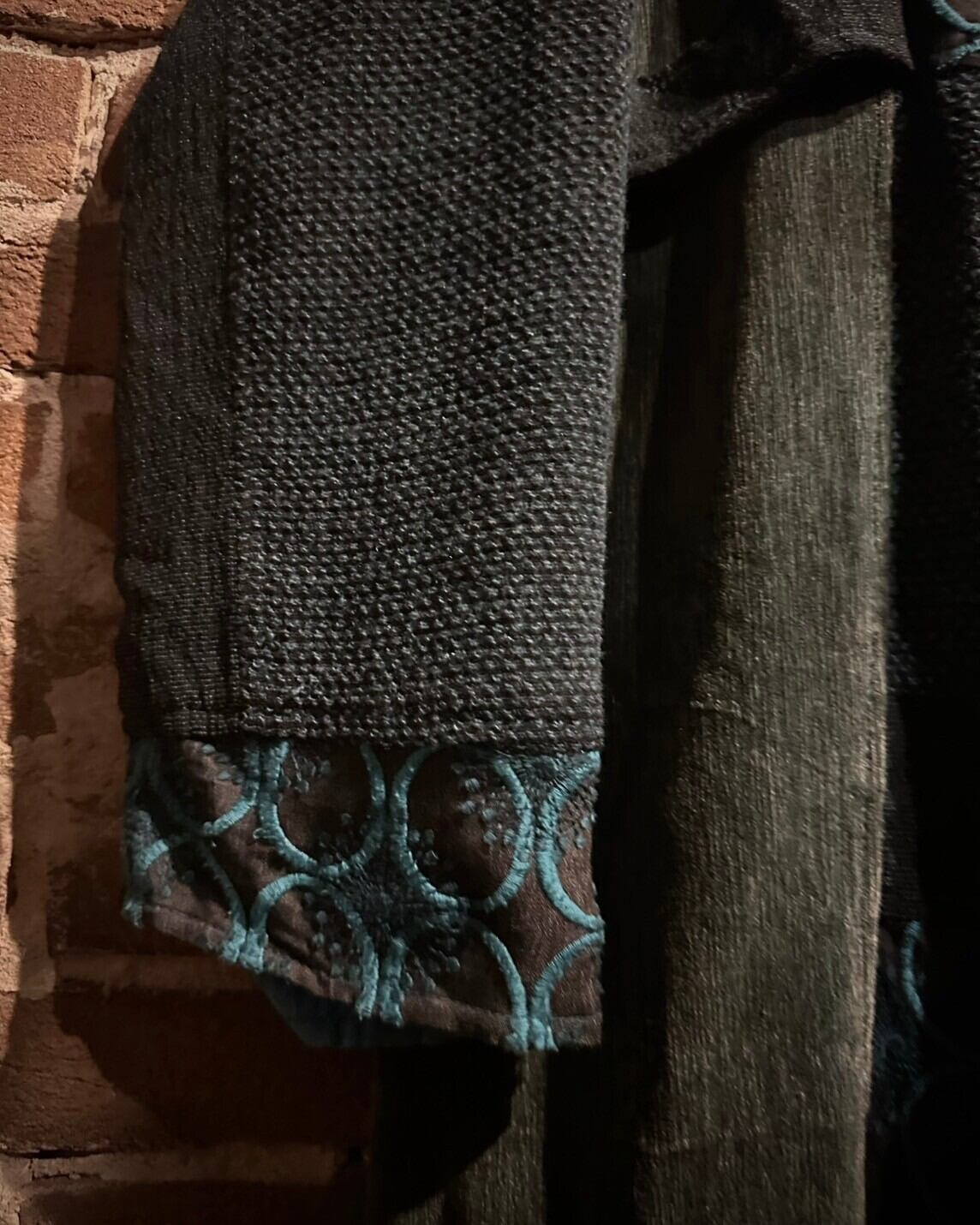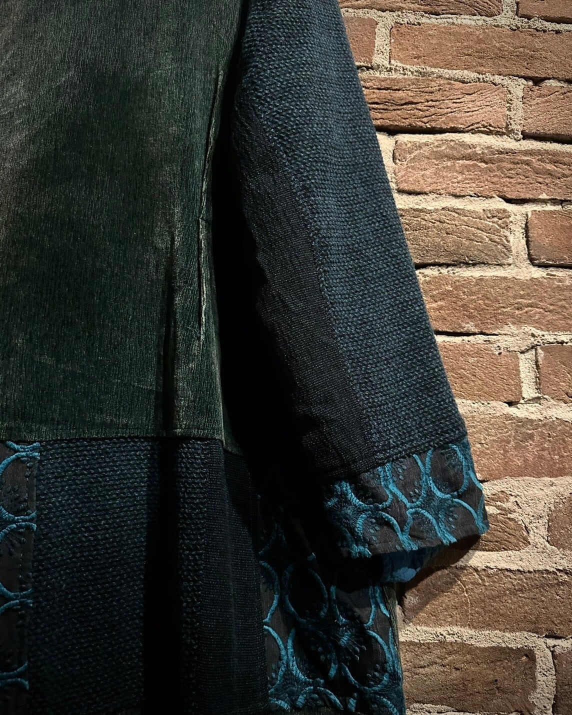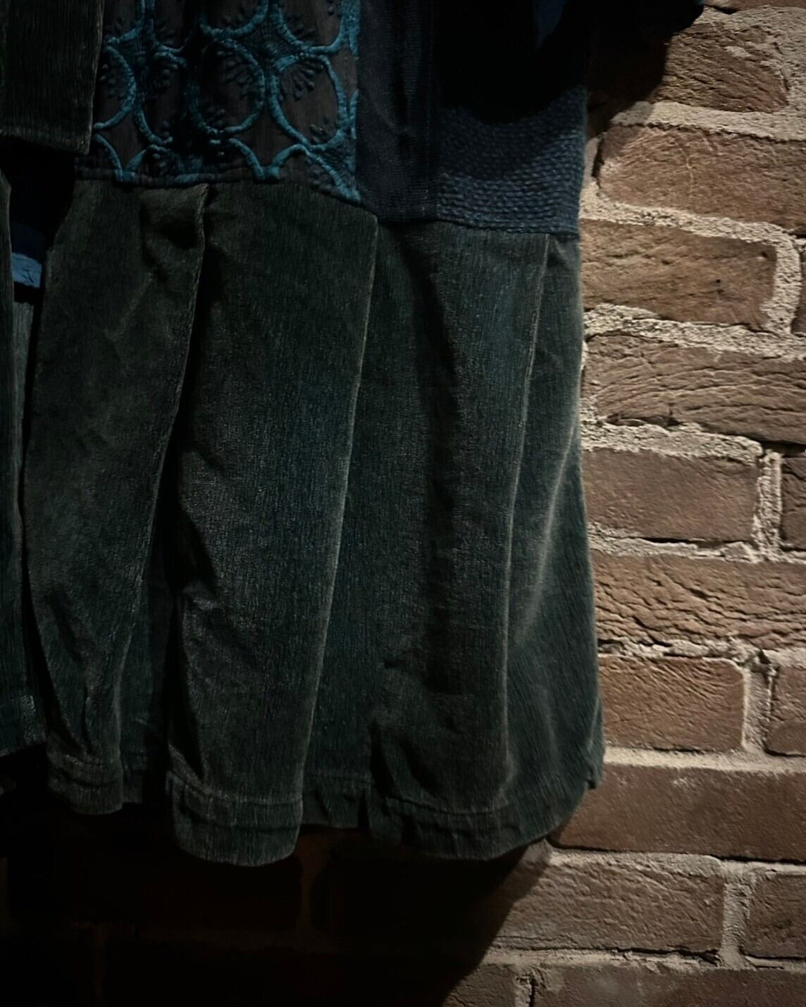 鹿子やシェニール、刺繍を施した生地などを用いて、パッチワーク風にデザインに落とし込んだロングコート。