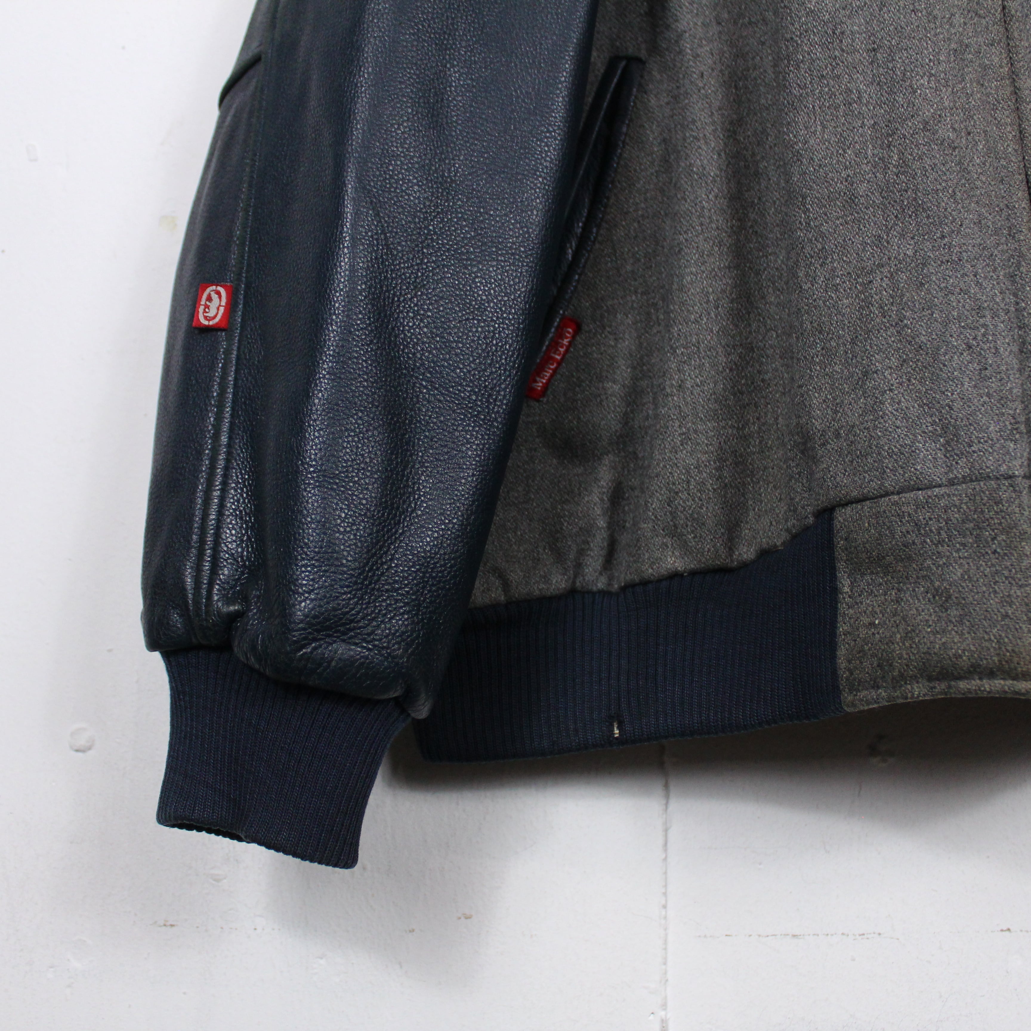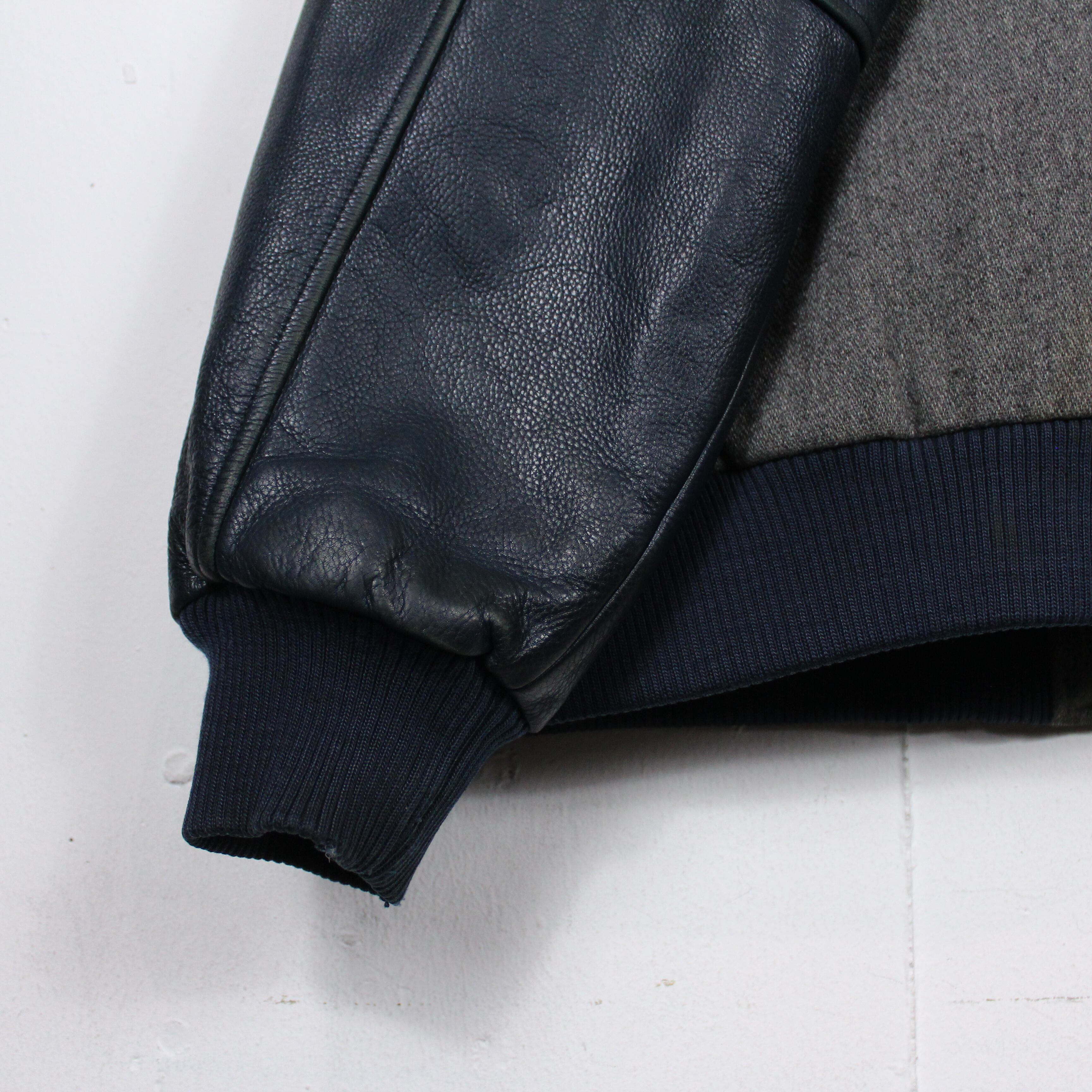 上質なウールを使用したグレーカラーをベースとし、襟や袖、ポケット部分に鈍い光沢を放つネイビーのレザーを切り替えたスタジャン。