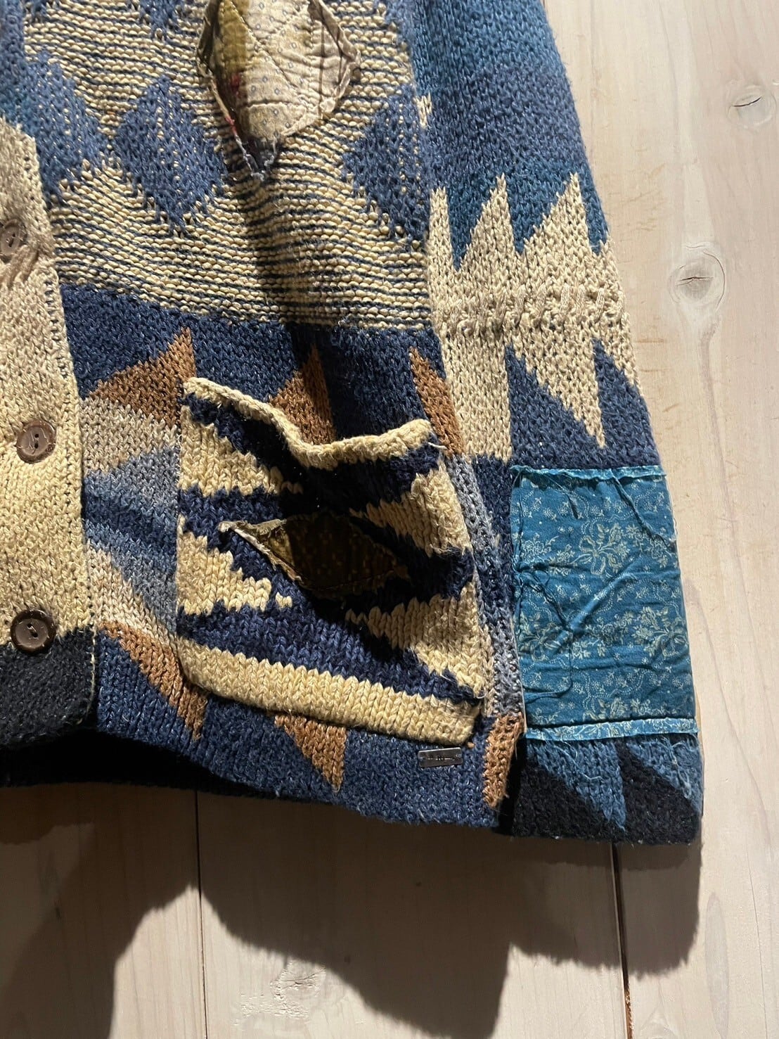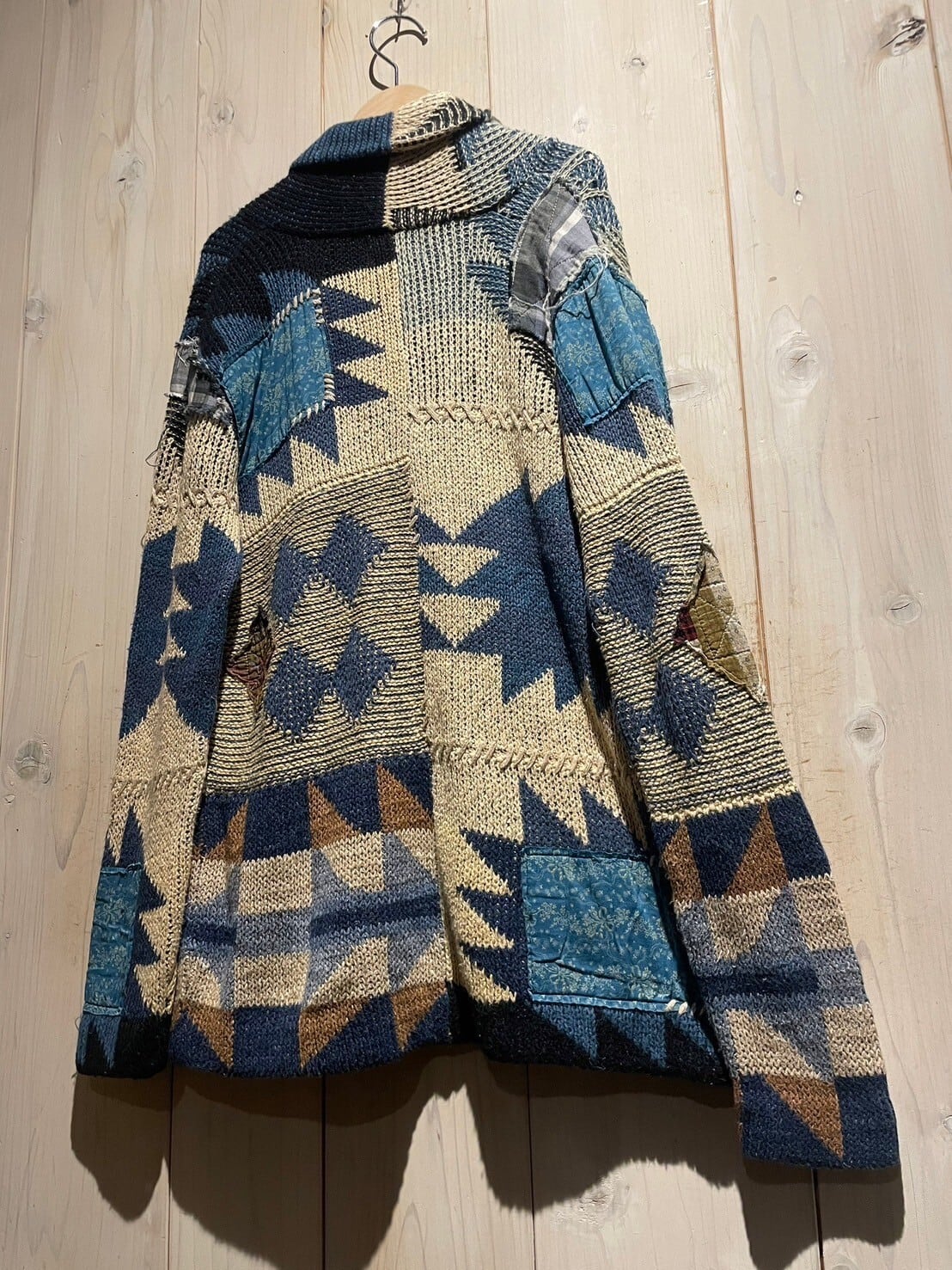 寒色と白のニット素材をベースに様々な柄を編み込み、随所に薄手の様々な柄のシルクスカーフを切り替えたニットジャケット。