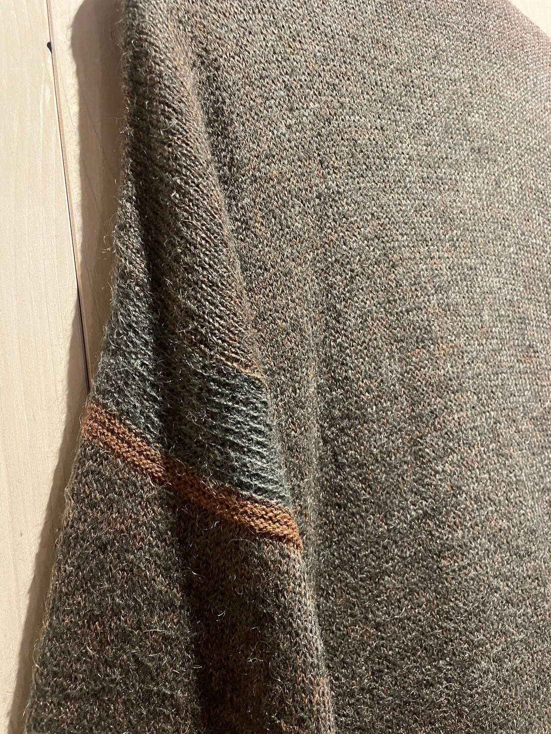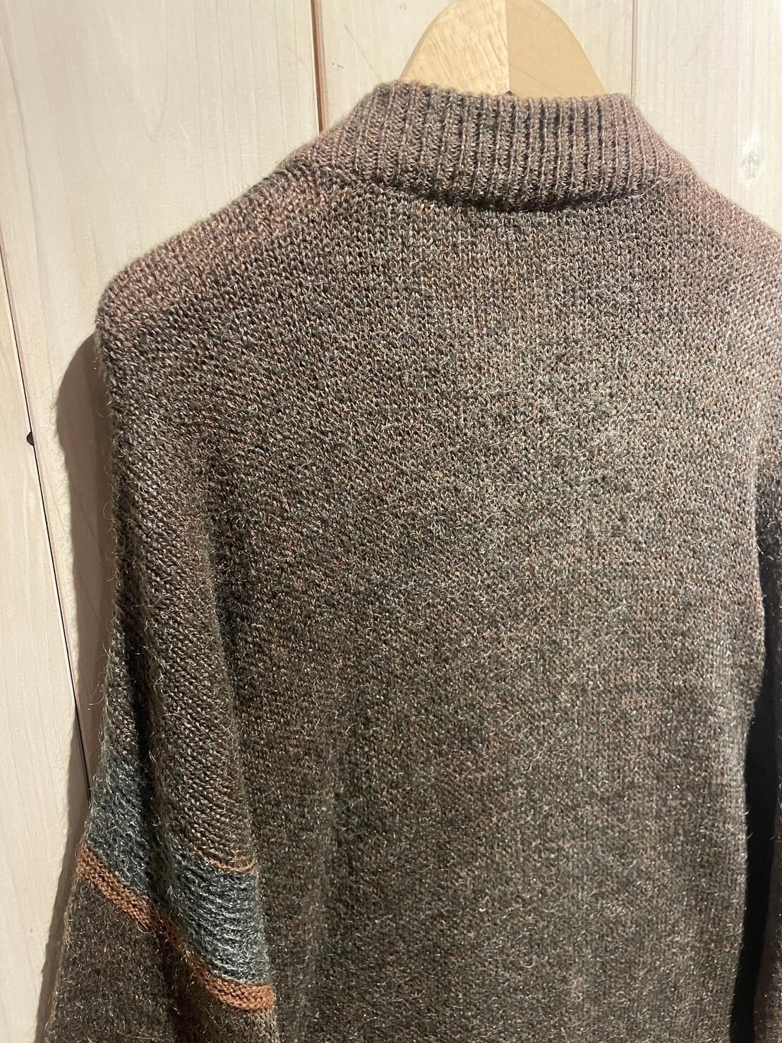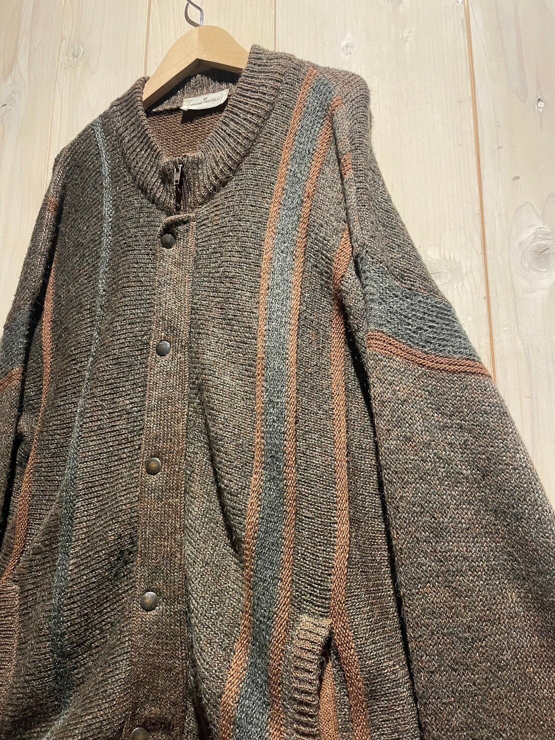 カーキカラーをベースとし、ブラウンやネイビーのカラーリングを組み込んだ深みのある表情を見せるニットボディに、ストライプ状の柄を配したニットジャケット。