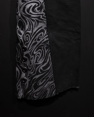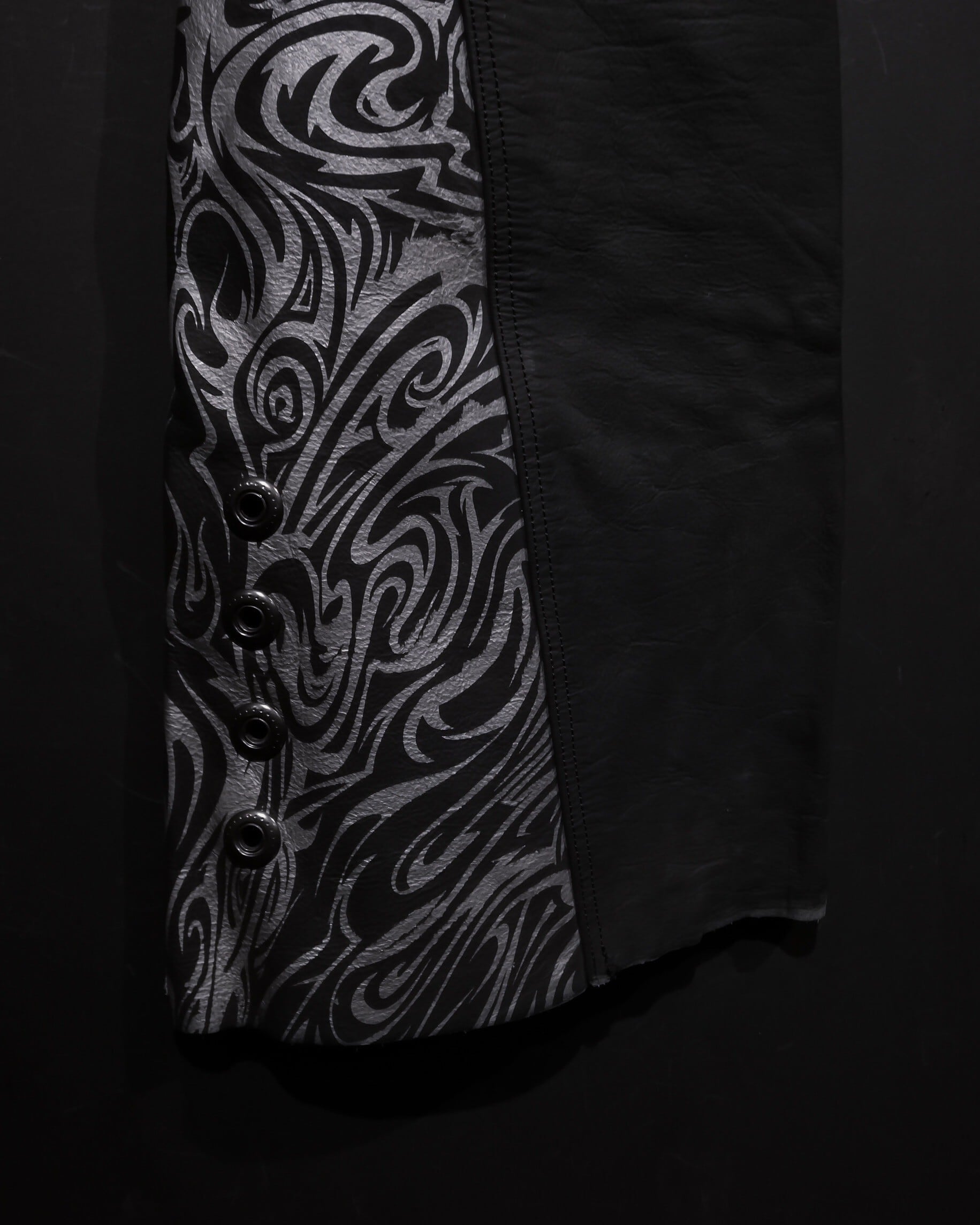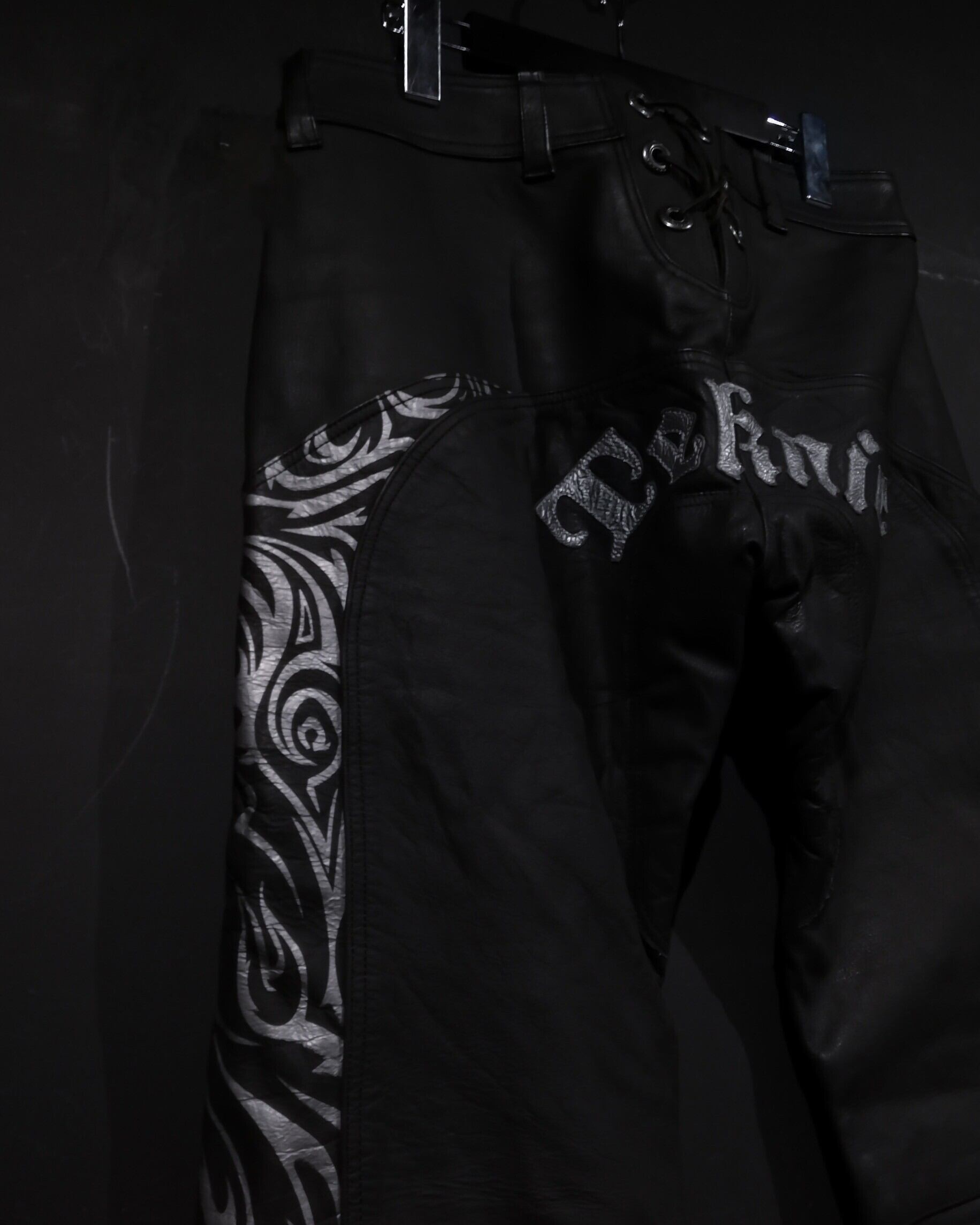 ガシッとした重厚感のあるカウレザーを使用したレザーフレアパンツ。左サイドにはシルバーのトライバル調のプリント、右膝、バックにはシルバーのレザーでブランドネームロゴを配したデザイン性に富んだ1本。