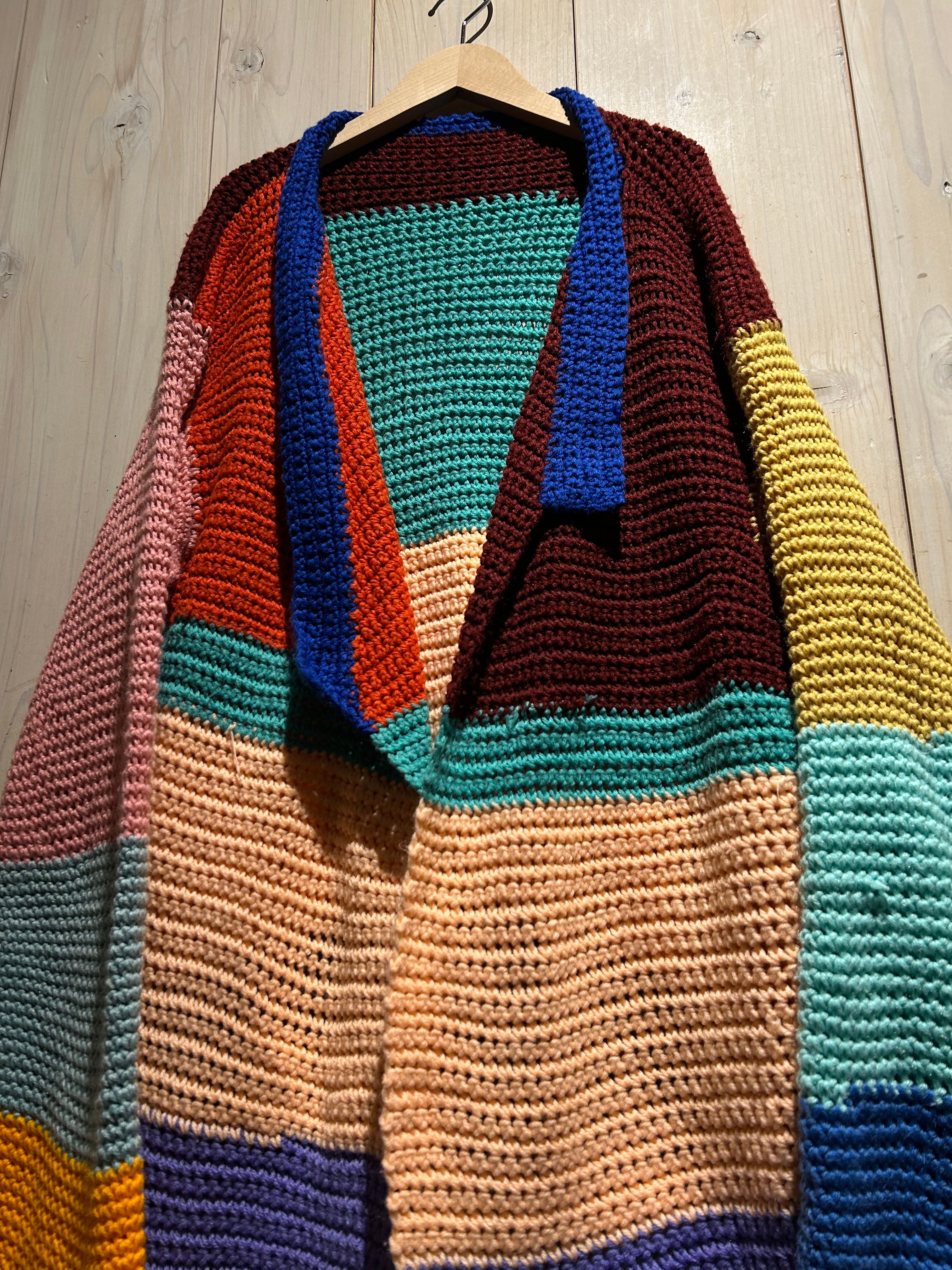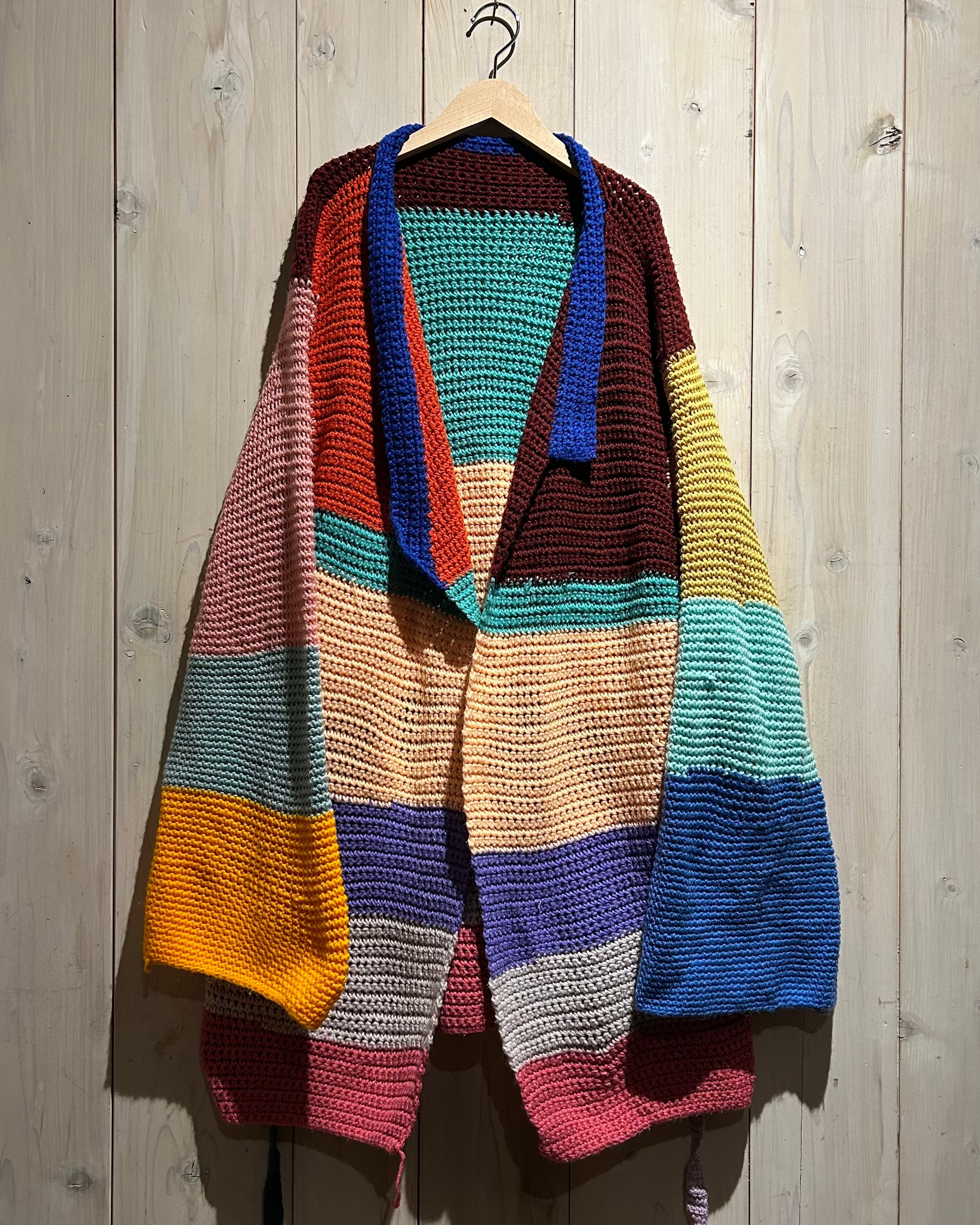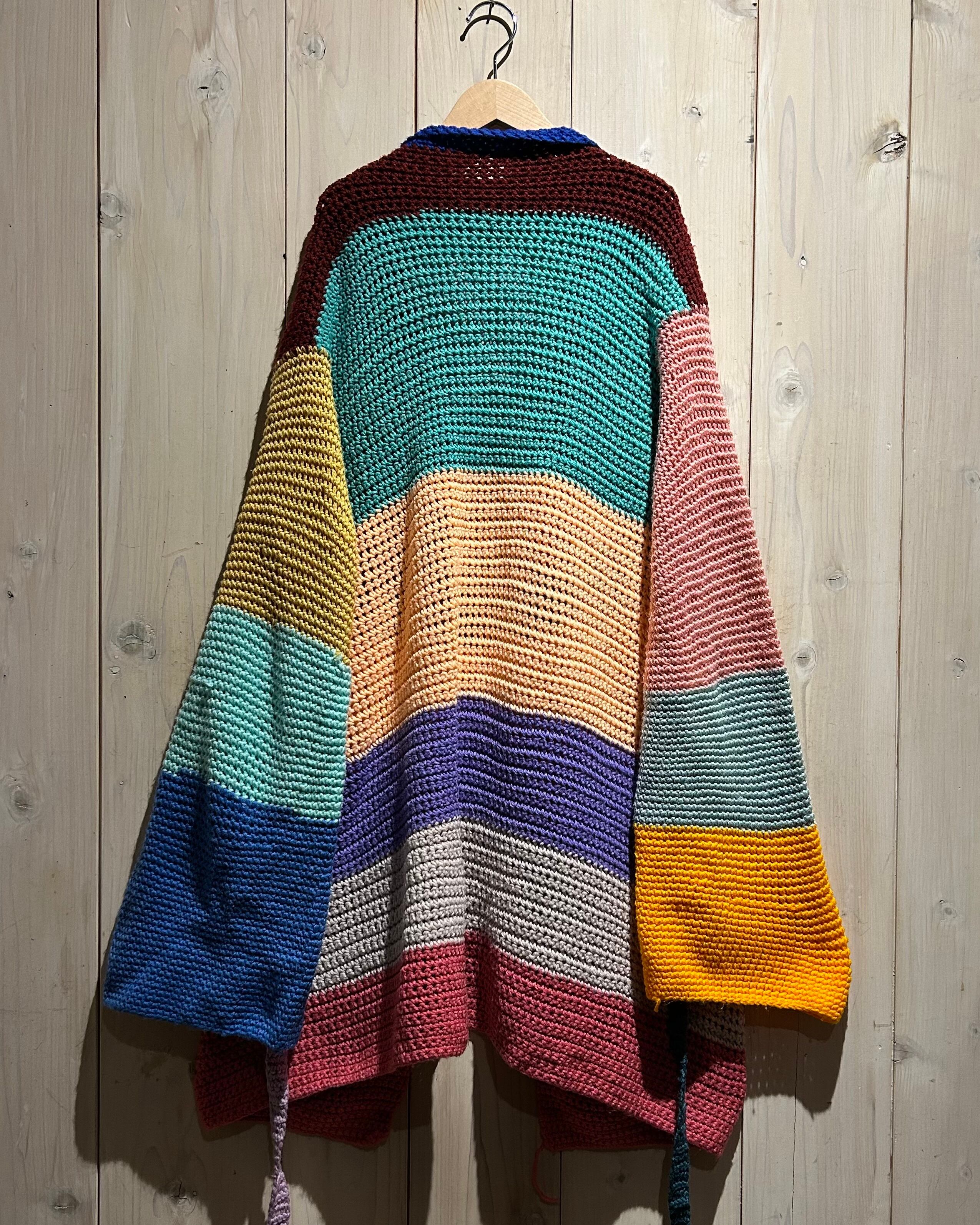赤、黄、青、オレンジ、緑等、パステルで鮮やかなカラーリングをボディに切り替えたニットの羽織り。