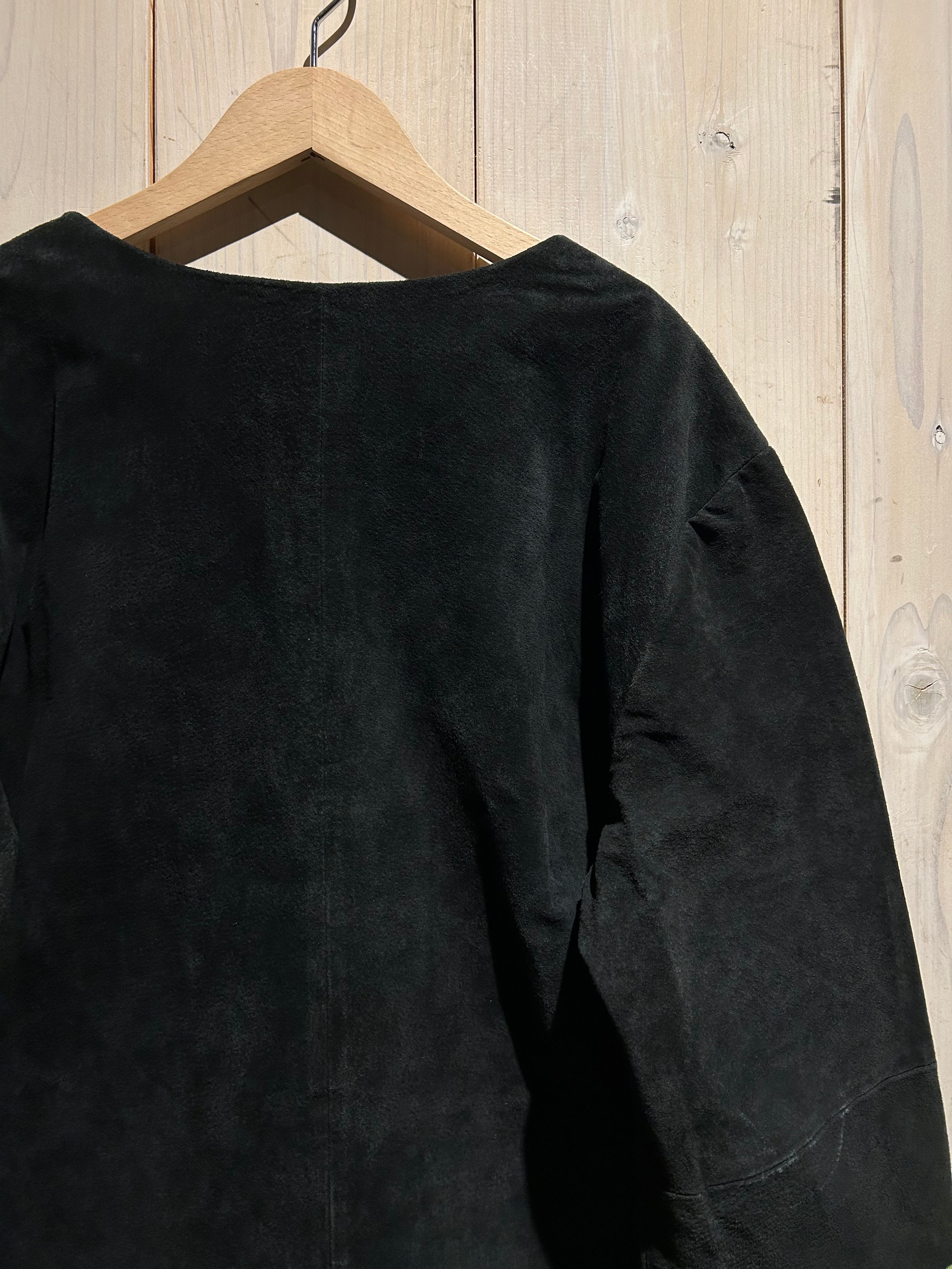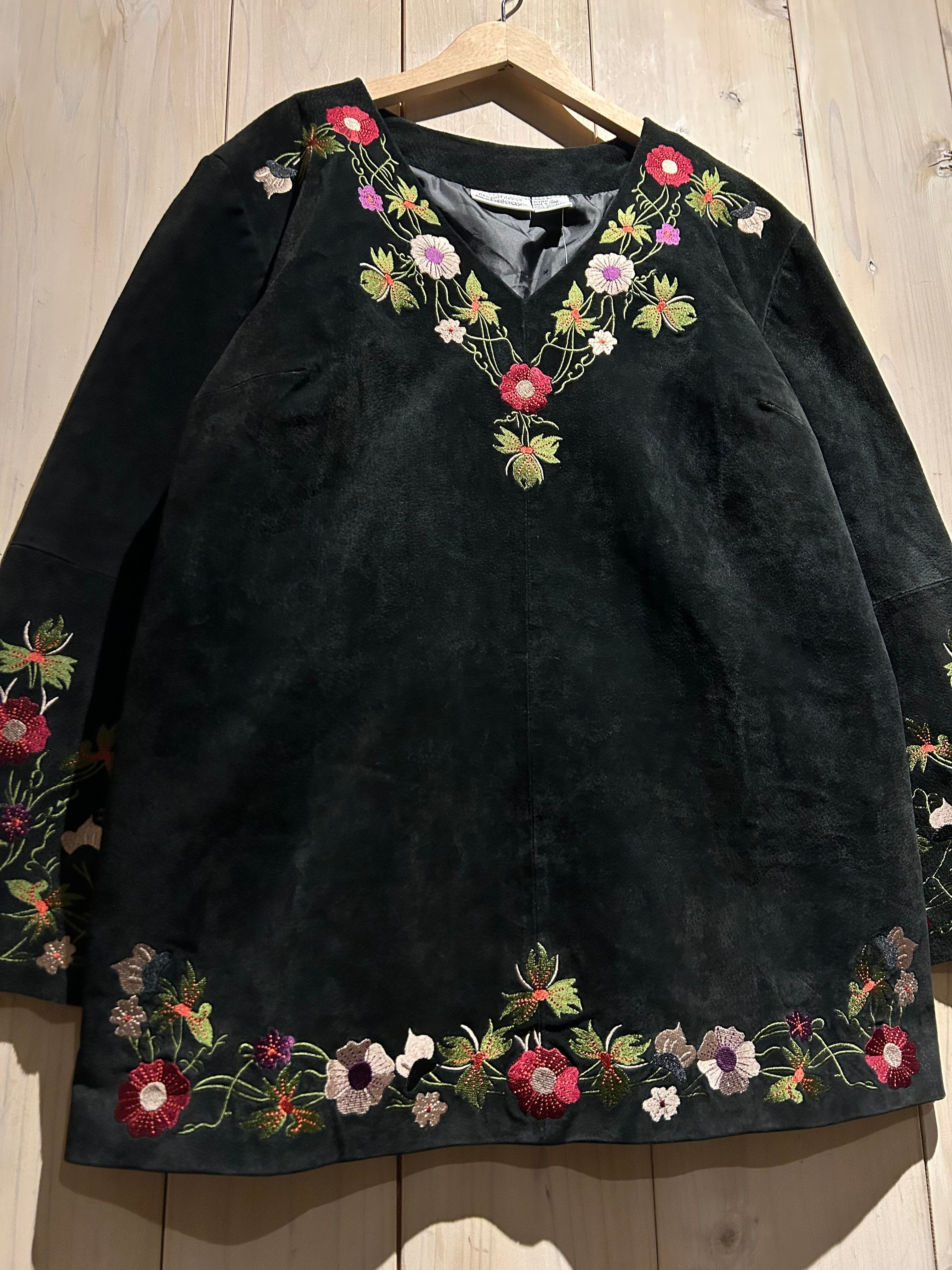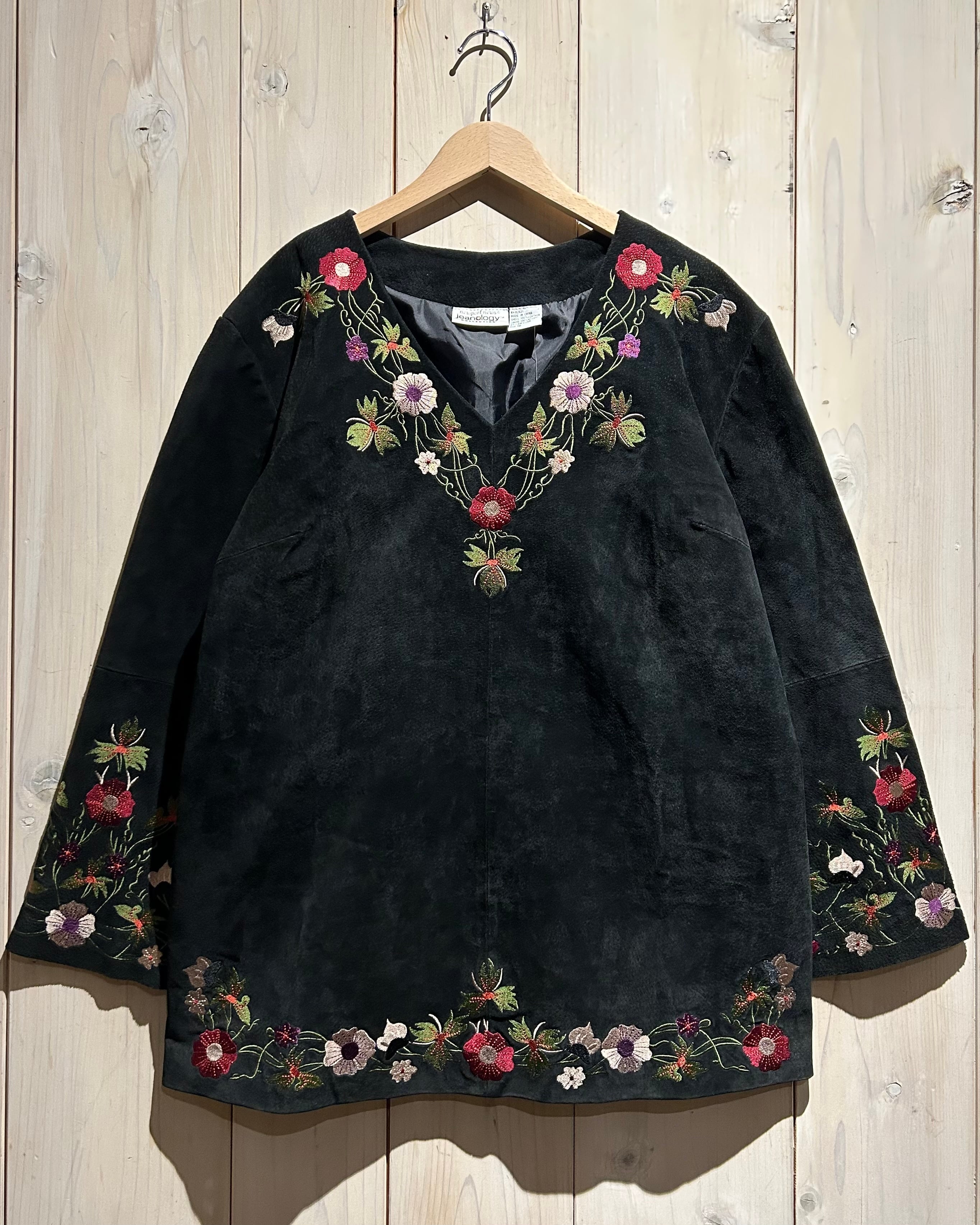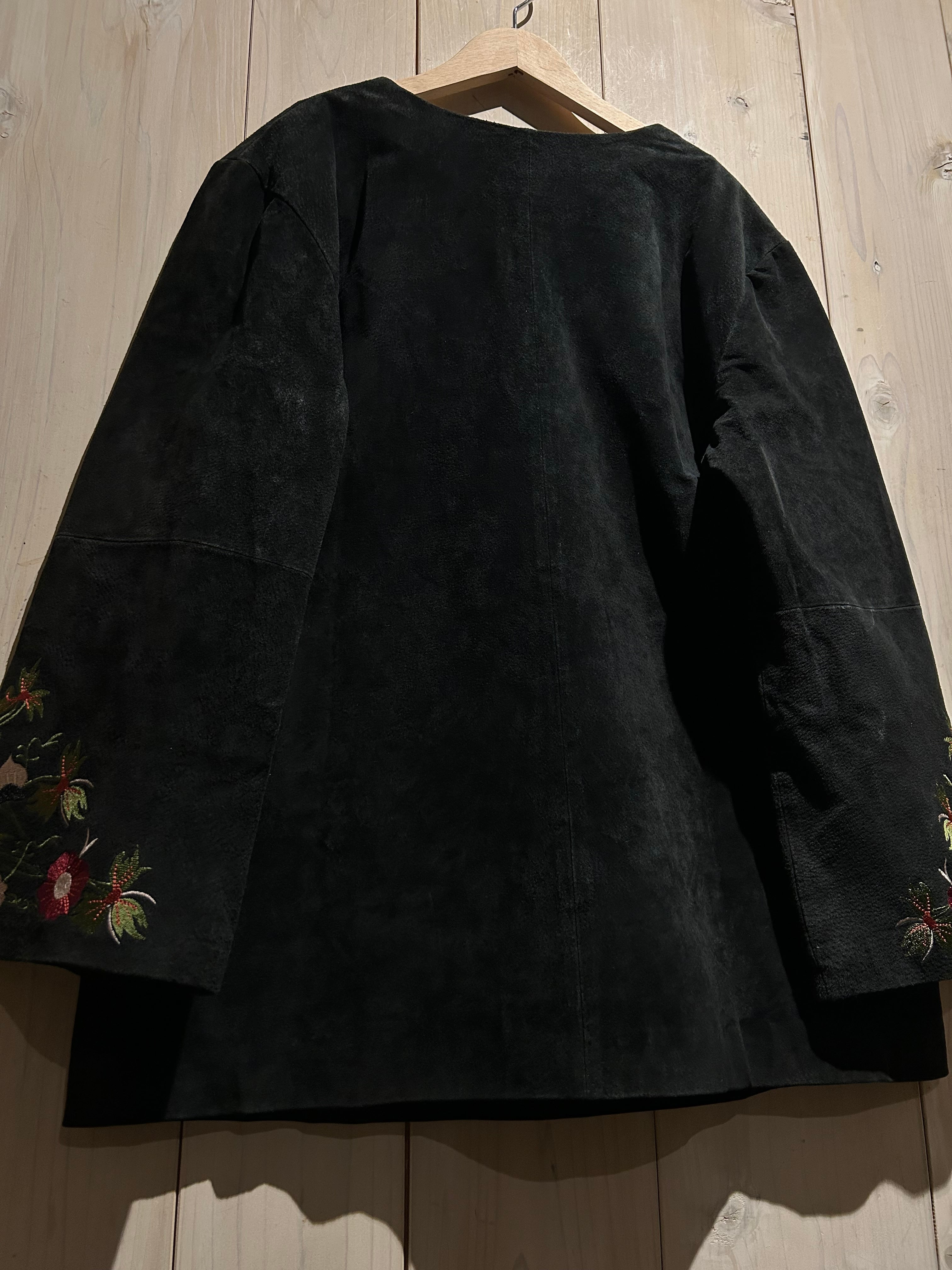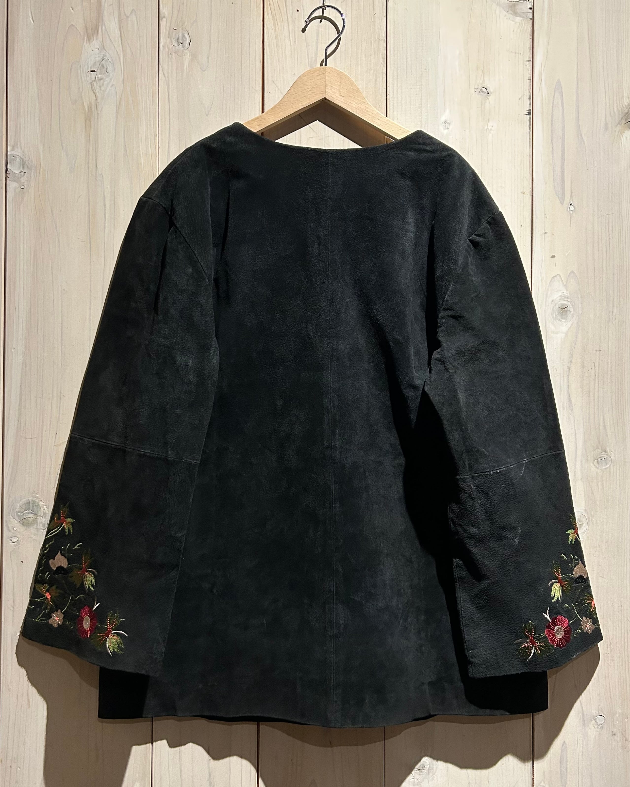 ブラックのスエードレザーをベースに、首周り、袖口、裾には美しく商品な雰囲気を漂わせる花柄を刻み込んたデザインの1着。アームも非常に太く、着用時の落ち感も素晴らしい。